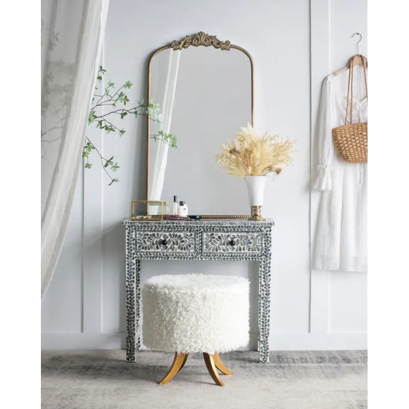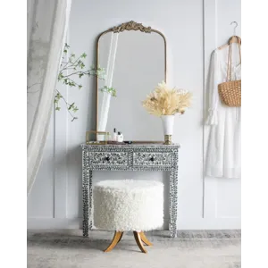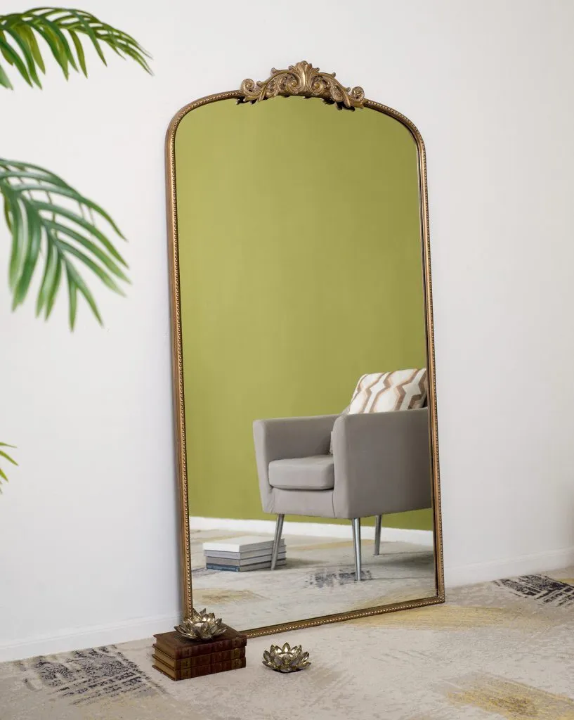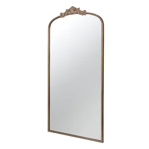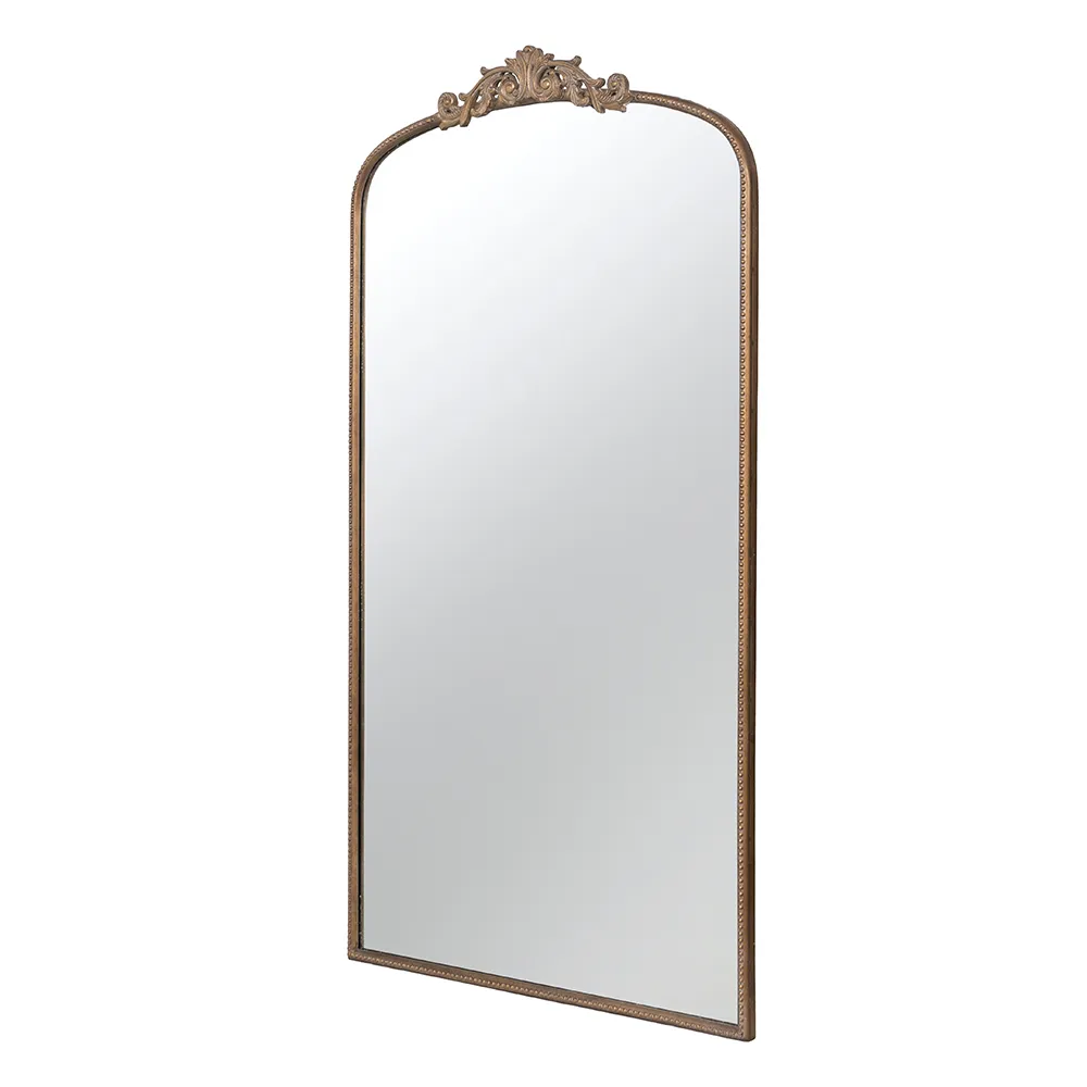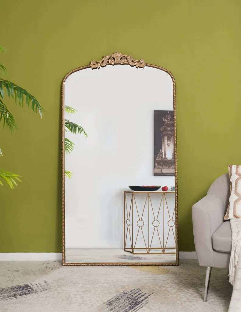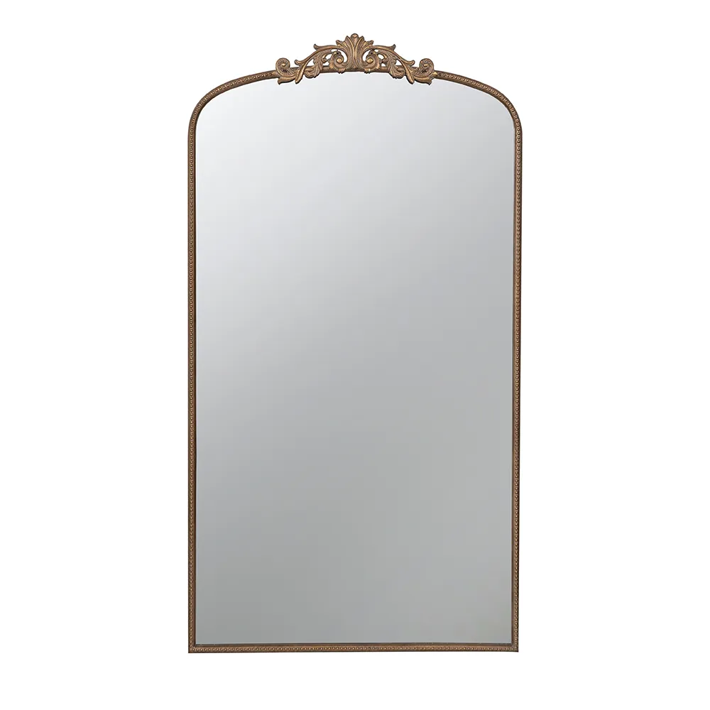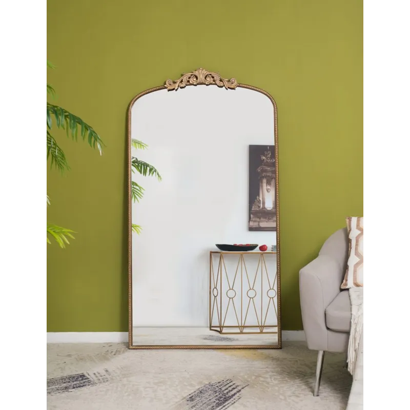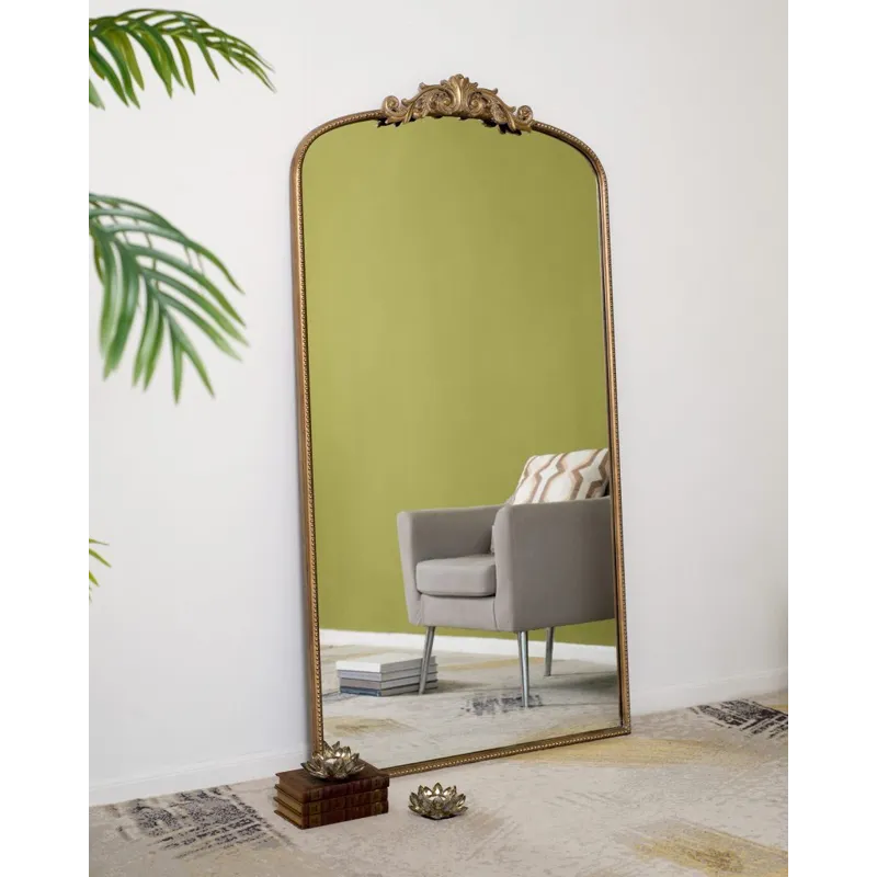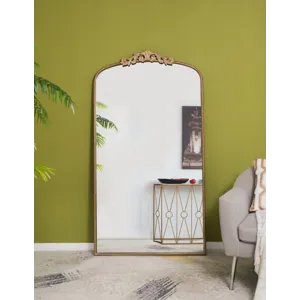 Boasting a grand arched silhouette, a smooth golden frame, and an intricately crafted regal adornment at the head, this full-length mirror blends classic baroque style with versatile function. Measuring a large 66H x 36W x 2D, it will capture your whole reflection with ease while also elevating the decor in your living room or bedroom.