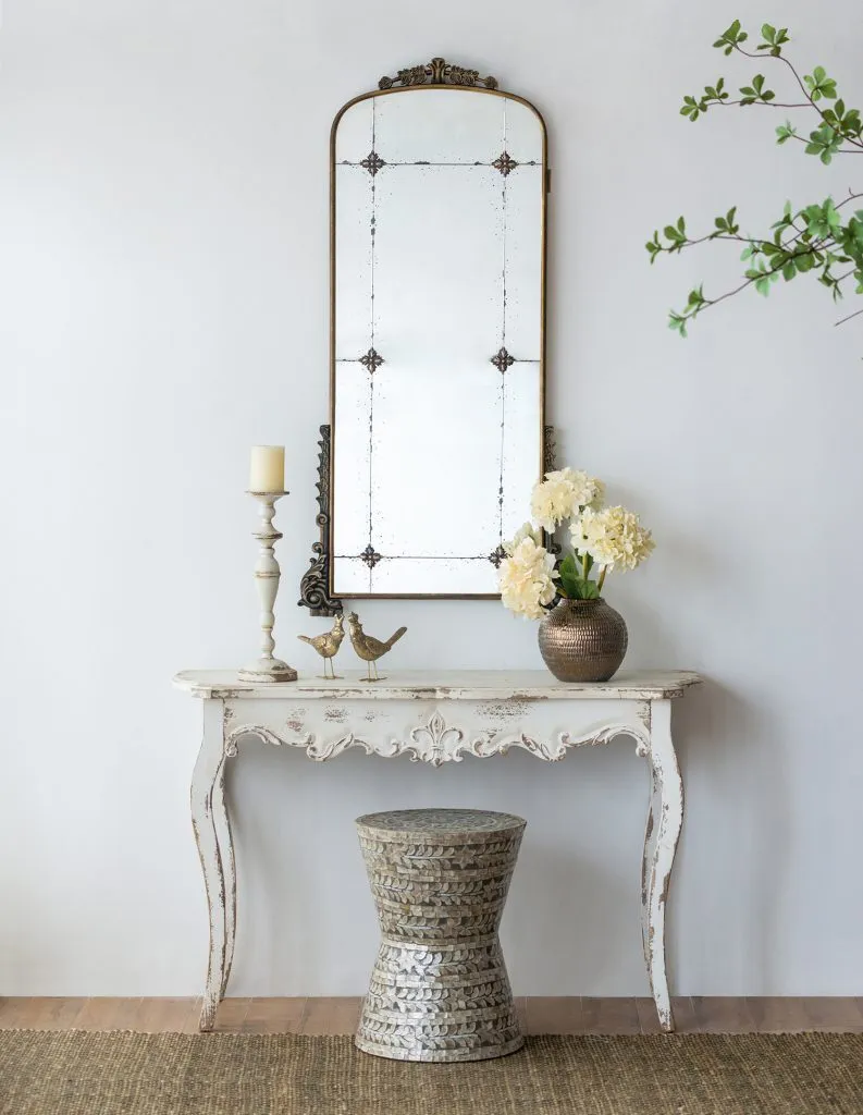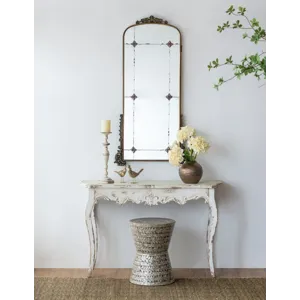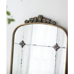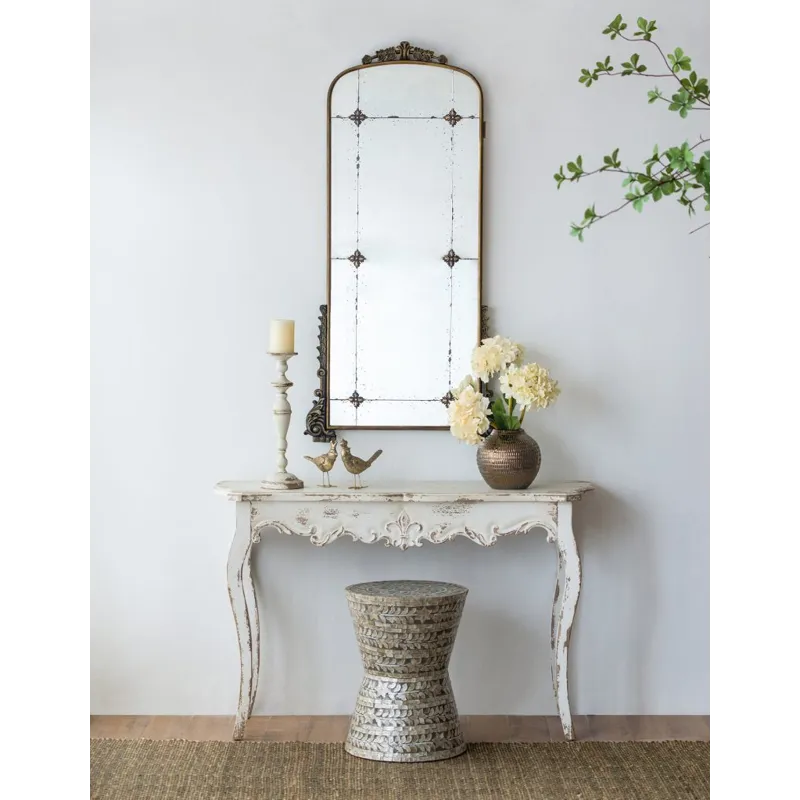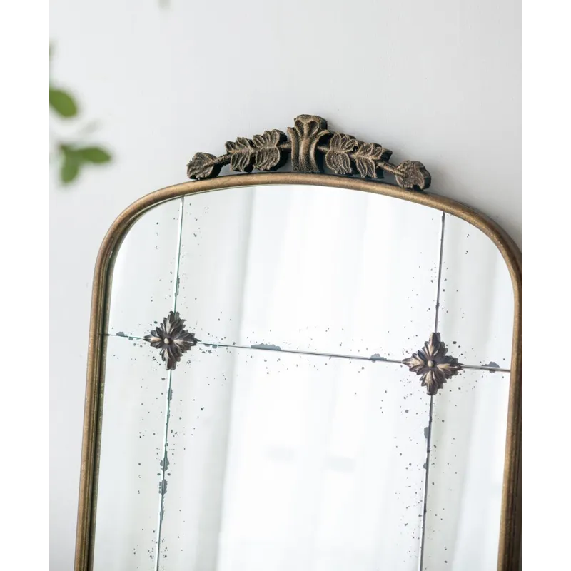 Drawing up inspiration from baroque styling, the Antique Gold Wall Mirror, brings the baroque decor to the 21st century. The 24×48.5″ mirror becomes modern day art leaning against a living room wall. The arch displays an intricate baroque design that flows throughout the mirror along the gold frame to an elegant base. Medallions along the seams of the antiqued glass complete the modern day look.