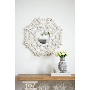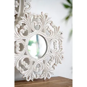 Featuring an intricate floral design, this stunning wall mirror adds a crisp, lavish look to any room. The impressive 23.5″ size ensures that this piece makes a dramatic statement in any room. Hang this sophisticated mirror in an airy sunroom, chic living room, or grand foyer for a touch of rustic elegance. Incorporate into a spacious gallery wall or hang alone to showcase its radiant beauty.