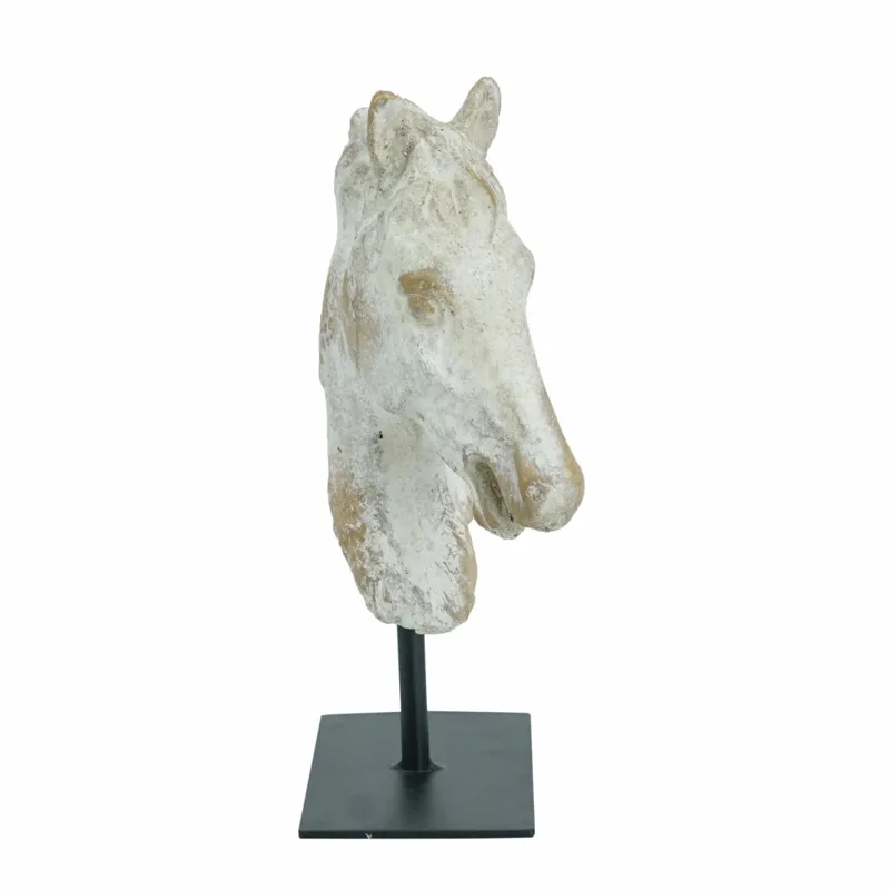 Masterfully crafted by skilled artisans, this decorative statue features an intricately detailed horse head, complete with a natural gray finish, occasional flashes of gold, and a sturdy black iron base for both stability and contrast. Whether it is displayed on its own or as part of a nature-inspired vignette, it is sure to infuse your home decor with a regal, commanding air.