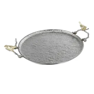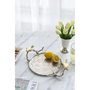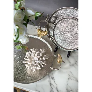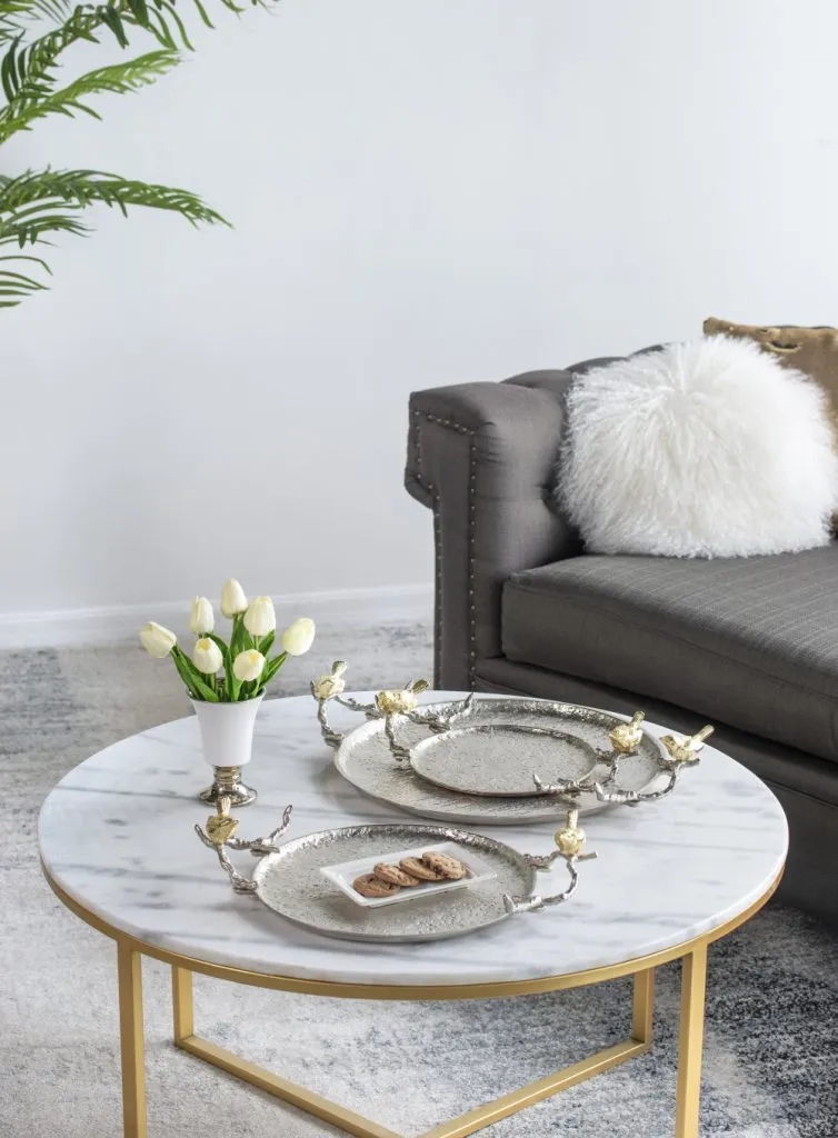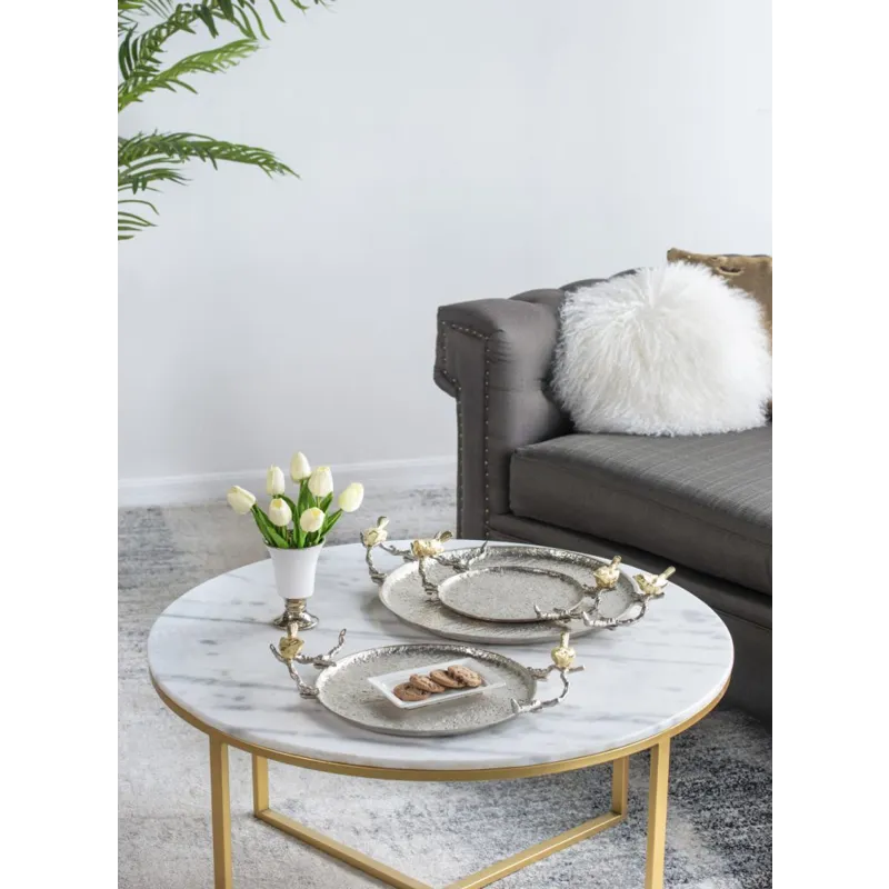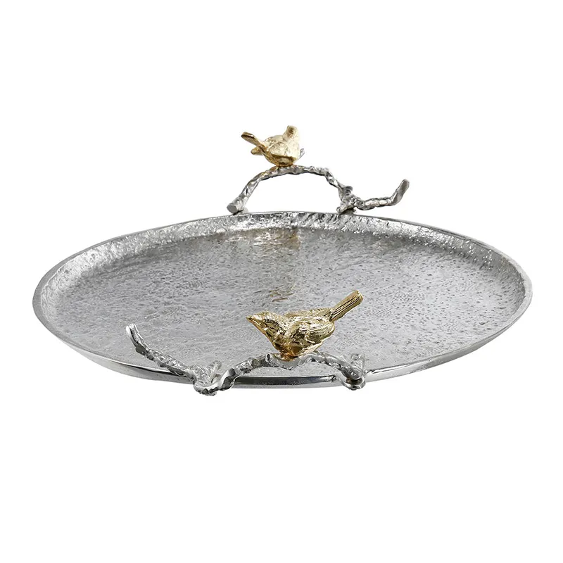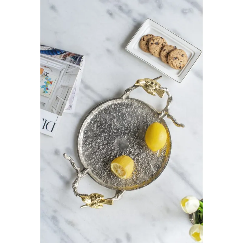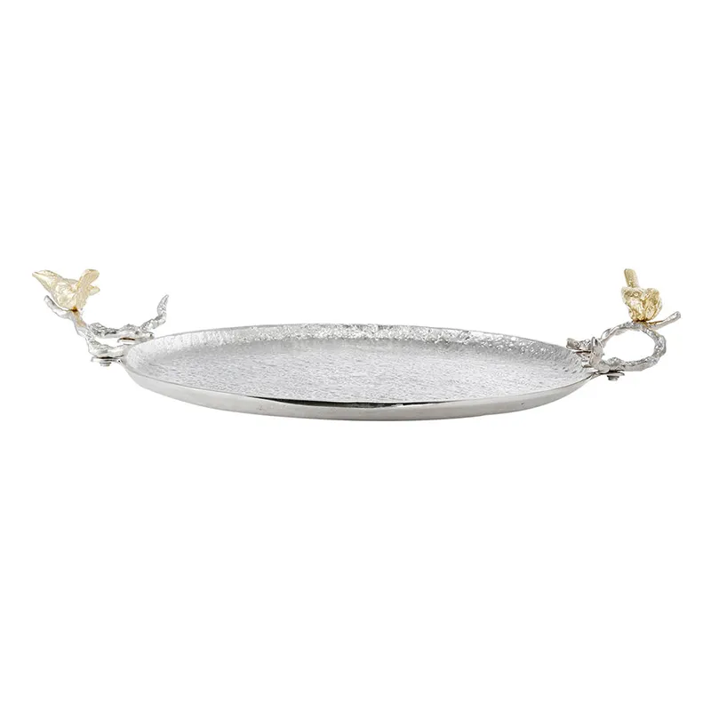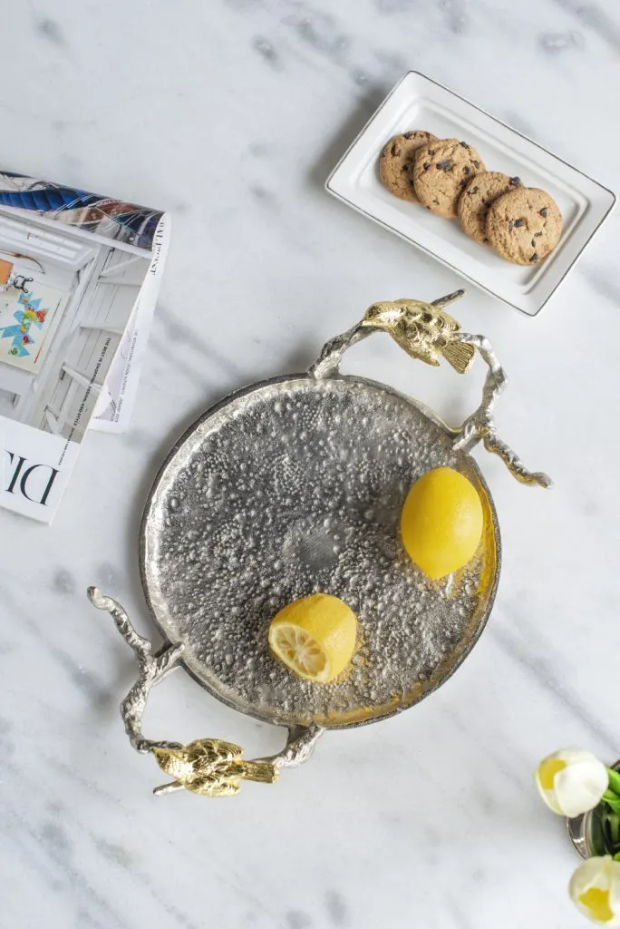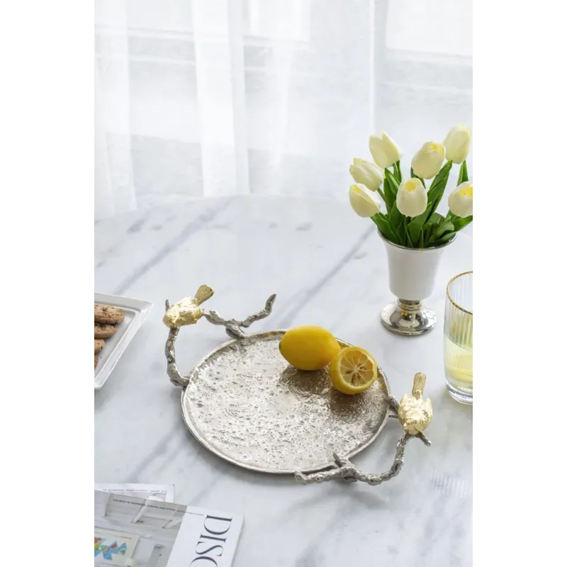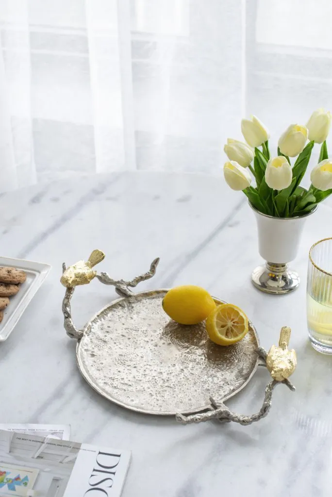 With two delicate, gold birds perched atop the handles of this silver tray, the large Alvada Decorative Tray adds a delightful charm to any room. Use to serve guests cocktails or display a glowing candle as you relish the tray’s gentle shine. The Alvada Tray makes a beautiful accent piece for an airy sunroom, crisp kitchen, or glamorous master bathroom.
