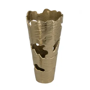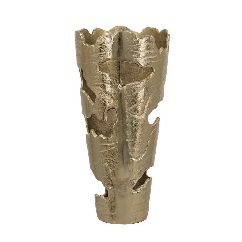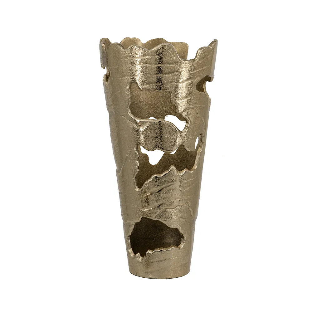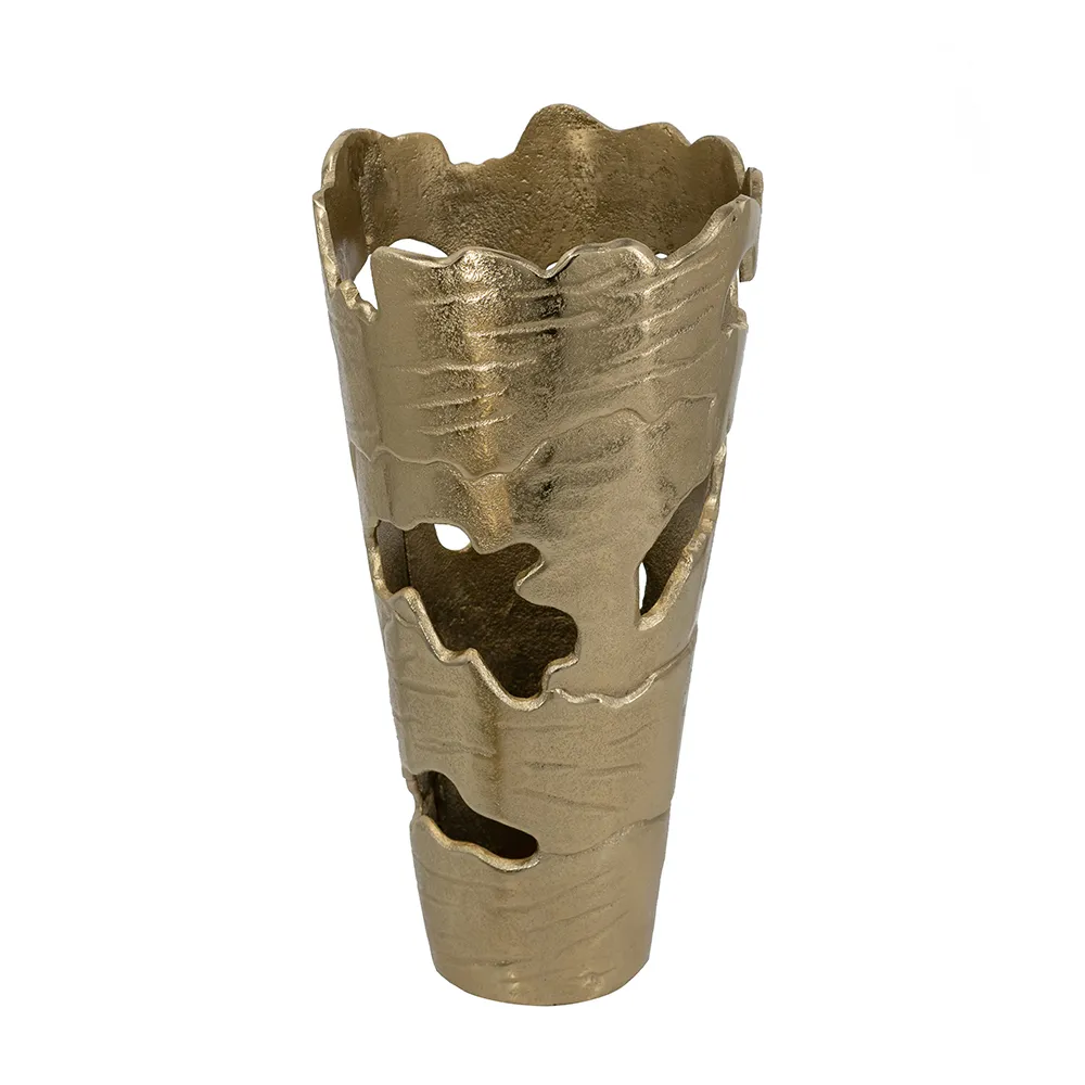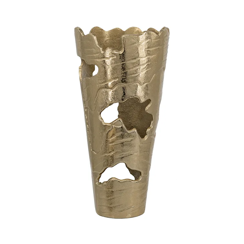 Capturing the effortless intrigue of raw design, this vase features organic cut-out patterns and an alluring gold ombre finish, creating a luxurious work of art. Whether displayed individually, as part of a rich ensemble, or paired with vibrant faux flowers, it will bring an instant touch of charm to any tabletop, counter, or shelf.