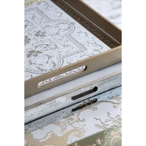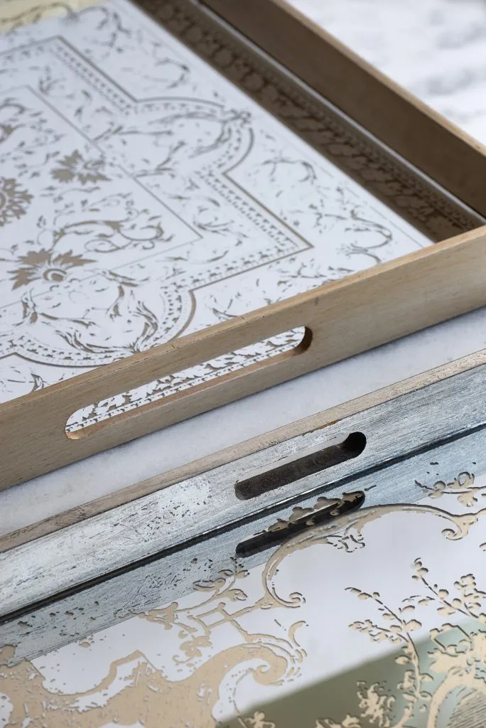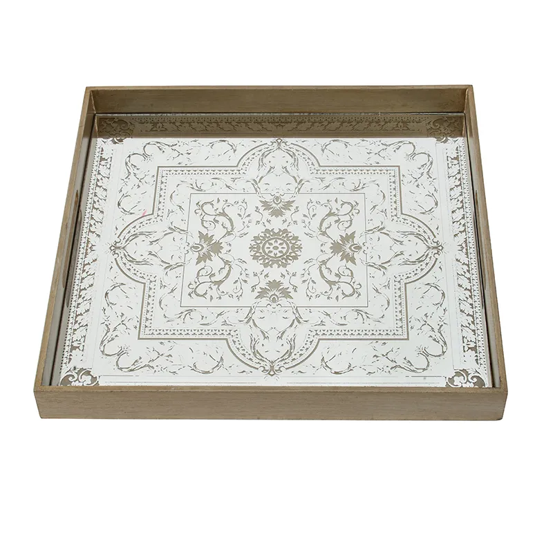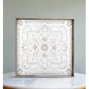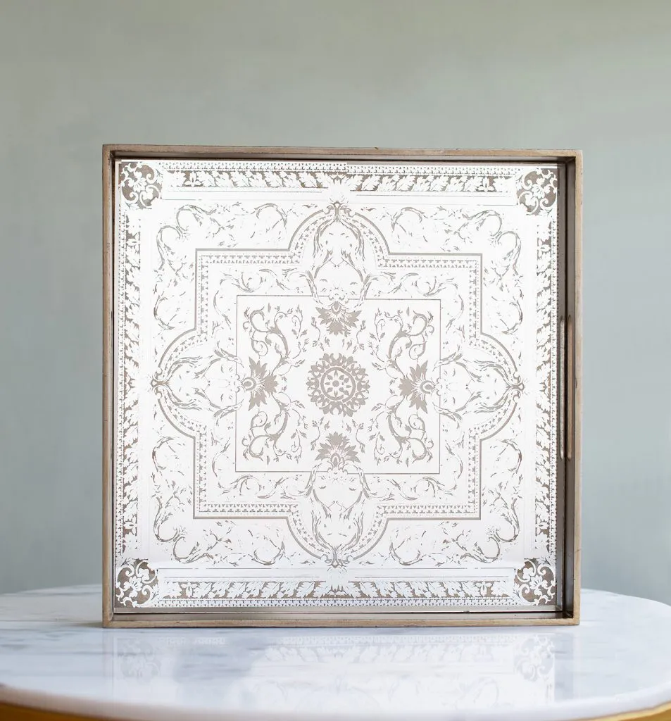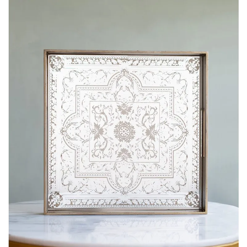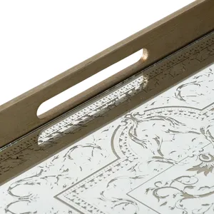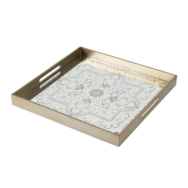 With its classic square silhouette, glamorous medallion motif, and warm gold frame, this mirrored tray brings a burst of vintage artistry to any tabletop, dresser, or console. Measuring 20 wide with convenient cut-out handles, it is perfect for serving drinks, showcasing potted plants, or organizing perfume and accessories on a vanity.