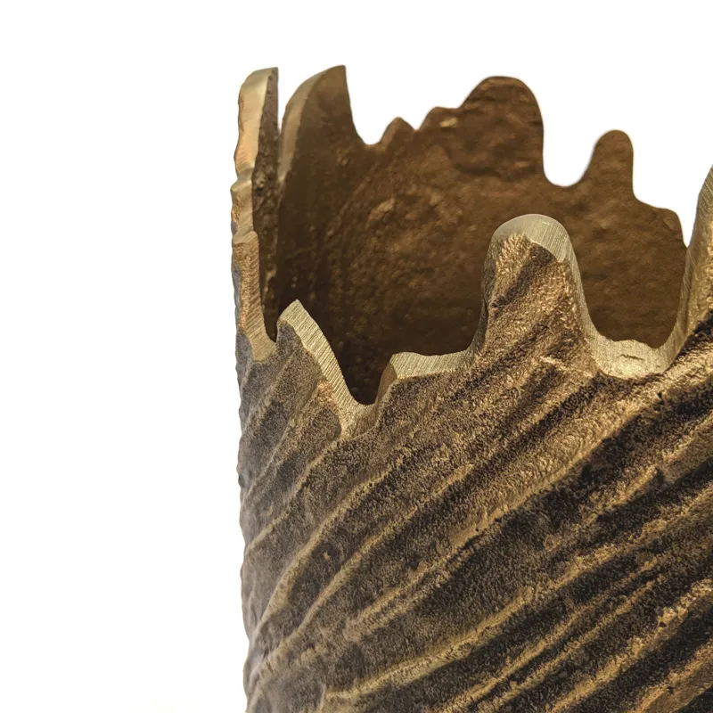 This vase large antique gold vase looks stunning on it's own or filled with a fresh floral arrangement. The textured surface and organic edge strikes a balance between trendy and timeless. Crafted from solid cast aluminum this quality vase elevates any decor to the next level