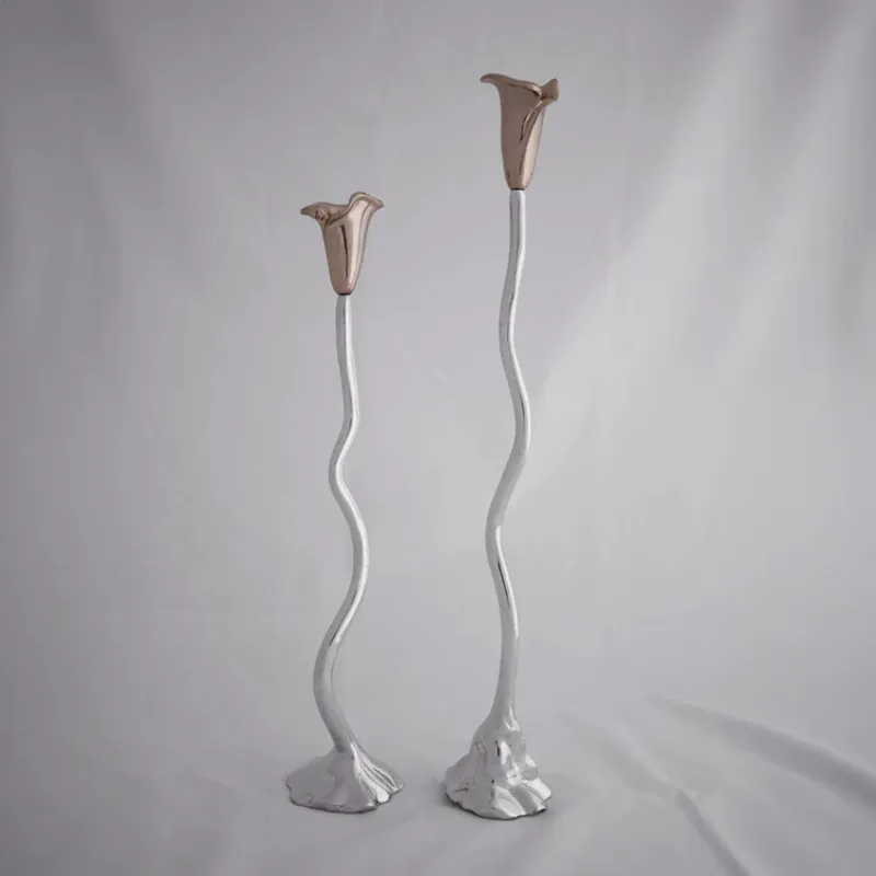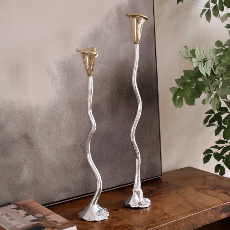 Garden inspired glamour! Beatriz Ball celebrates Garden Style with the luxurious GARDEN Tulip Candlestick Holder 19" with Gold Tulip. A masterpiece of metal sculpture, the shorter Tulip candlestick holder in our signature hand-polished metalware with gold-tone accents is distinguished by its naturalistic details, expert craftsmanship and stately proportions. Guaranteed to add a luxe look to any space, the candlestick holders can be topped with tapers in fun colors or displayed alone as sculptures. A great new addition to your home, pair with the taller version for an impactful presentation! Beatriz Ball’s intensely handmade products use eco-friendly and sustainable materials and are crafted by artisans who trace a heritage of metalworking for generations. Made of a top quality, easy-care aluminum alloy. Tarnish free!