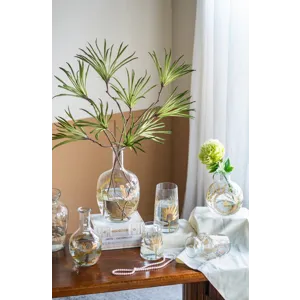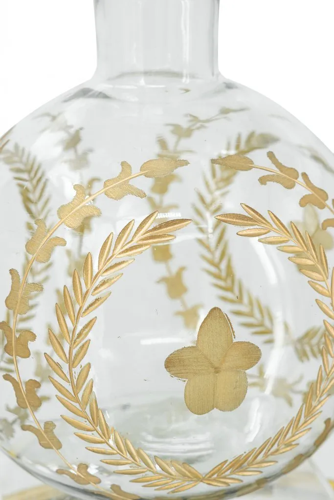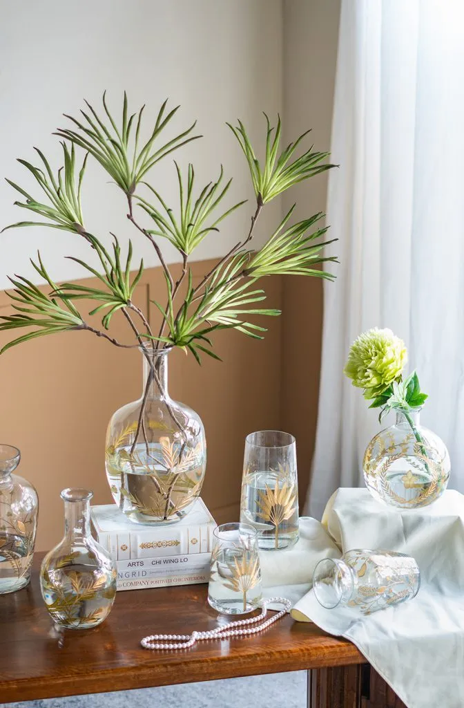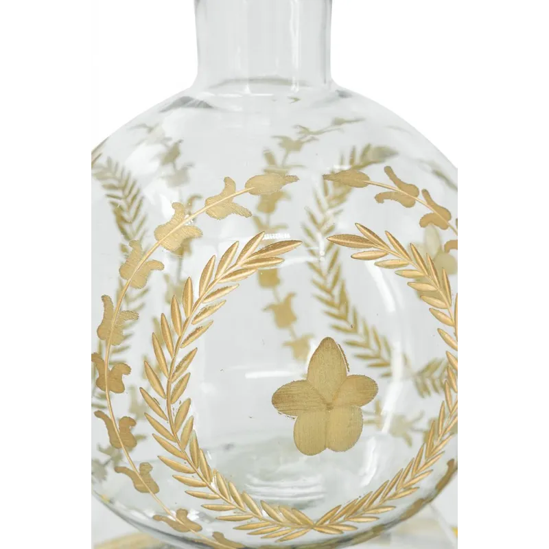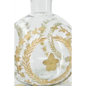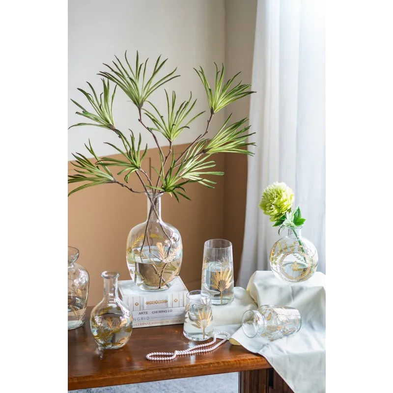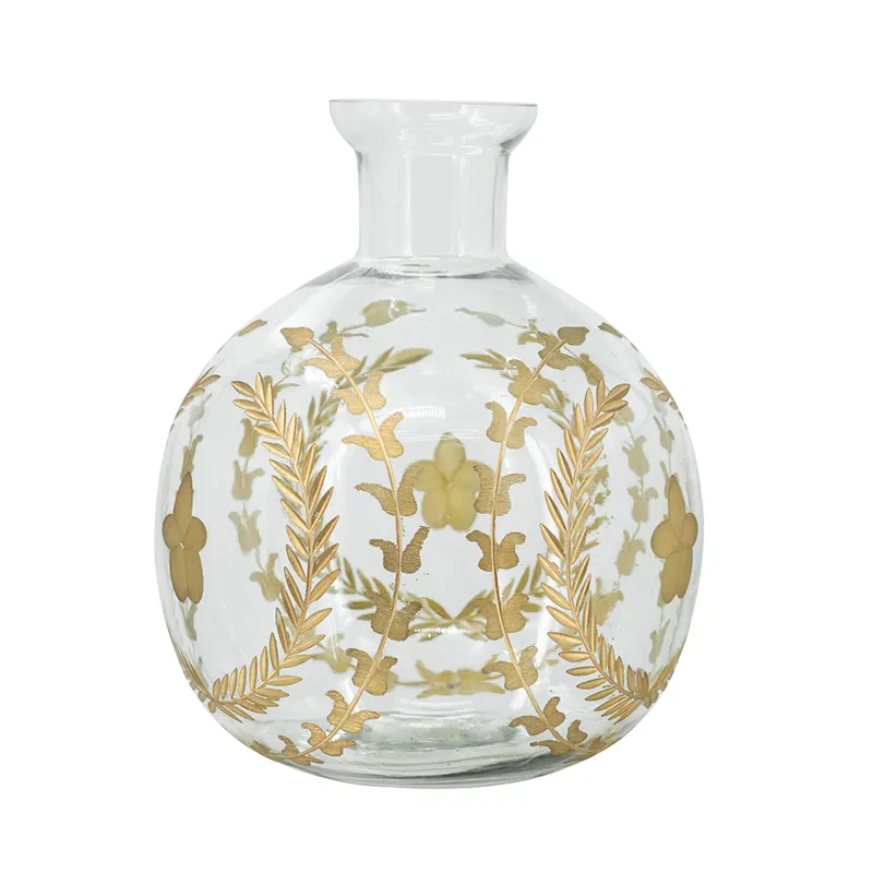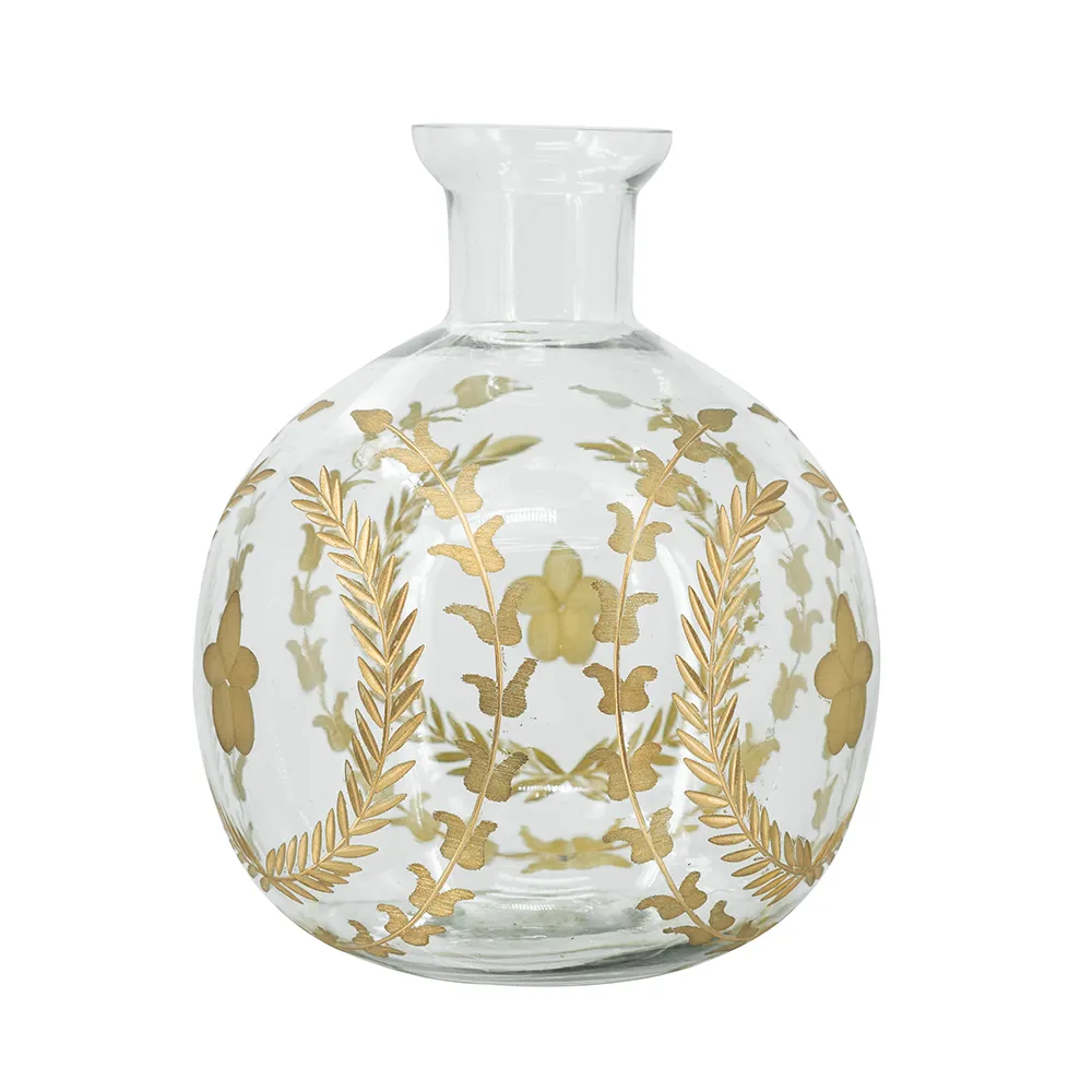 Marrying the graceful beauty of nature with the refined charm of classic designs, this decorative glass vase boasts a round, bulbous silhouette, complete with a fluted neck. A delicate series of gold leaf patterns adorn the surface, creating an artistic display that will elevate the decor in your living room, entryway, or office.