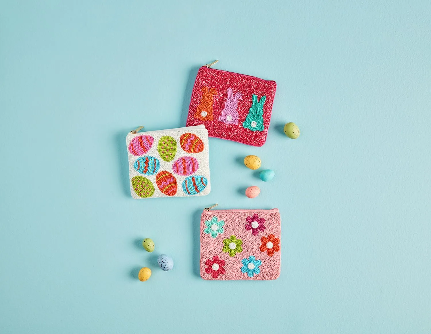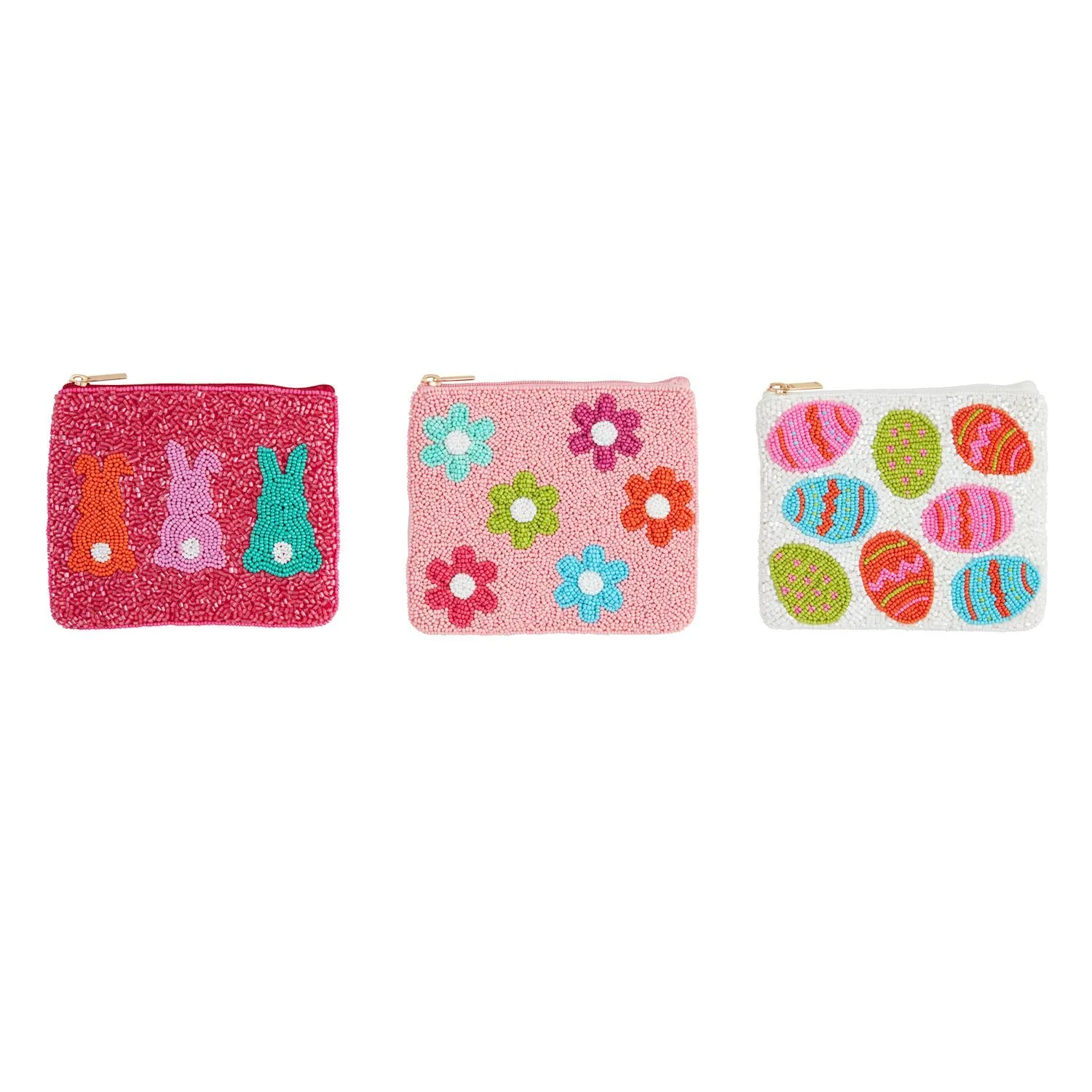 Lined cotton pouch with zipper closure features hand beaded exterior.