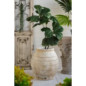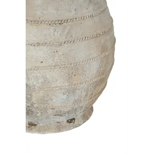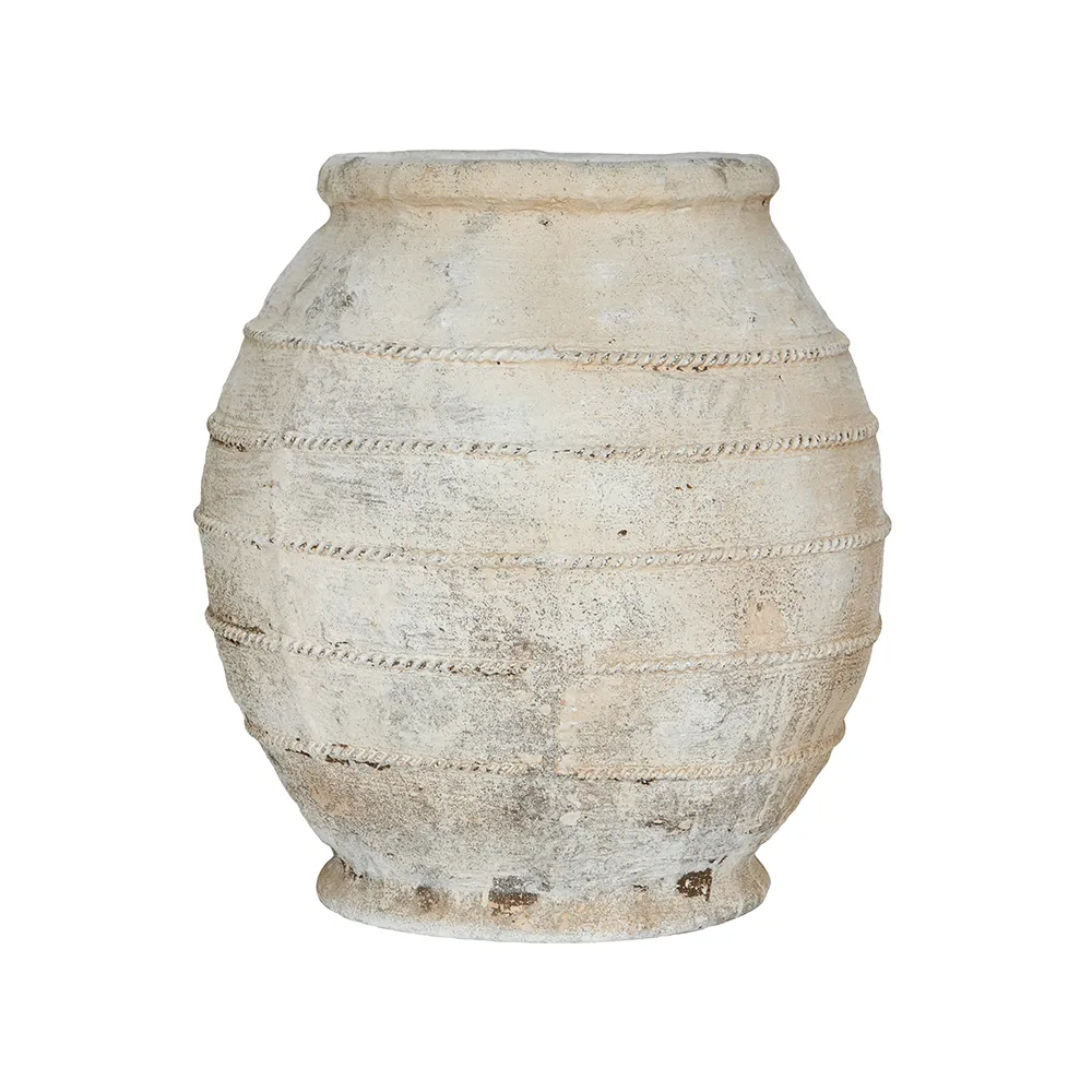 Drawing inspiration from the rugged beauty of ancient pottery, this decorative flower pot showcases a large, rounded silhouette, a distressed white finish, and a gently ridged texture. Perfectly sized for large plants or small trees, it will add a touch of earthy charm to your living room, entryway, or garden.