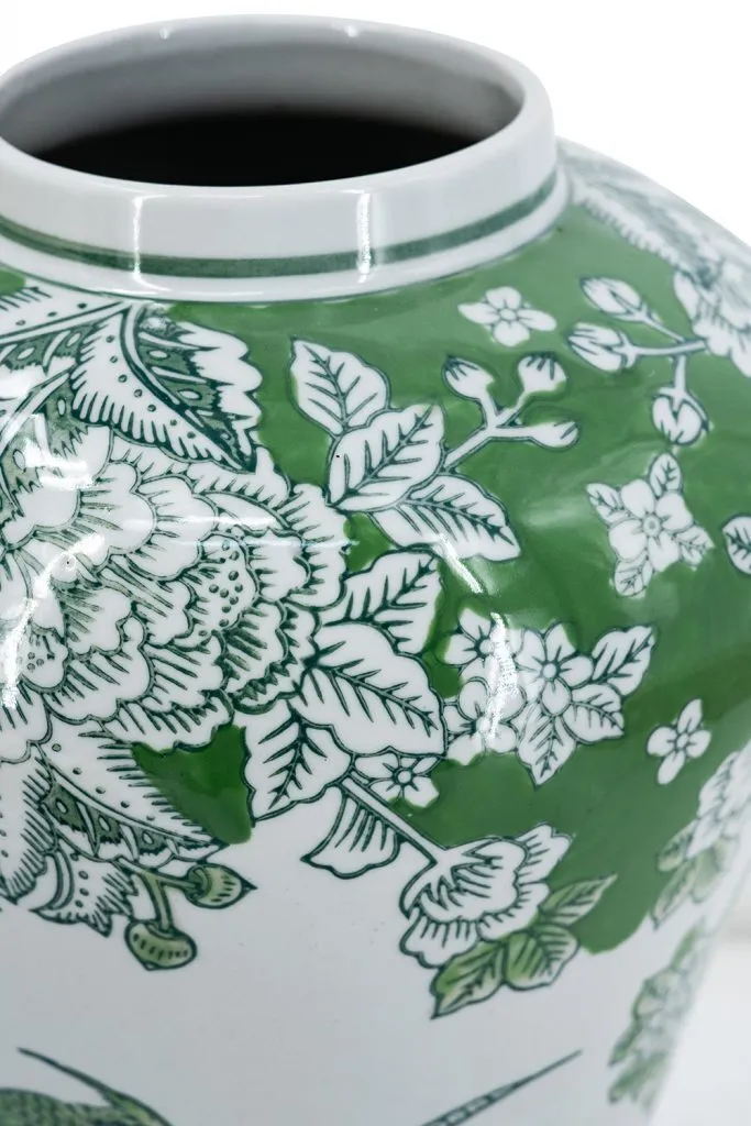 Drawing inspiration from classic Chinoiserie design, this vase features a wide, rounded silhouette, a slightly flared opening, and intricate green floral and bird motifs that stand out against a crisp white backdrop. Perfectly sized to be displayed alone or paired with a lush bouquet, it is sure to draw the eye from any tabletop, mantel, or sideboard.