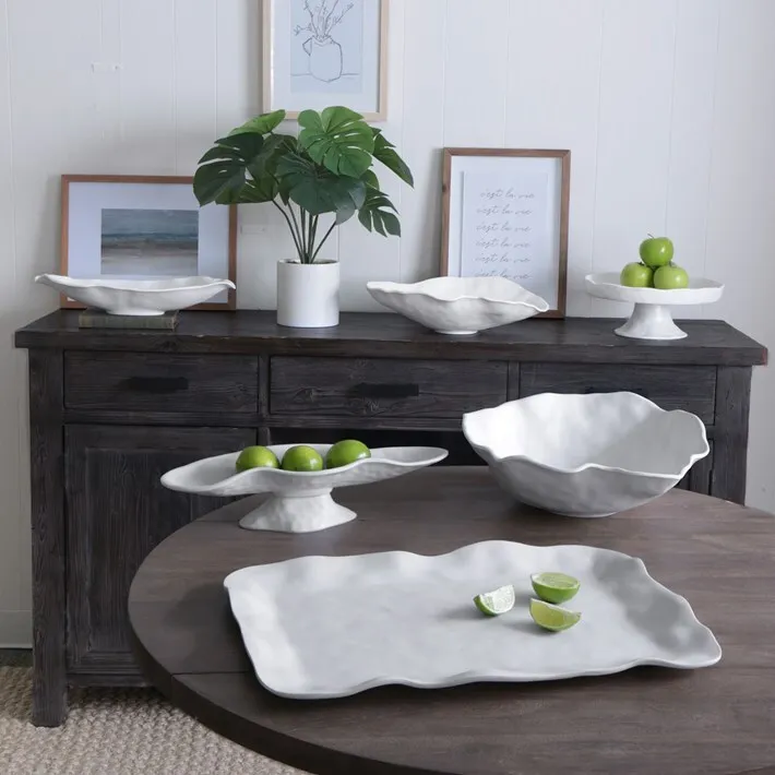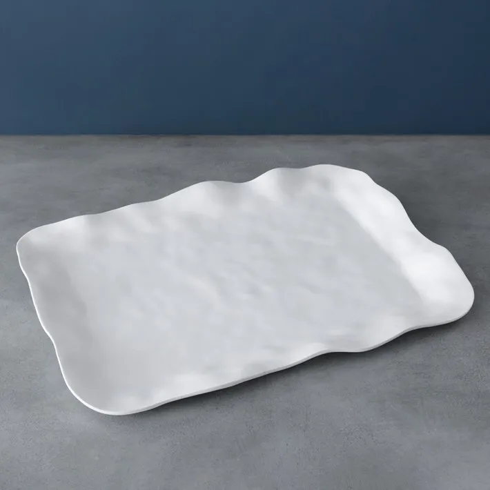 The fabulously functional VIDA Nube Collection features sculptural works of art rendered in a luscious white satin finish. Our offerings in Nube luxury melamine are extended with the addition of three new bowls, a cake plate, a rectangular tray, and a pedestal cracker tray that are as practical as they are beautiful. By popular demand... a generously sized Nube tray. The essence of "luxury melamine," VIDA Nube Extra Large Rectangular Tray is the answer to a variety of serving situations.