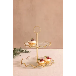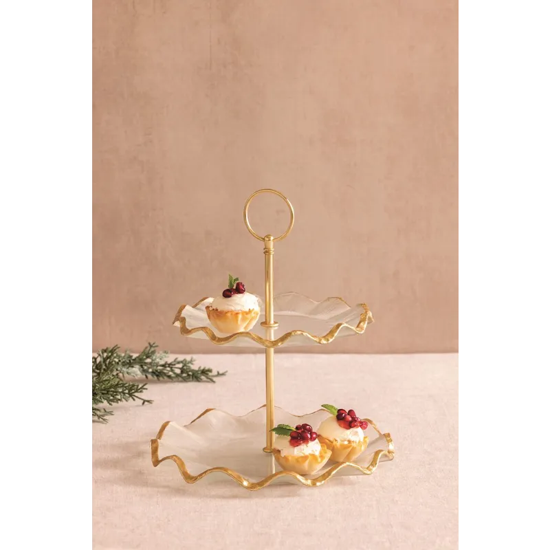 Two-tier glass tiered server features gold foiled textured ruffle edge and center gold foil metal dowel. Knocks down.