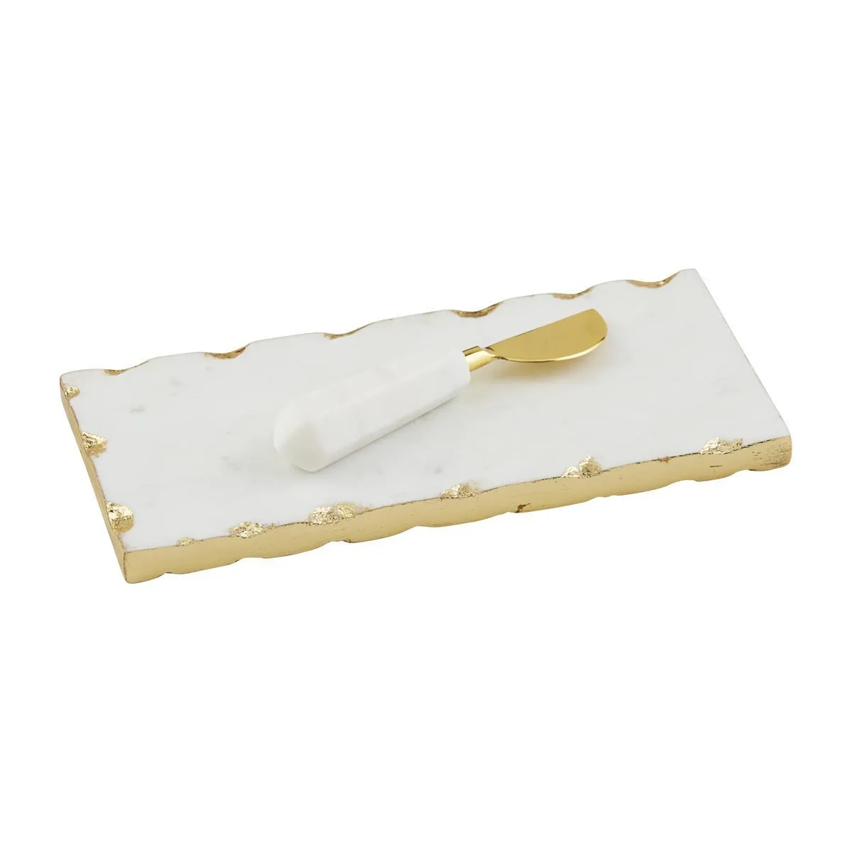 Marble serving board with gold foil raw edge. Comes with brass finished stainless steel spreader with marble handle.