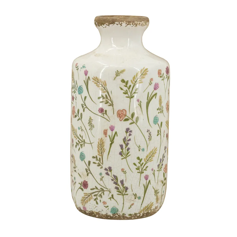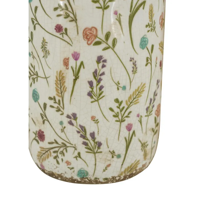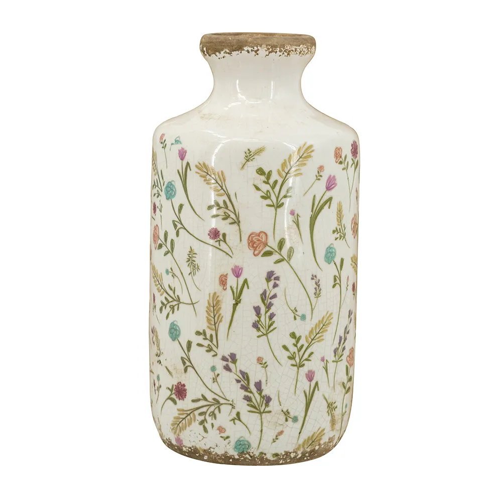 Featuring a tall, cylindrical silhouette, a weathered rim, and a delicate blend of flower motifs, this accent vase transforms classic design into an earthy work of art. Whether displayed individually, added to a nature-inspired vignette, or paired with vibrant blooms, it will elevate your decor from any tabletop, counter, or shelf.