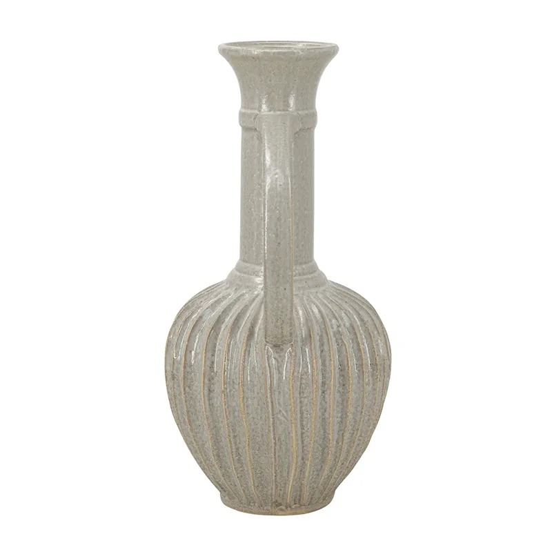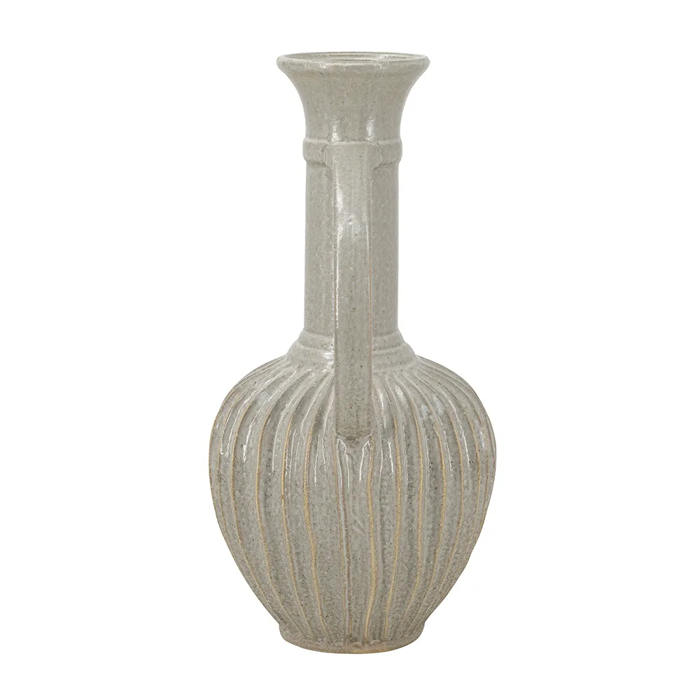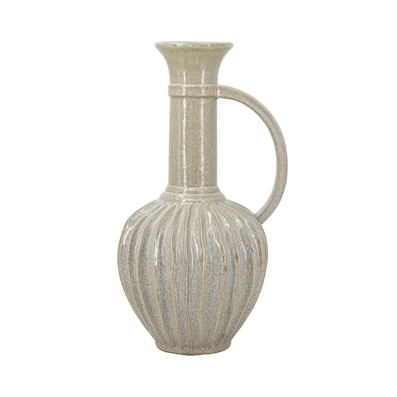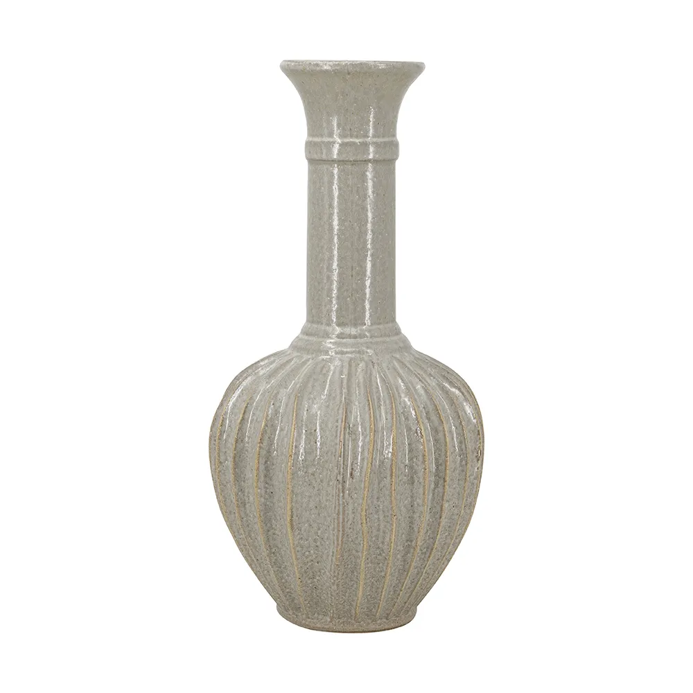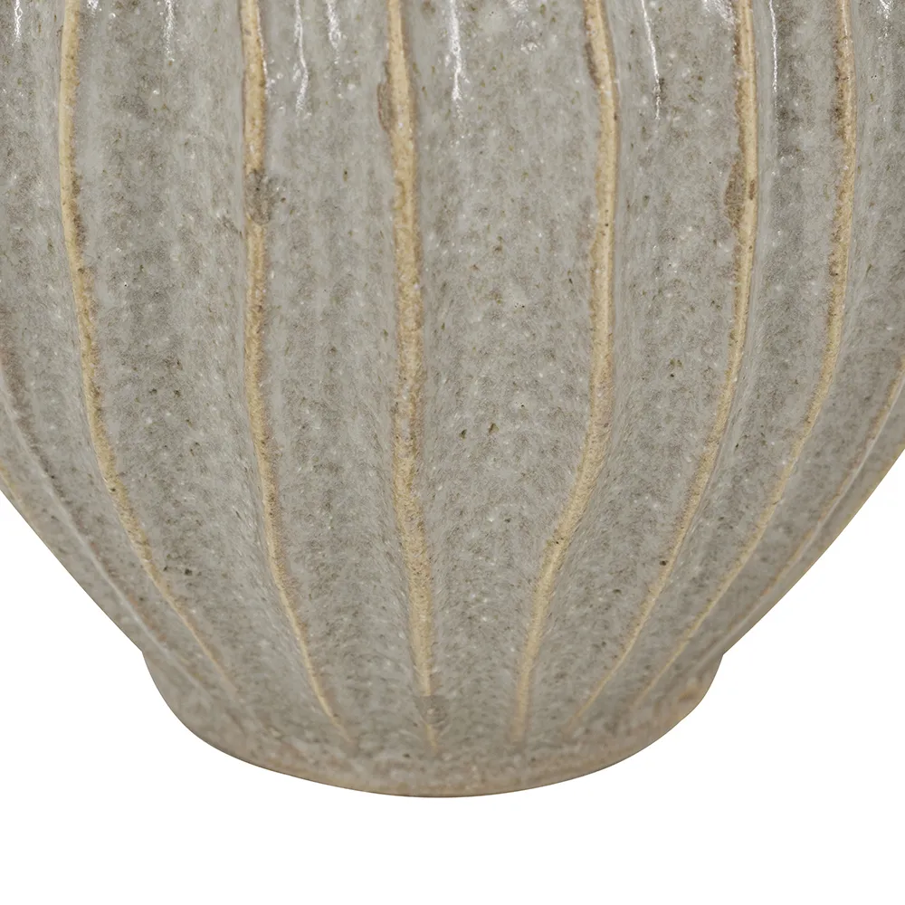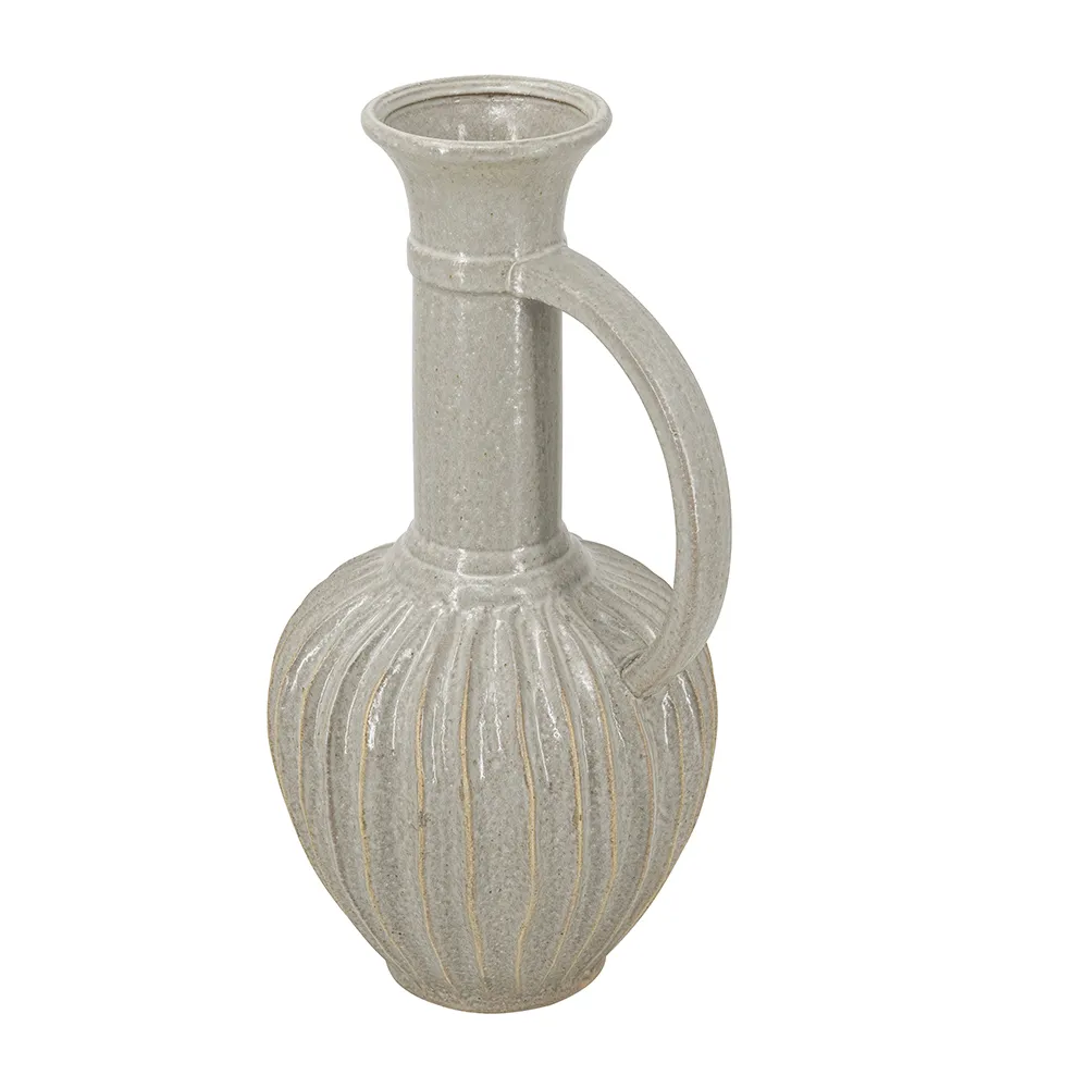 With its large, bulbous body, long neck, and artistic ridged design, this decorative ceramic jug masterfully combines classic and modern motifs. Finished in an understated gold, it will capture the eye as an empty display piece or as a creative vessel for long-stemmed florals.