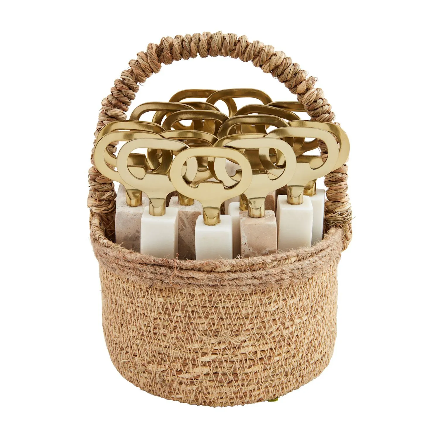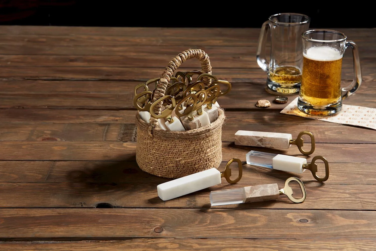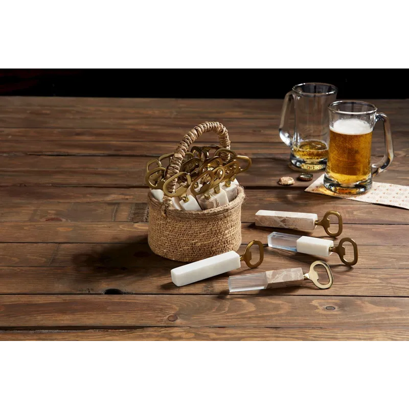 Brass finished metal bottle opener with marble or marble and resin handle.