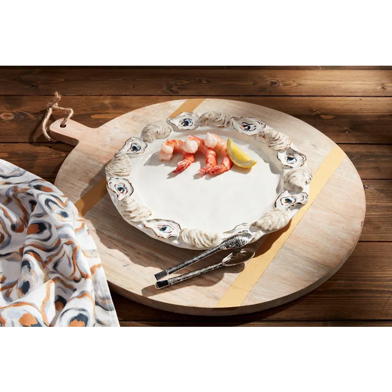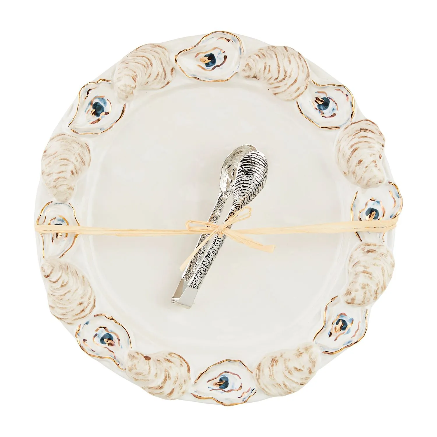 2-piece set. Stoneware platter features layered stoneware oyster shell rim. Comes with stainless steel oyster tongs.