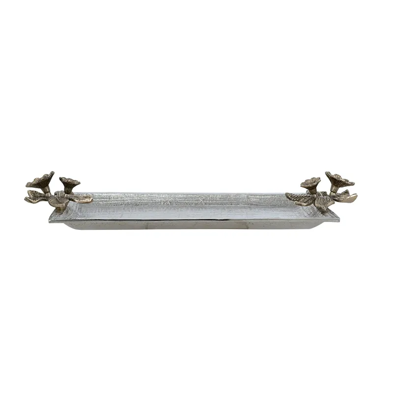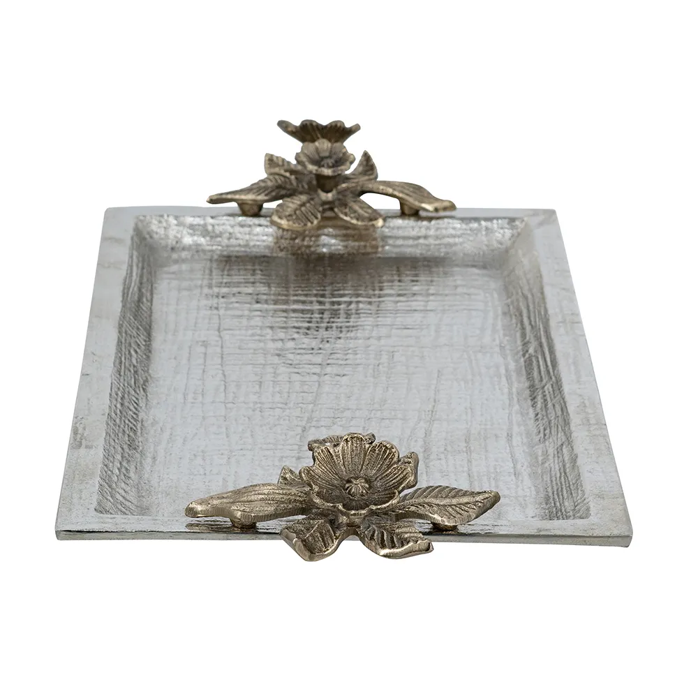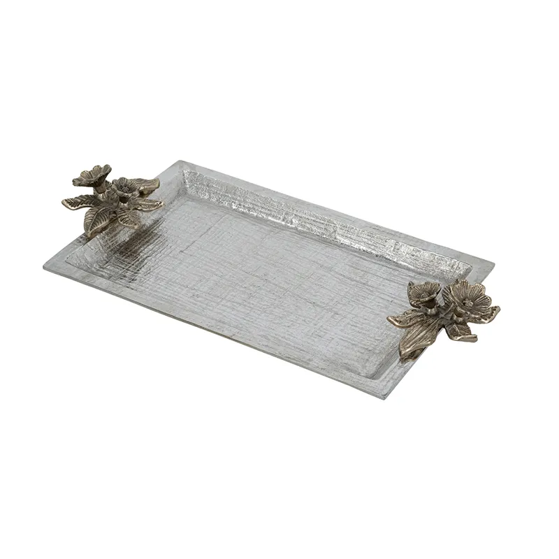 Marrying the intricate allure of nature with versatile function, this decorative tray features a spacious rectangular silhouette, a textured silver finish, and a pair of detailed gold flower blooms. Offering great versatility, it can be used to serve drinks, display a vibrant centerpiece, or organize your essentials with style.