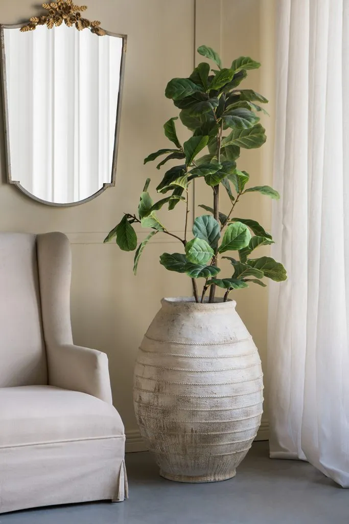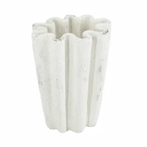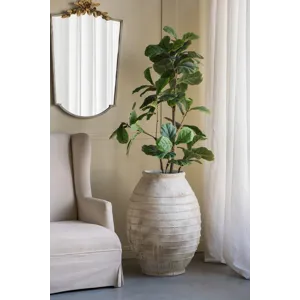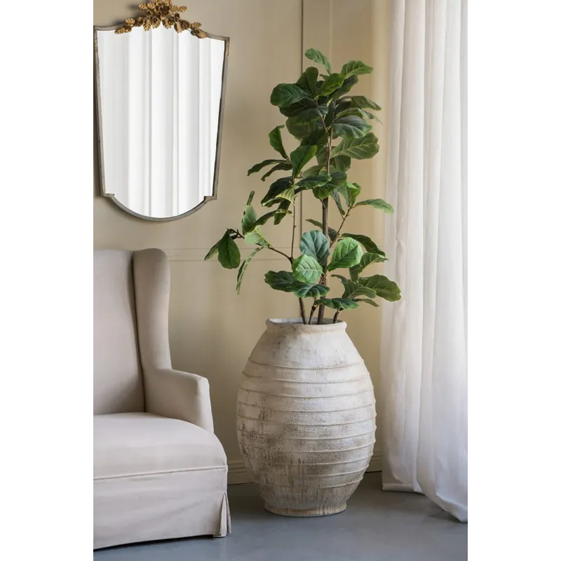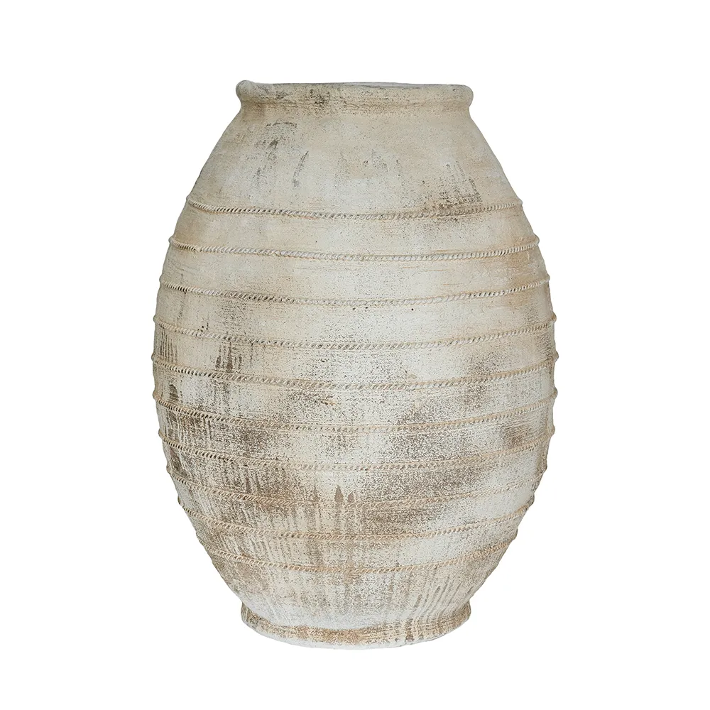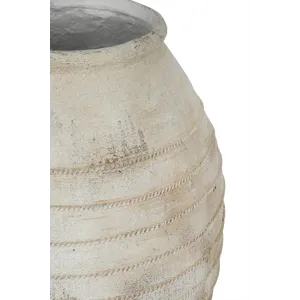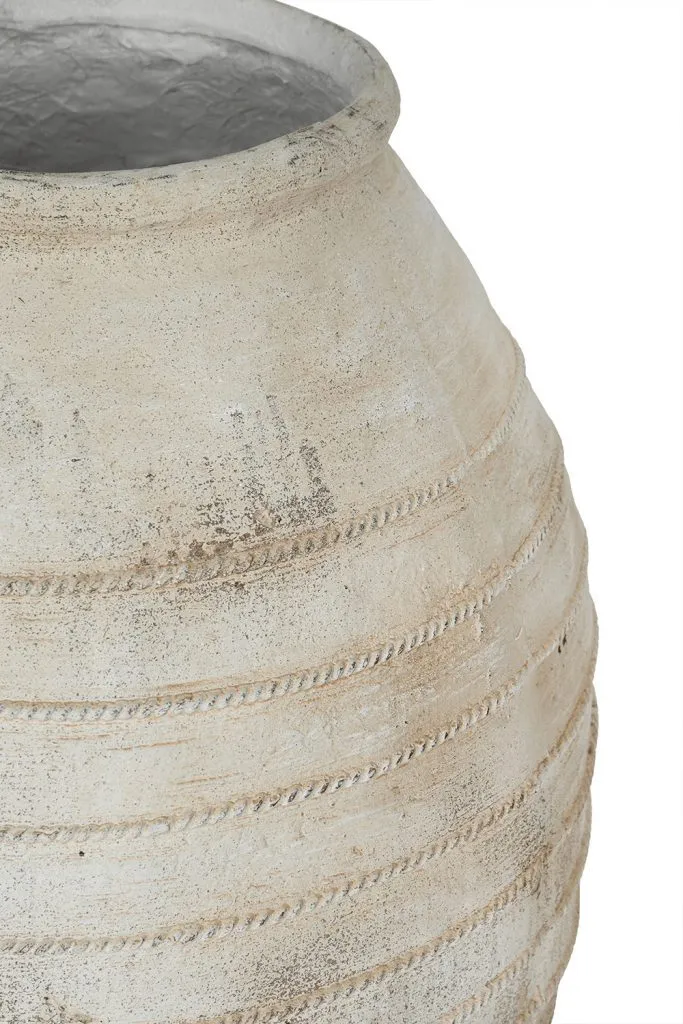 Drawing inspiration from the rugged beauty of ancient pottery, this decorative flower pot showcases a large, rounded silhouette, a distressed white finish, and a gently ridged texture. Perfectly sized for large plants or small trees, it will add a touch of earthy charm to your living room, entryway, or garden.