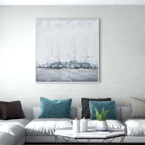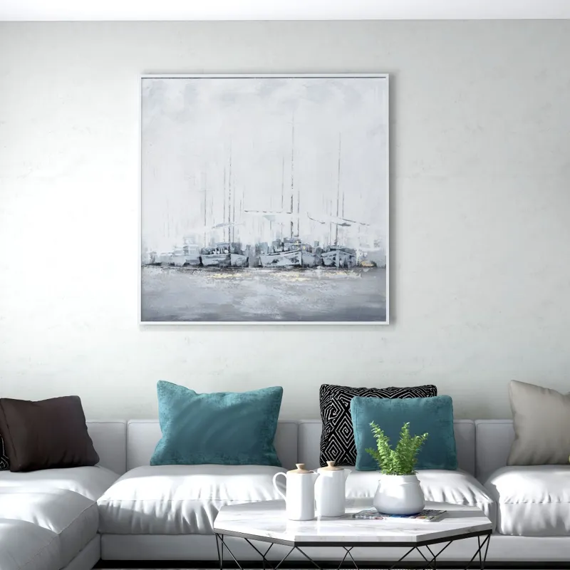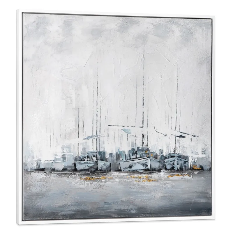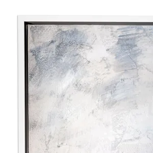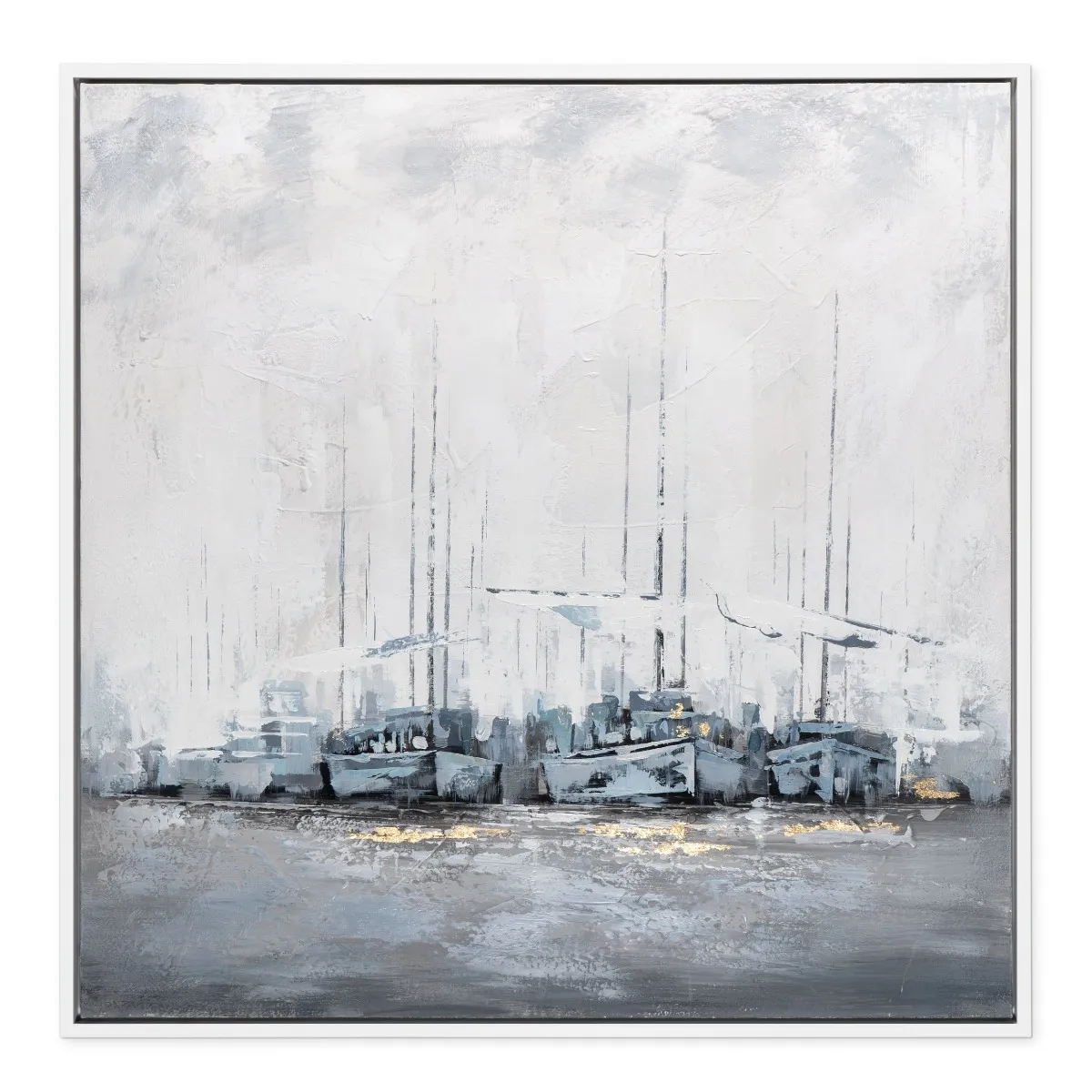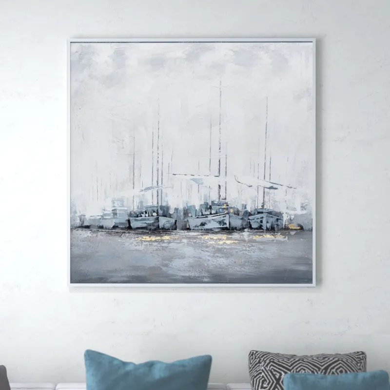 Give your space a nautical-inspired style with this large hand painted canvas. Featuring heavily textured brushwork with coastal grey and blue hues and finished in a crisp white floater frame it is the perfect addition to any bedroom, living room or office space