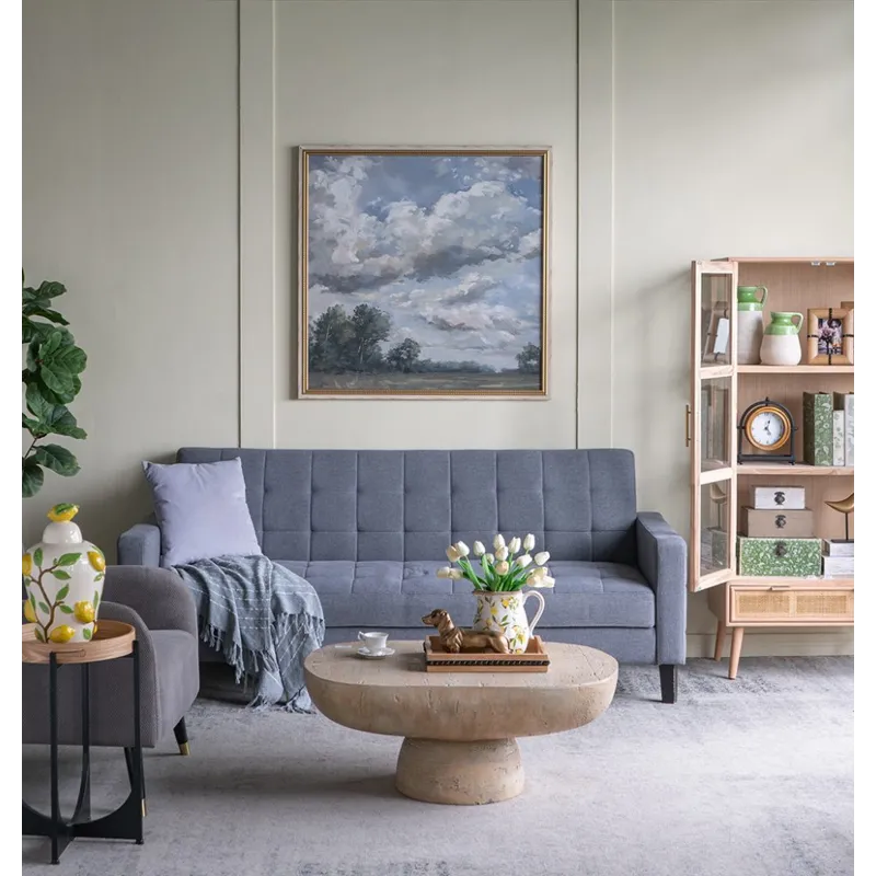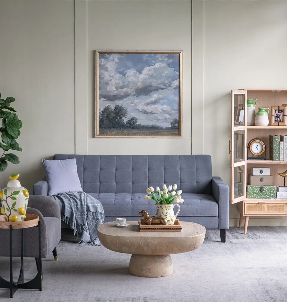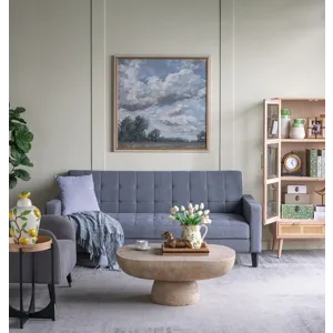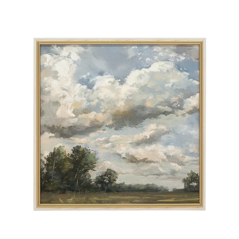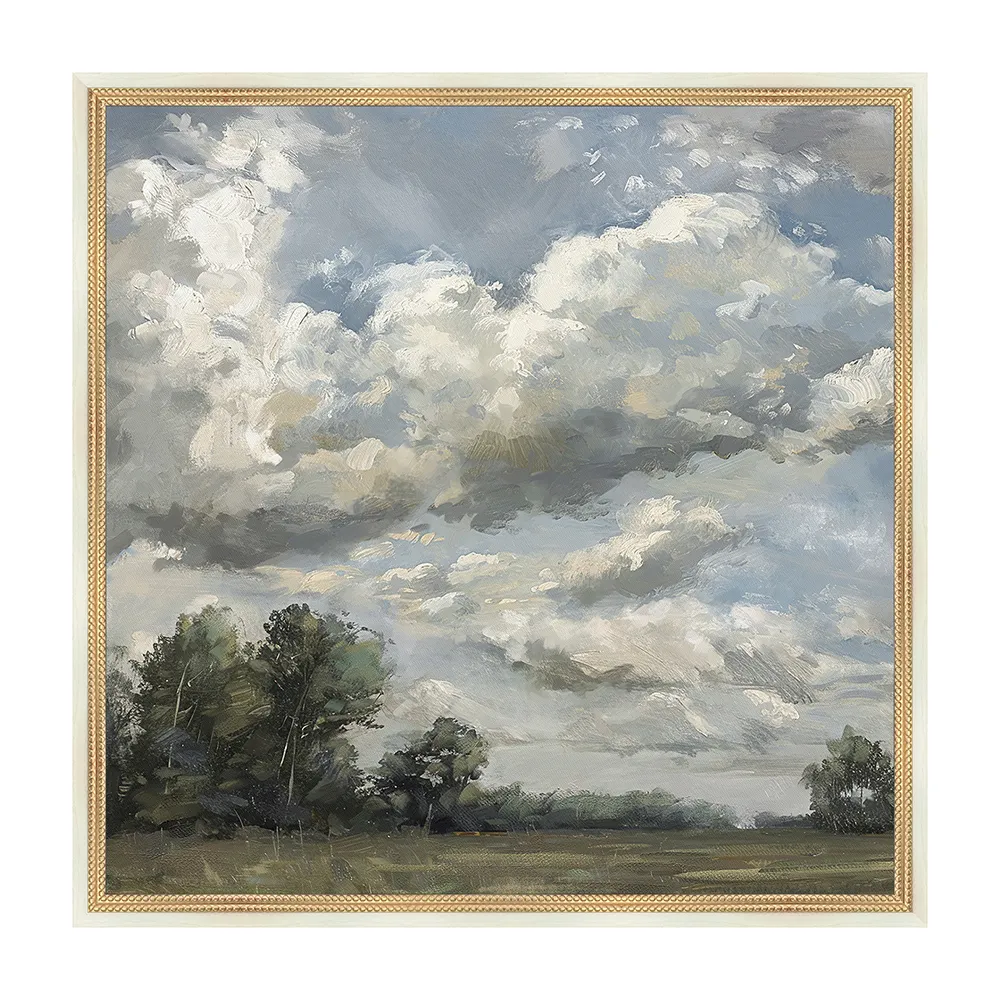 Capturing the serene beauty of a sprawling countryside, this canvas art features white, fluffy clouds, a tranquil blue sky, and scattered green trees, all framed in a light brown border. Perfectly sized to serve as a striking focal point, it will bring a burst of natural charm to any room in your home.