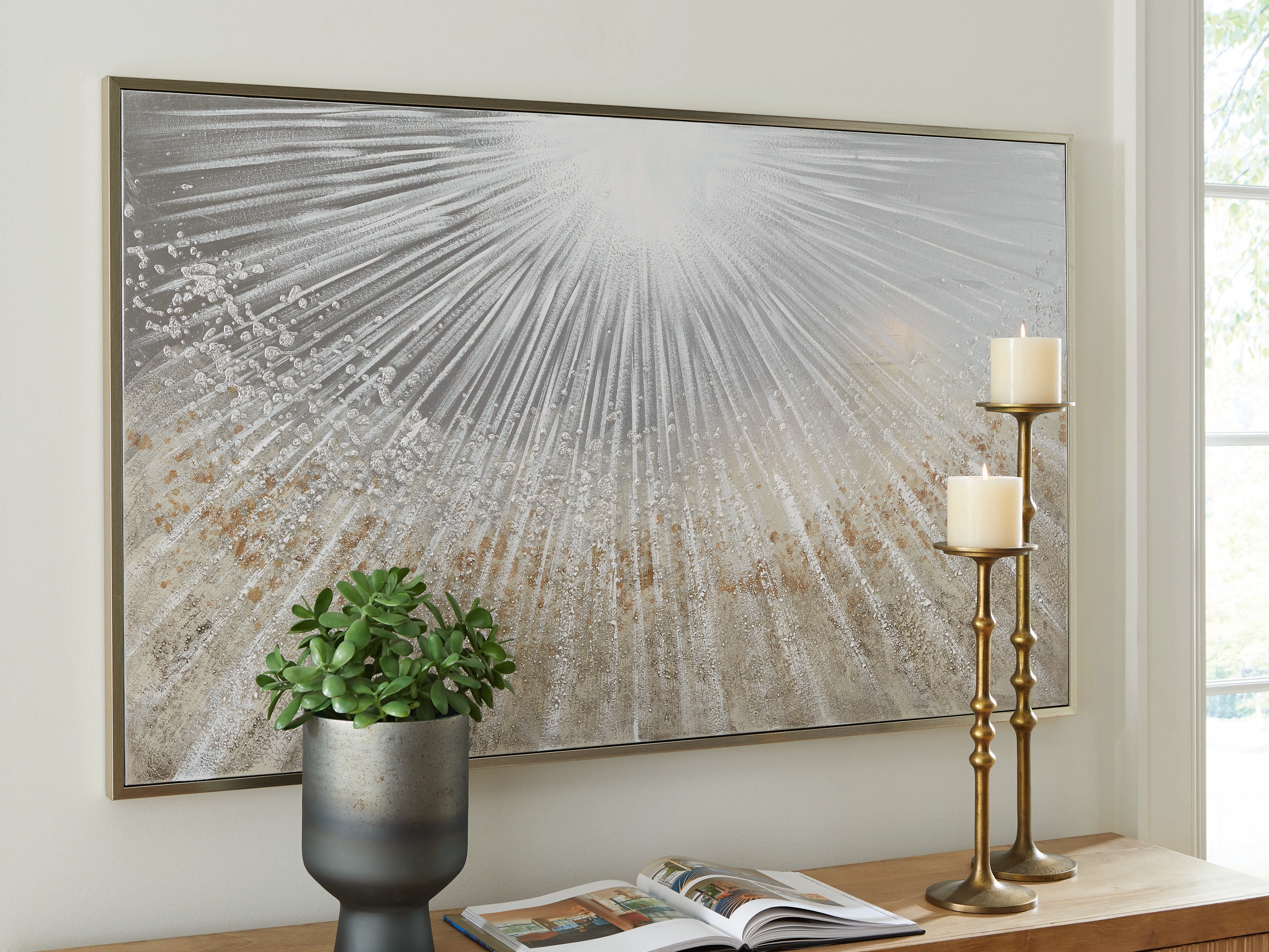 Brighten up your decor with this wall art. Its abstract design recalls the beauty of sunbeams peeking through the clouds, with gleaming metallic foil embellishments for added flair. A coordinating champagne-colored frame beautifully completes the piece.