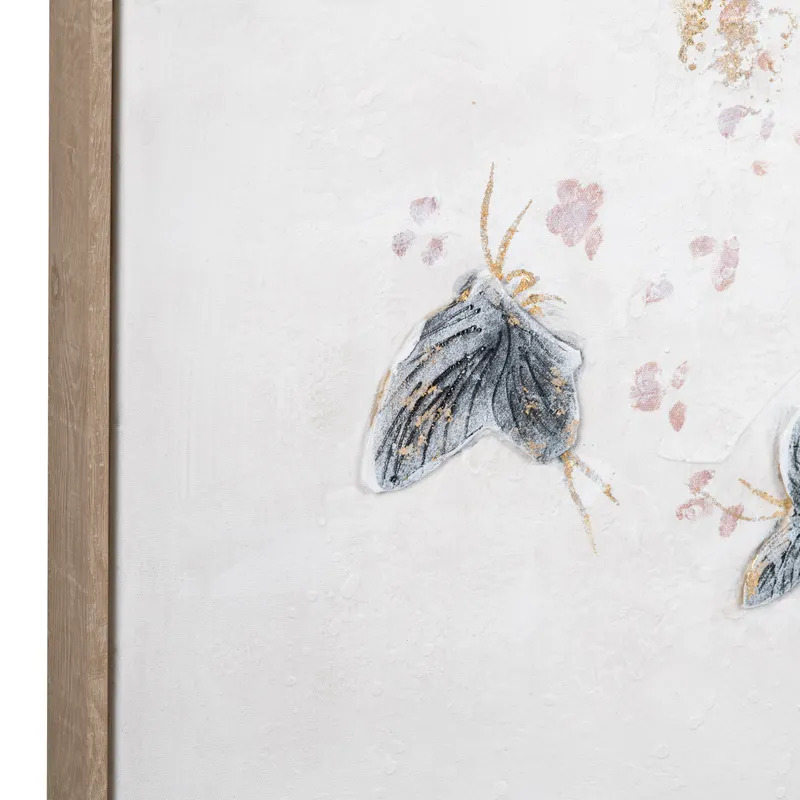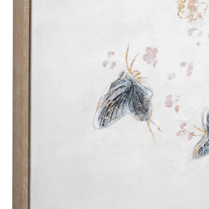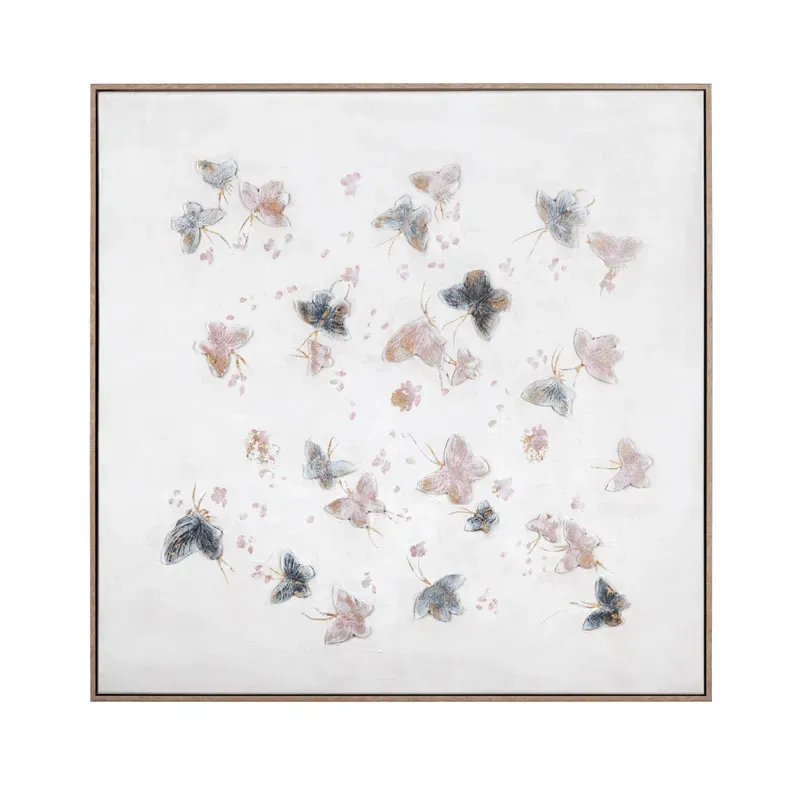 Breathe life and light-hearted beauty into your space with the Fluttering Grace wall art by Crestview Collection. Rendered on a square-shaped canvas, this enchanting piece captures the delicate dance of butterflies. Soft pastel hues of blush pink, misty blue, and gentle gray flutter across a muted cream backdrop, creating a dreamy visual harmony that soothes the eye while uplifting the spirit. Delicate accents of metallic gold foil are thoughtfully placed throughout the composition, catching the light with a gentle shimmer that adds elegance and depth to the overall design. Completing the piece is a natural wood frame that introduces a warm, organic element to the playful artwork. Whether displayed in a boho-themed bedroom, a hallway needing a gentle splash of color, or a cozy reading nook, this whimsical wall decor is sure to bring a joyful energy to any room it inhabits.