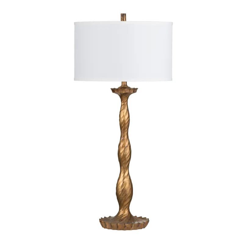 Reminiscent of old-world candlesticks the Crestview Collection Amherst Table Lamp is made from cast resin and boasts a multi-step antiqued gold finish. The ivory linen shade features an interesting baffled detail to diffuse the light creating a soft, warm glow.