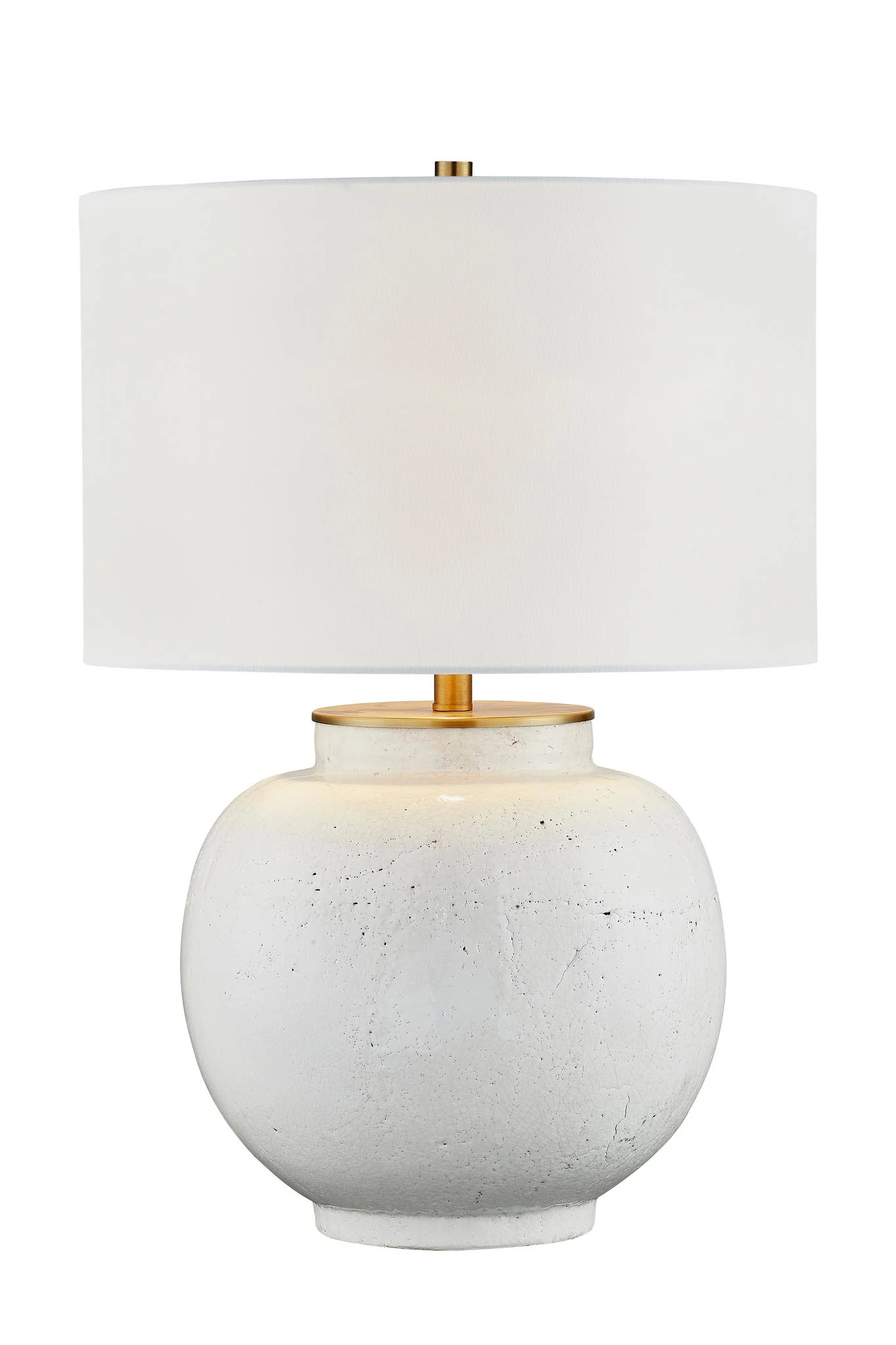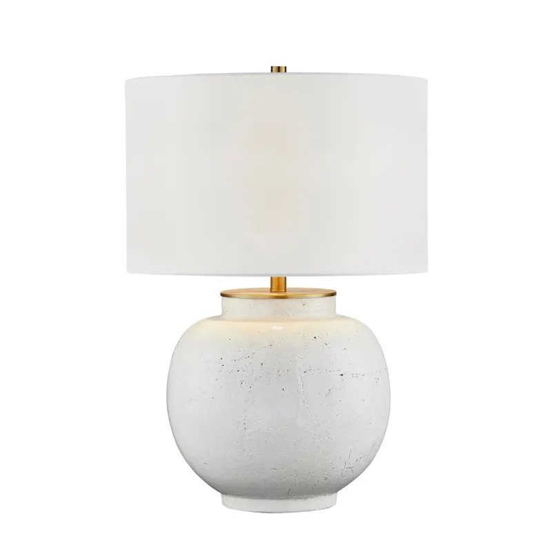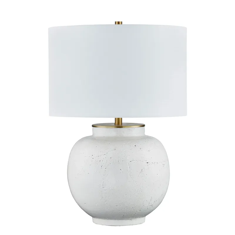 Kandi Table Lamp - A larger, rounder, more structured frame than her cousin Maeve Table Lamp but still boasts all the same great features; the ceramic base, adorned with textural details, that stands in striking contrast to the softness of the white linen drum shade, creating a captivating balance of shapes. Finished in a soft white hue with dark-speckled detailing and delicate gold accents, this lamp radiates a timeless elegance and feminine charm that enriches any space it graces.