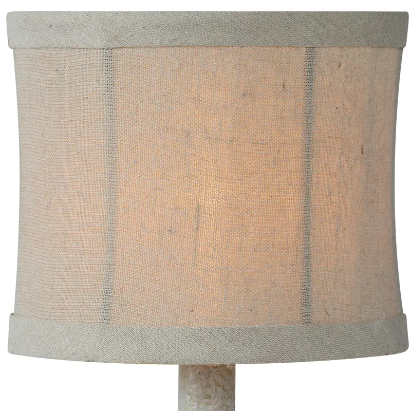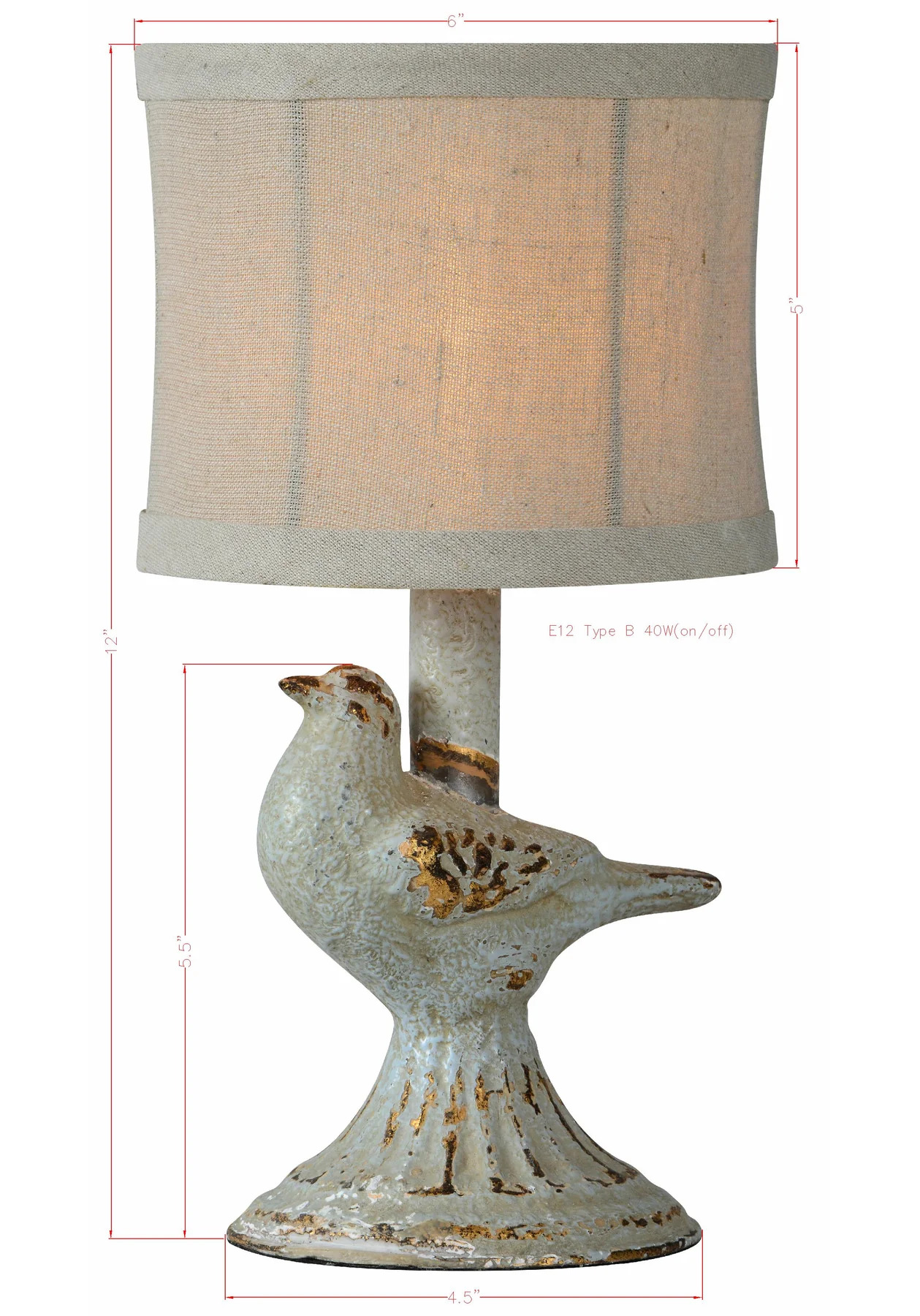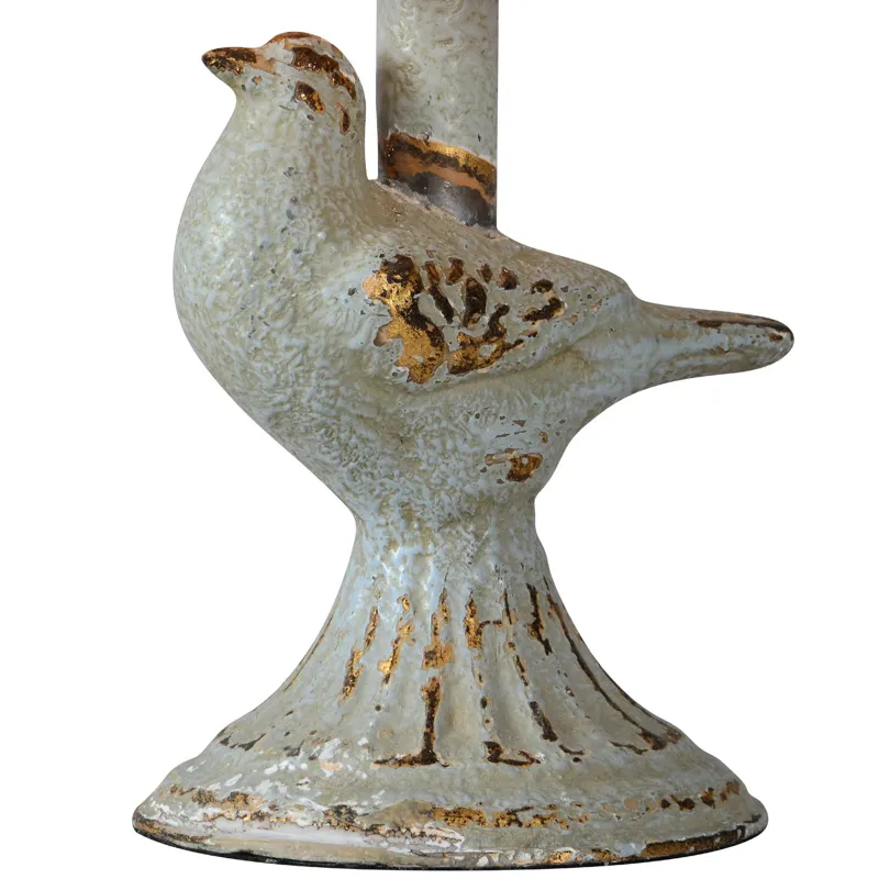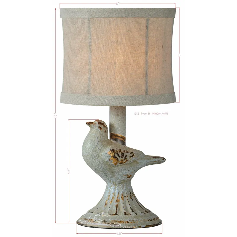 Robin Table Lamp - The Ren Table Lamp brings a charming and whimsical, vintage-inspired touch to any space with its sculpted bird base perched on a fluted pedestal. Crafted from resin with a weathered blue-gray and gold finish, it exudes a timeworn appeal reminiscent of antique garden statue. Topped with a natural linen shade, this 12-inch mini lamp is perfect for adding charm and character to a space.
