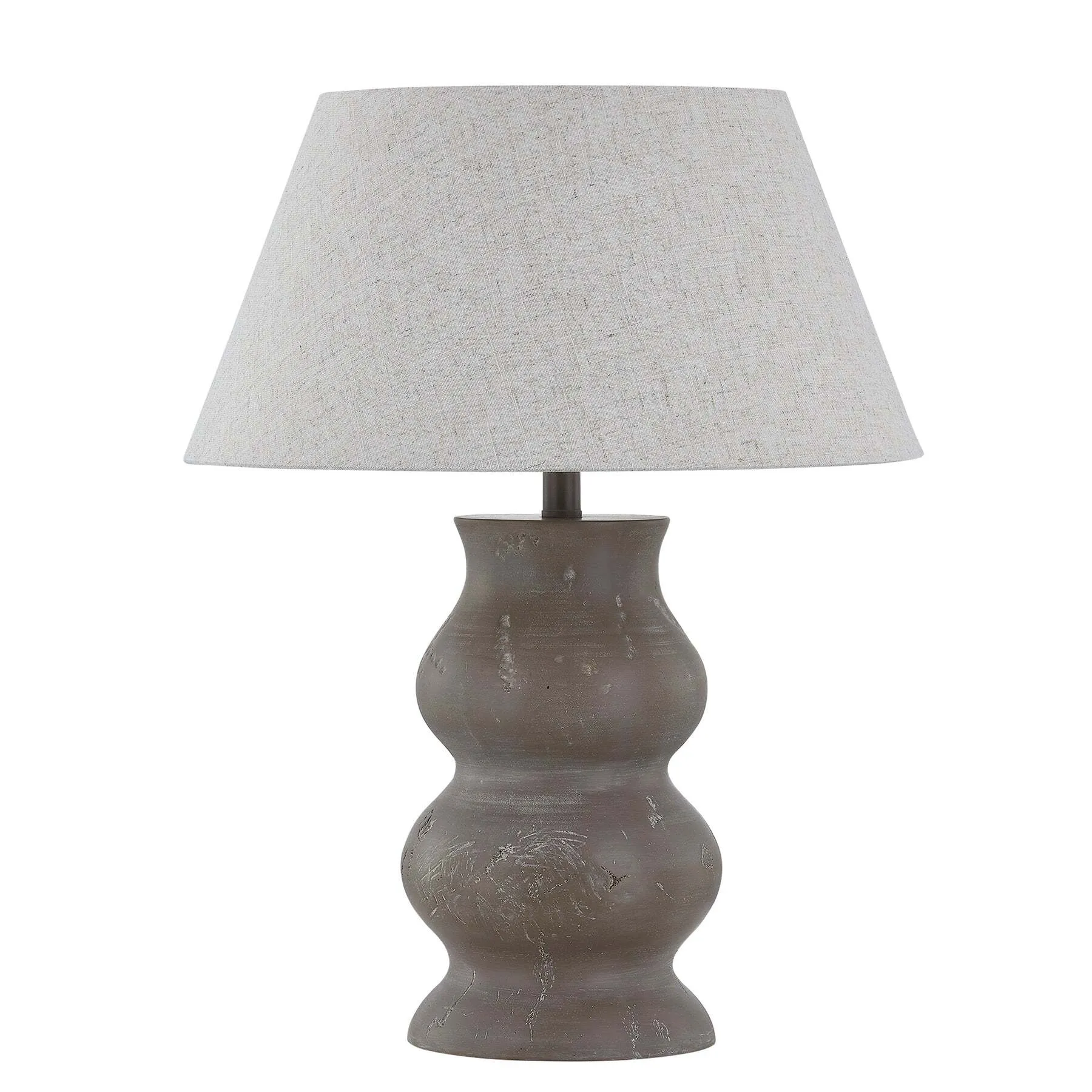 Drake Table Lamp - The Drake Table Lamp features a distinctive concrete-like finish, introducing an organic and textured element to your space. Its two-tier round stacked base adds dimension and visual interest, while the soft grayish-taupe tone is perfectly complemented by a tailored oatmeal-colored shade, creating a harmonious balance of the unrefined and refined. Standing at 24.5 inches tall, this lamp is a versatile addition, whether styled on a side table next to your favorite chair or placed on a console for a polished touch.