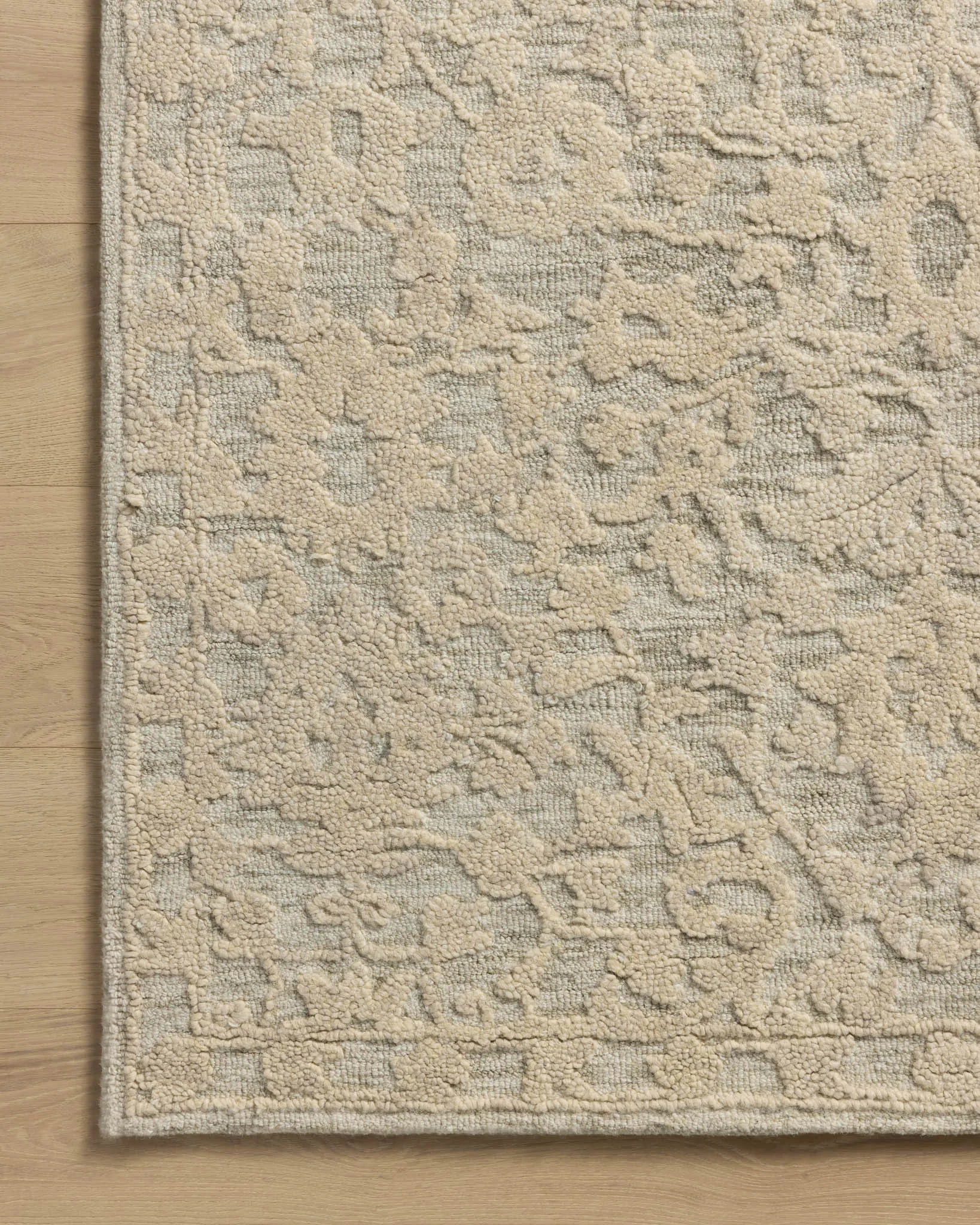 The Prudence Collection is a hand-tufted area rug made of soft, space-dyed wool and cotton, which lends a subtle gradation of color throughout the floral design. The rugs background is low-looped, while the pattern is made with a chunky, higher loop to create even more depth in this sophisticated design. This collection is hand-tufted of wool and cotton in India and Goodweave-certified, ensuring our commitment to ethical production and the support of weavers communities.