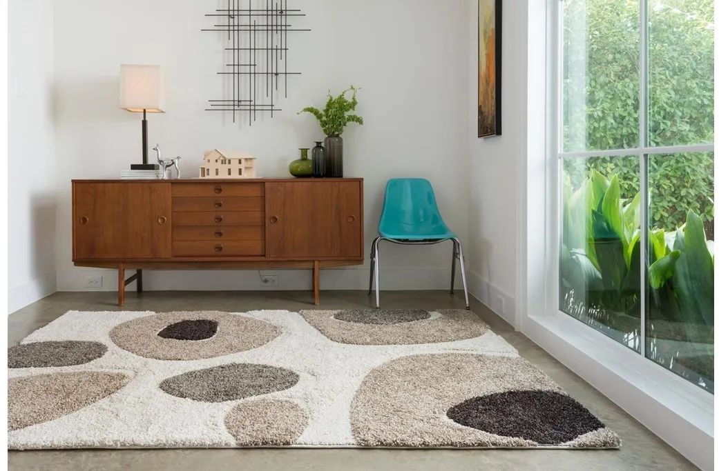 The Enchant Collection is a transitional power-loomed shag style collection that showcases a variety of neutral earth tone colors and over-scaled patterns. This new collection's transitional designs are elaborated with varying pile heights to create a high-low texture effect. This unique combination serves to create a stylishly sophisticated and luxurious look. Clean spills immediately by blotting with a clean sponge or cloth. Vacuum carefully without beater bar. Professional cleaning recommended. Rug pad recommended for use on hard floor. Pile Height 1" Backing Jute/Polyester Mesh Weight 0.7200 lbs/sq ft