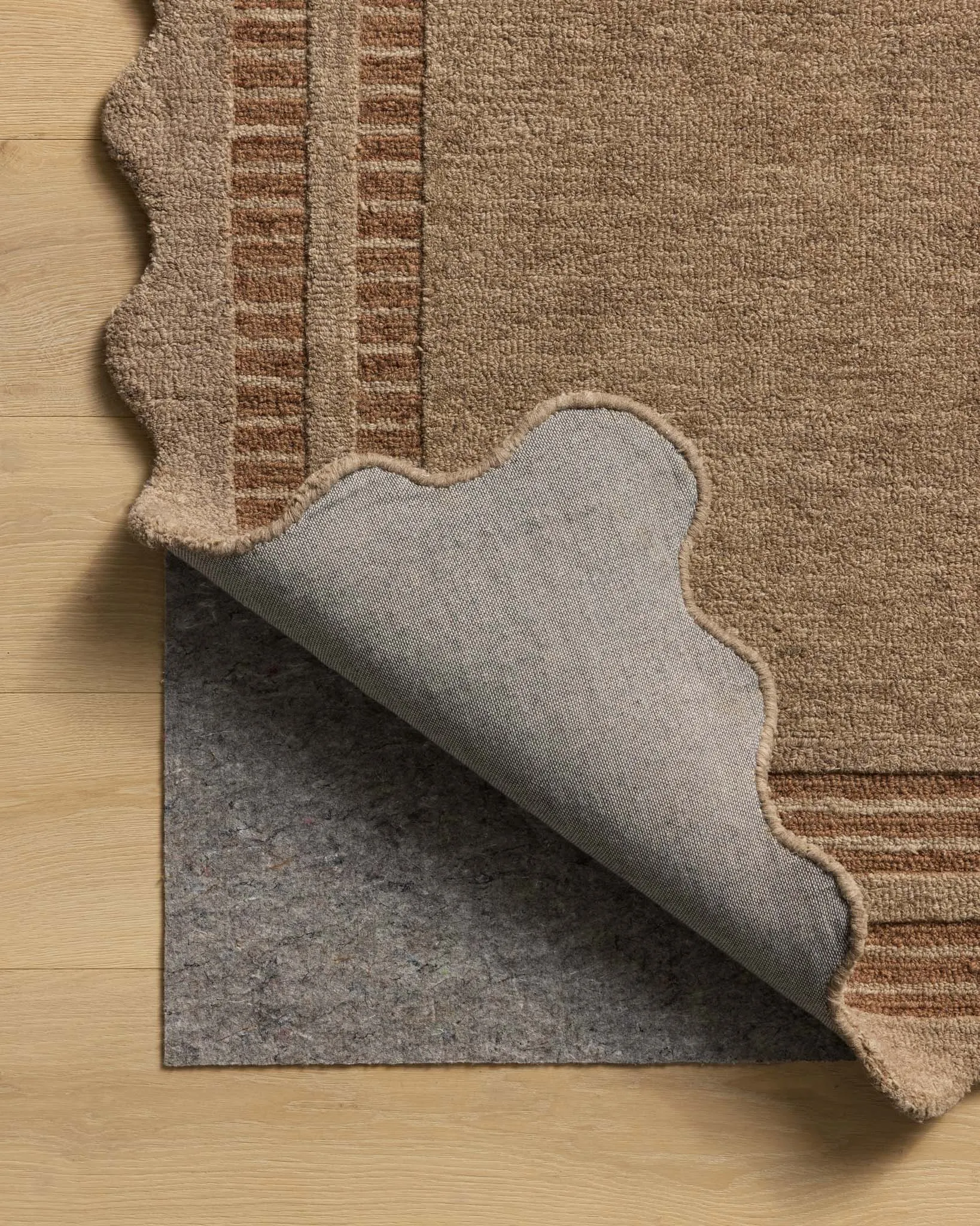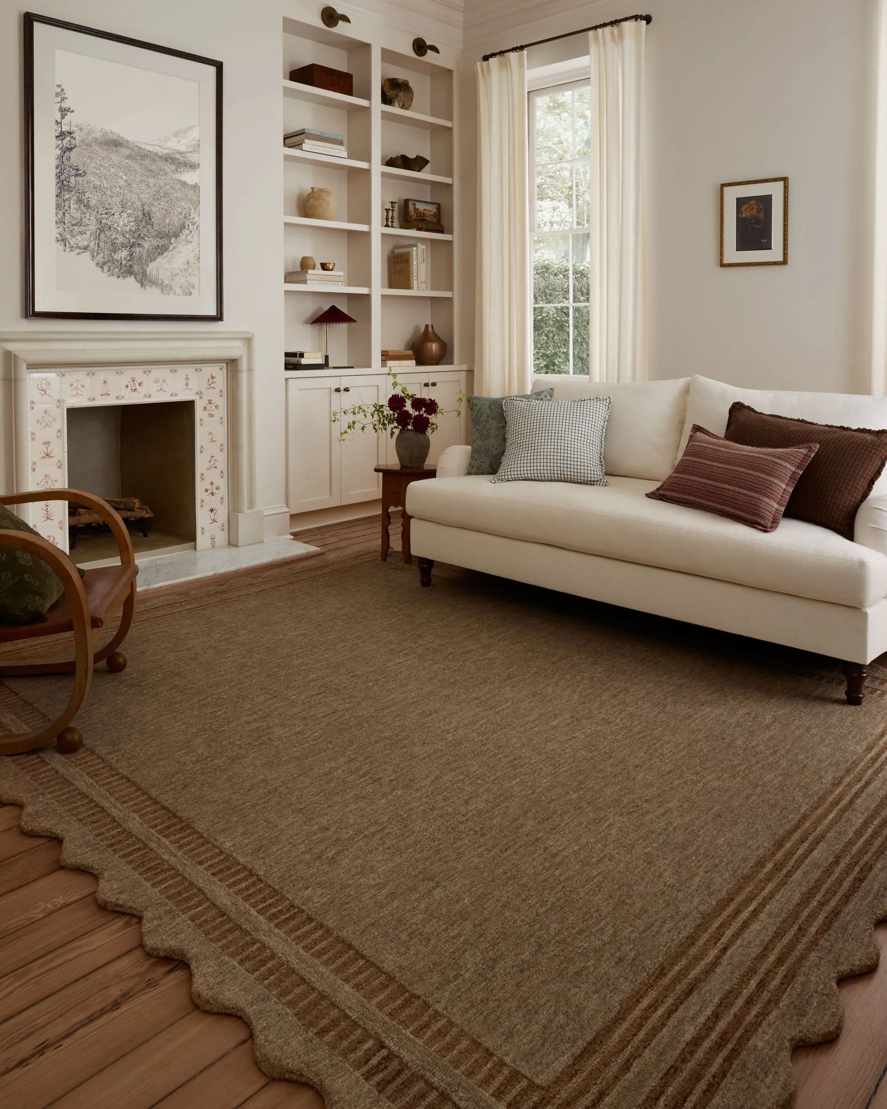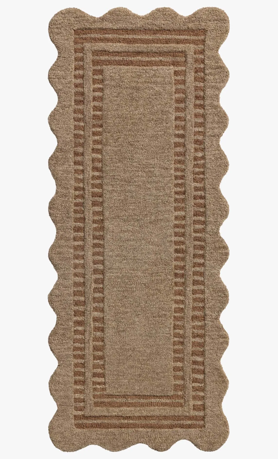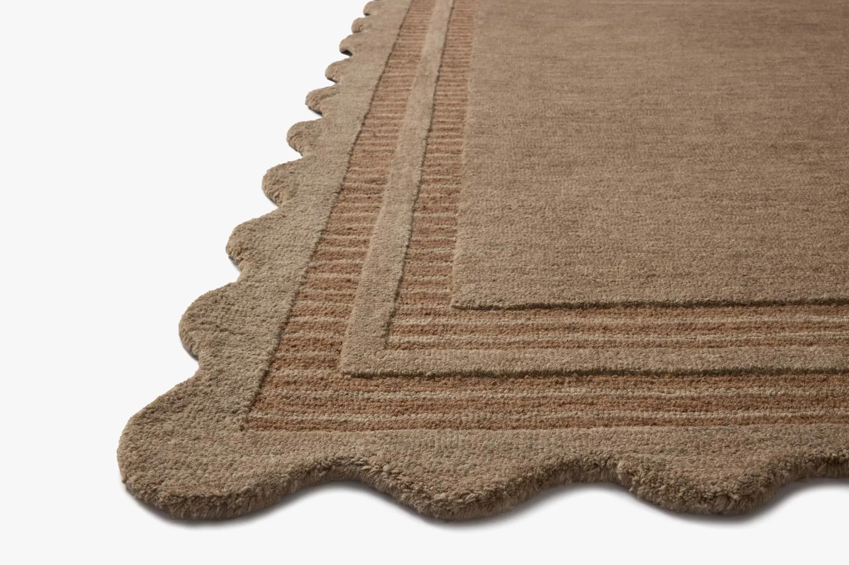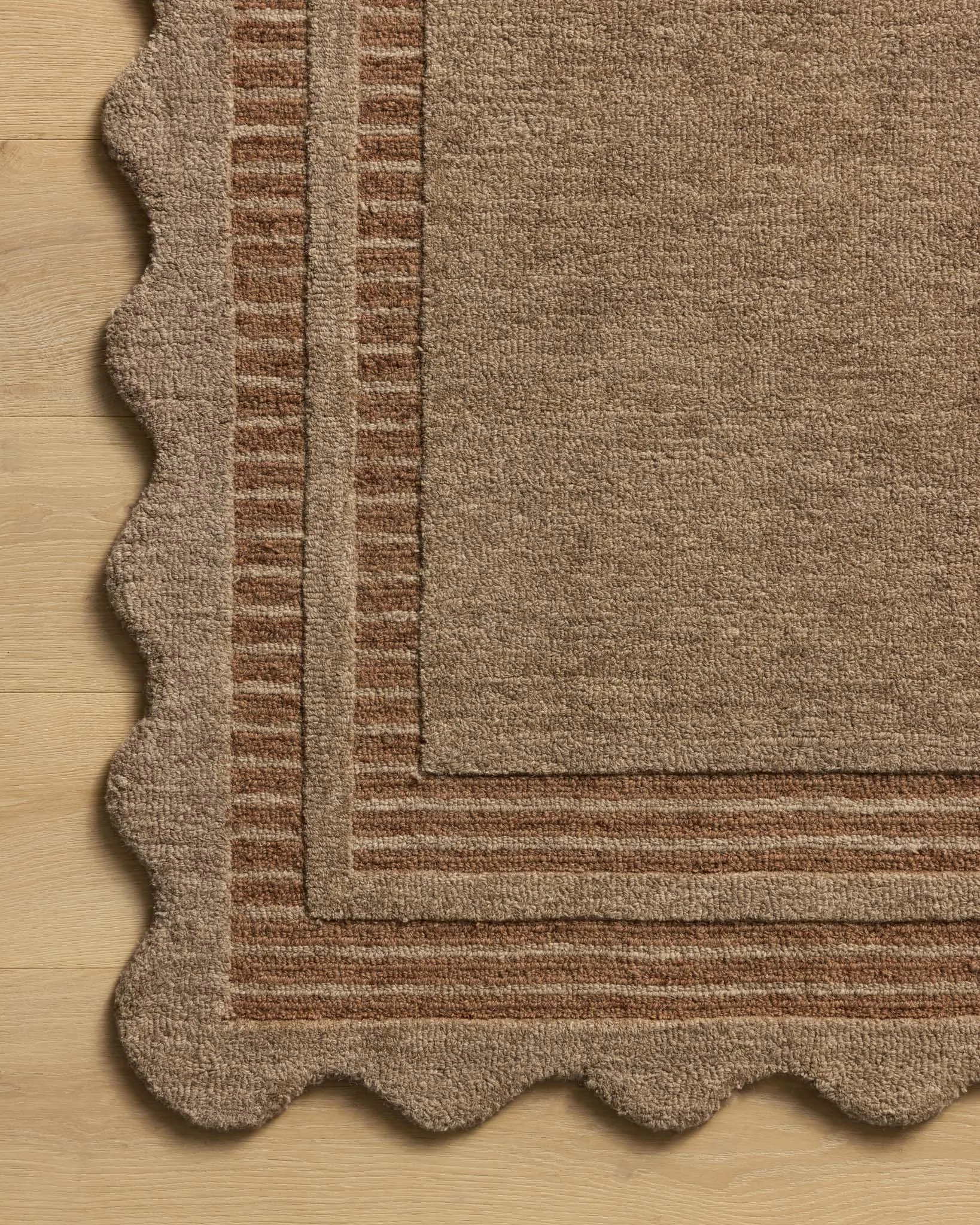 The Scottie Collection from Chris Loves Julia x Loloi is a hand-tufted wool area rug with a playful scalloped edge and lower-pile, striped border for a touch of structure. The rugs overall pile is thick and plush, available in easygoing earth tones and neutral colorways. This collection is hand-tufted of 100% wool in India and Goodweave-certified, ensuring our commitment to ethical production and the support of weavers communities. Some shedding is expected and a natural characteristic of wool rugs; we recommend vacuuming frequently without a beater bar.