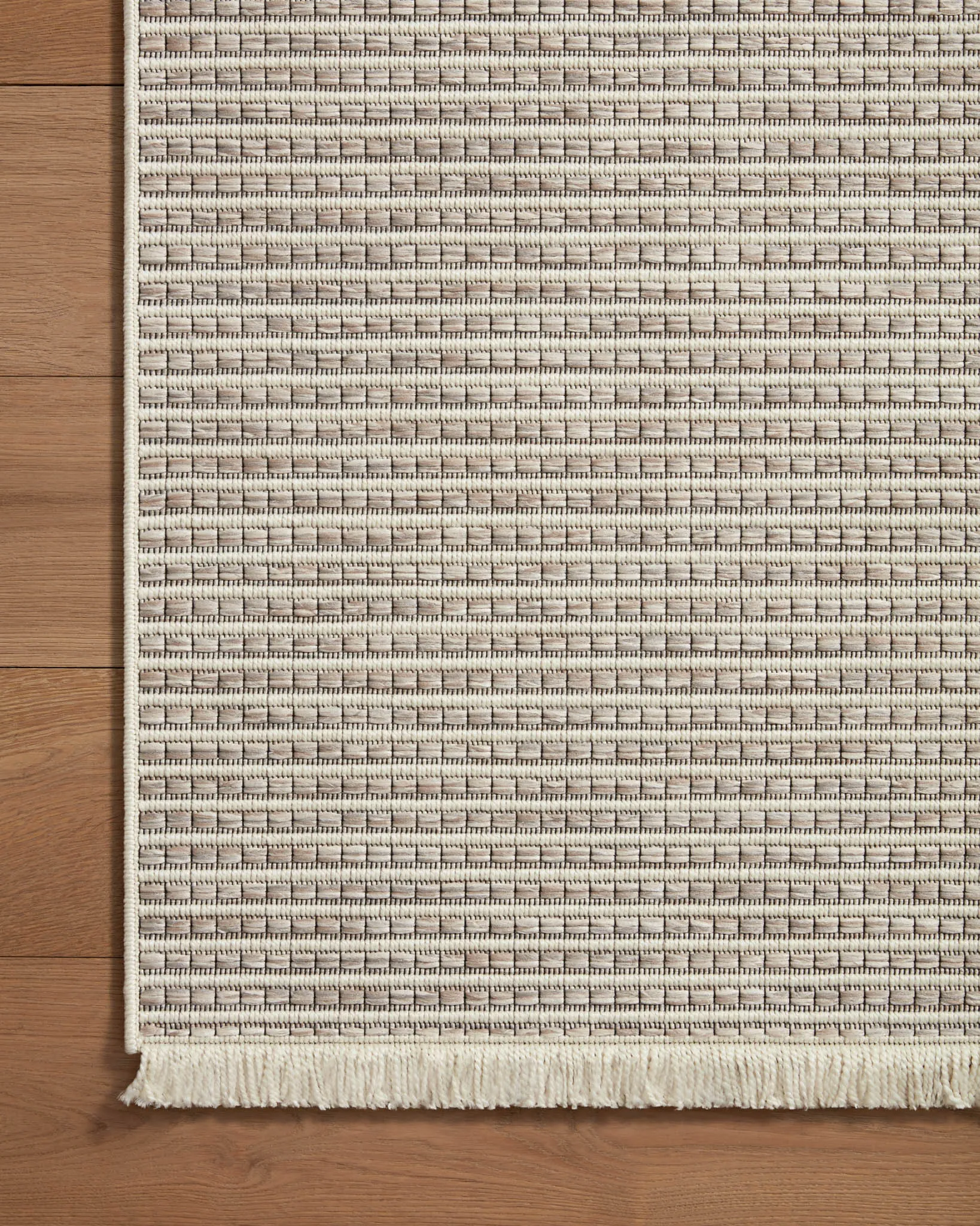 The Malibu Collection is an indoor/outdoor area rug by Amber Lewis x Loloi that channels the casual modern vibe of the beach city it's named after. The rug's neutral-toned geometric prints are easy to match with a range of decor styles, while a hint of fringe adds to the breezy aesthetic. This collection is power-loomed of 100% polypropylene that's made to resemble natural fibers, but which can withstand the outdoor elements and indoor high-traffic areas like mudrooms, playrooms, and hallways. Spot clean, vacuum, or hose off completely as needed. Made in Egypt and OEKO-TEX certified, ensuring its materials don't contain harmful substances.