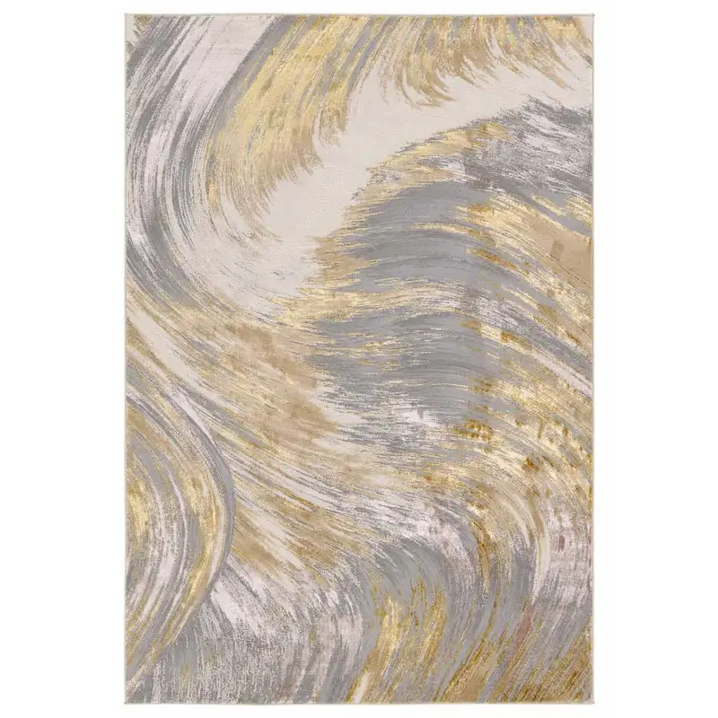 The show-stopping yet surprisingly versatile appeal of the Catalyst collection brings contemporary edge to any home. The organic abstract design of the Zione rug creates a dynamic and shimmering statement in tones of gold, gray, tan, taupe, and cream. This power-loomed rug features metallic polyester fibers blended with stain-resistant polypropylene for a brilliant sheen from various perspectives. This area rug withstands high traffic areas of the home such as living rooms, halls, and entryways.