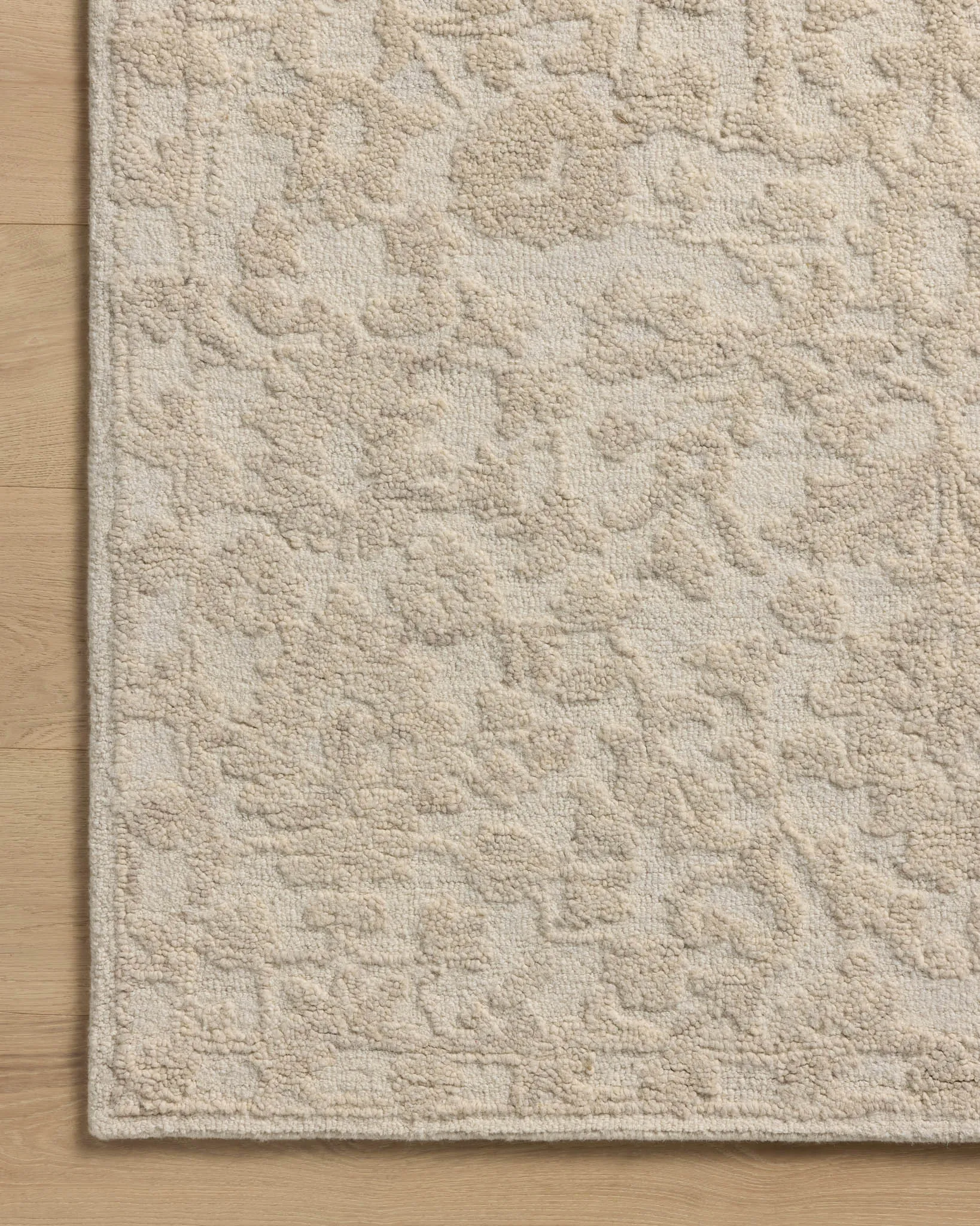 The Prudence Collection is a hand-tufted area rug made of soft, space-dyed wool and cotton, which lends a subtle gradation of color throughout the floral design. The rugs background is low-looped, while the pattern is made with a chunky, higher loop to create even more depth in this sophisticated design. This collection is hand-tufted of wool and cotton in India and Goodweave-certified, ensuring our commitment to ethical production and the support of weavers communities.