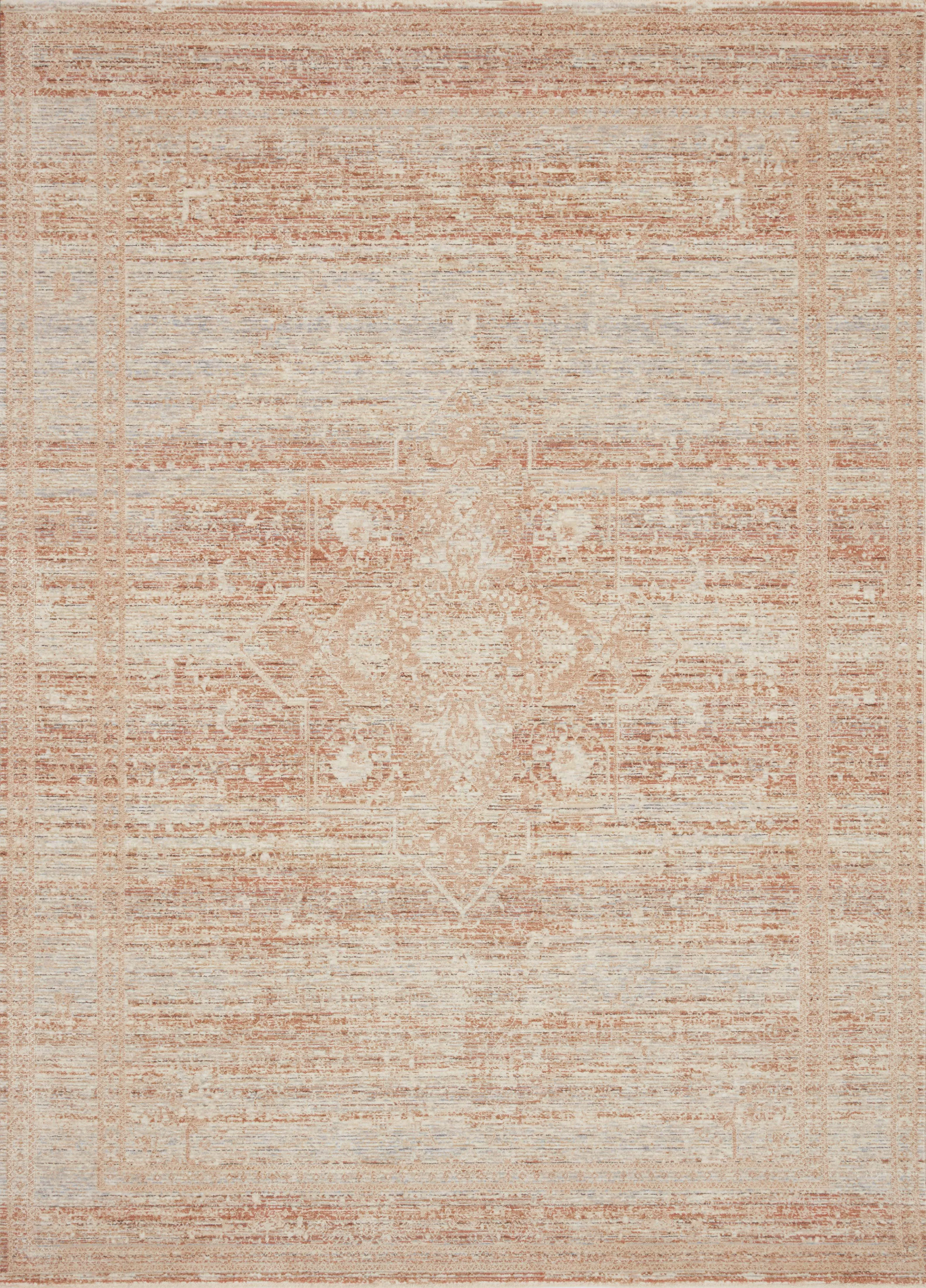 Power-loomed of polyester and viscose in Turkey, the Faye Collection displays a soft color palette and a mix of distressed and traditional-inspired motifs.