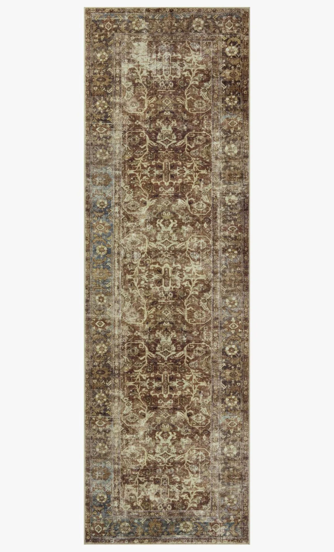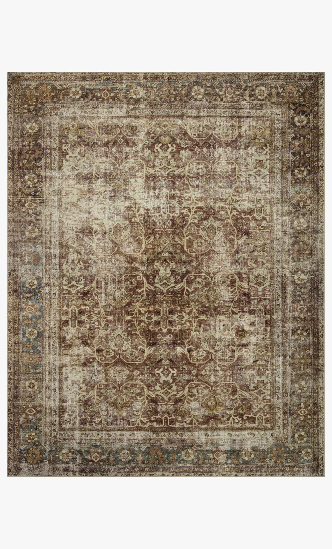 The Sinclair Collection for Magnolia Home by Joanna Gaines x Loloi is power-loomed of polyester, including 58% Global Recycling Standard (GRS) certified recycled polyester (made from recycled plastic bottles), certified by Control Union 1171944. Sinclair area rugs have incredible softness and durability comparable to classic power-loomed rugs, while also reducing waste in their production. This collection is also machine-washable, making it an ideal rug in high-traffic living rooms, hallways, entryways, and children’s rooms. The design features antique motifs with intricate details and slight distressing, creating a sophisticated, storied feel.