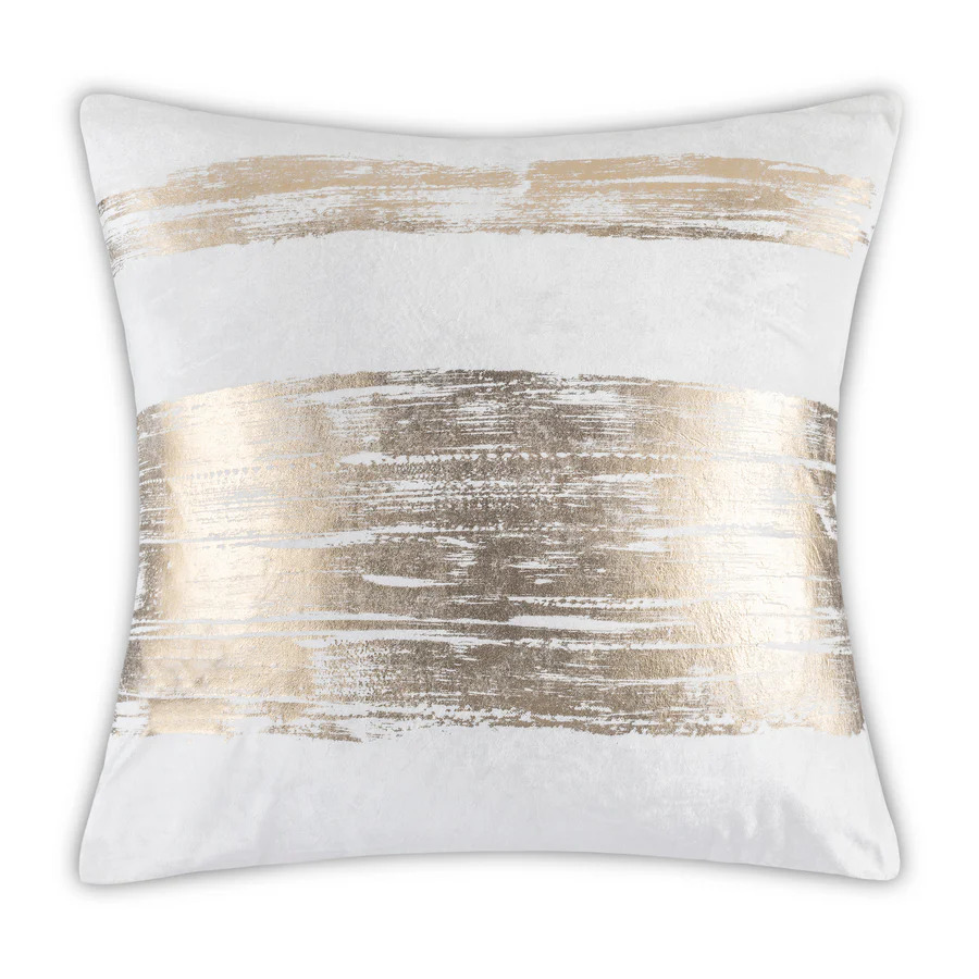Redesign your space with the chic elegance of the Inspire Me! Home Decor Leyla Ivory Gold Pillow. Crafted from ivory velvet with hand-painted gold brushstrokes, this pillow adds a touch of glamour and sophistication to any room. The back features ivory velvet for added comfort and style. Elevate your decor with this statement piece that effortlessly combines luxury and elegance.