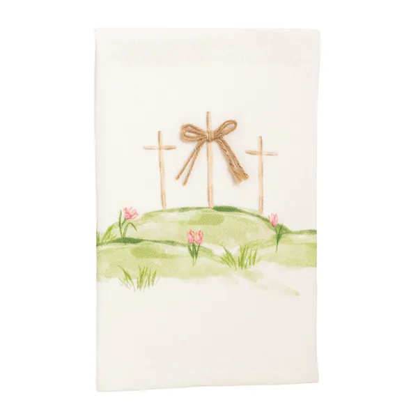 Easter Three Crosses Towel is a beautifully crafted woven cotton hand towel that adds a touch of elegance to your home decor. Featuring intricate dimensional grosgrain or twine bow accents, this towel is adorned with delicate French knot flowers, creating a charming and sophisticated look. Measuring 26" x 16 1/2", it is the perfect size for various uses around the house. Made from 100% cotton, this towel offers a soft and absorbent texture, ensuring both functionality and style. Ideal for celebrating the Easter season or enhancing your everyday decor with a meaningful design.