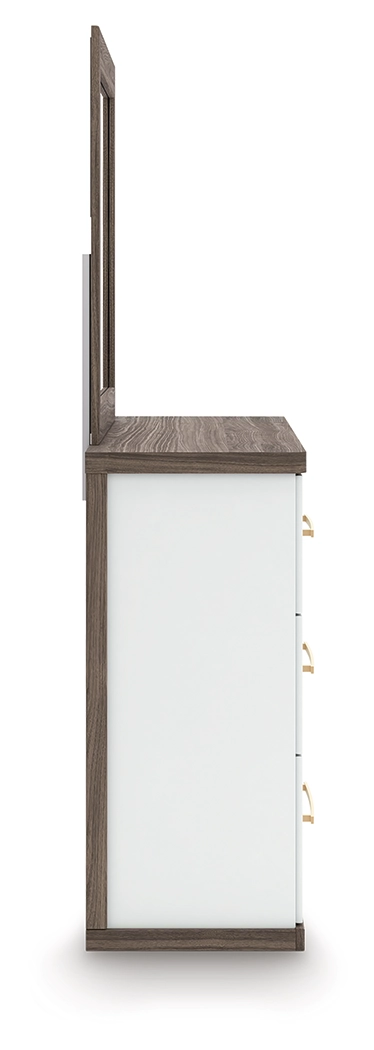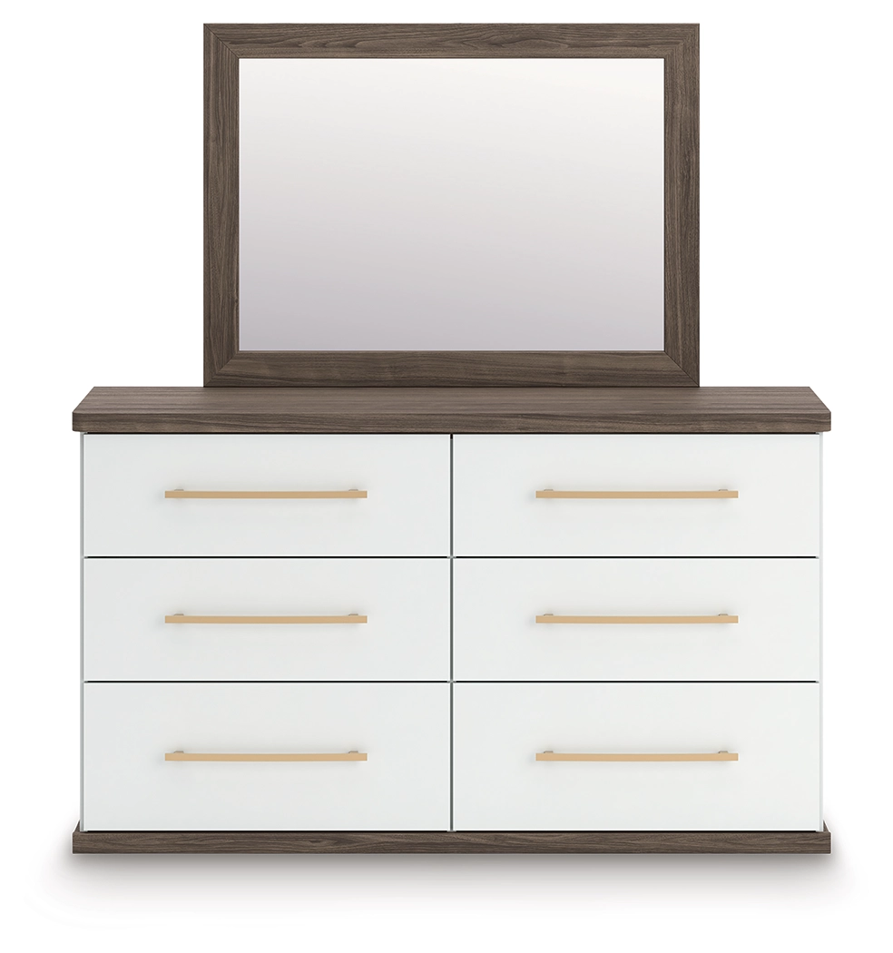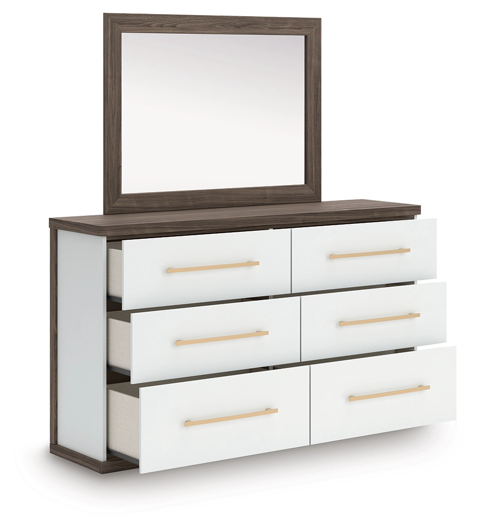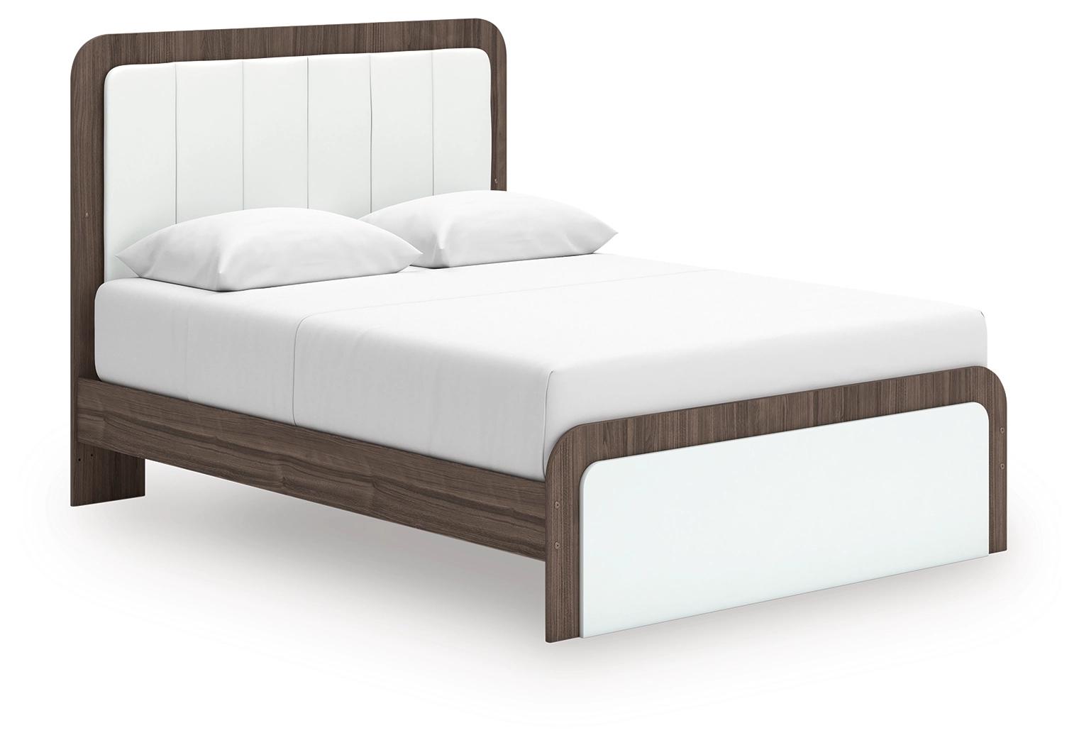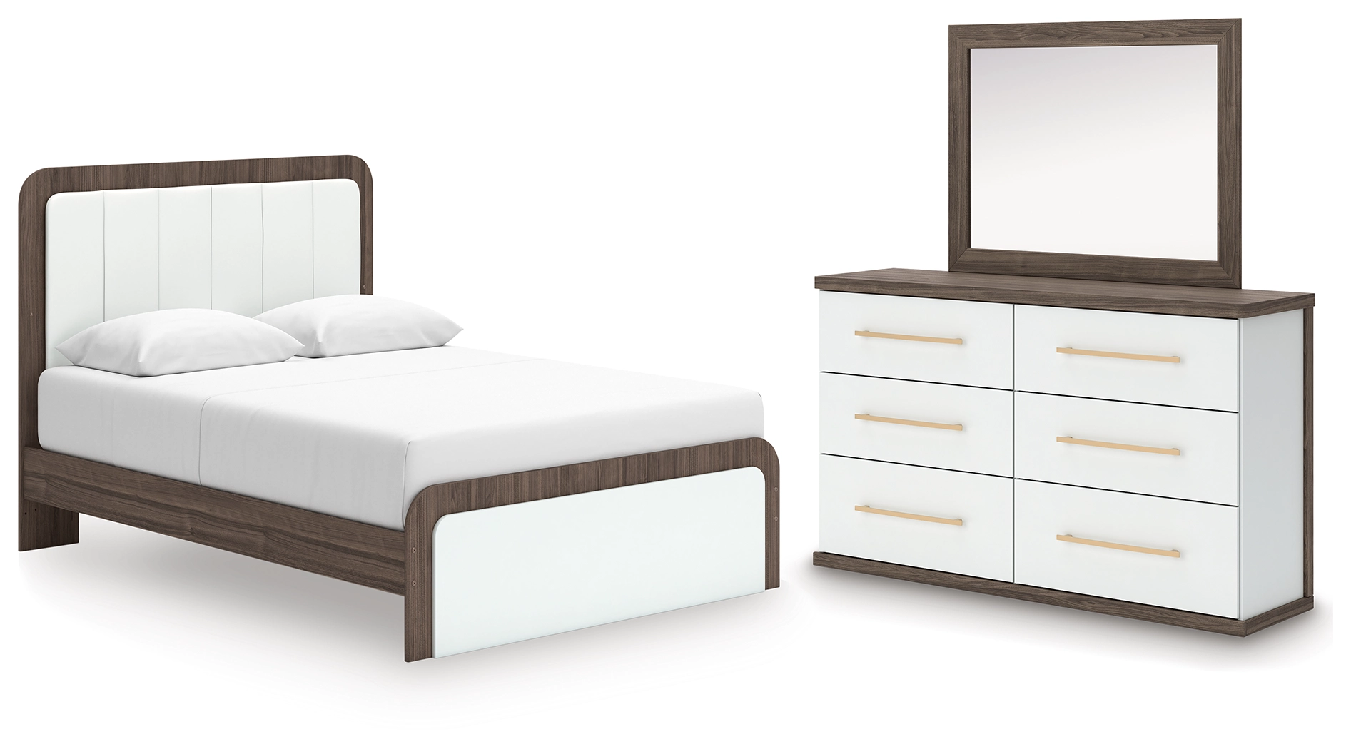 Looking to make a subtly striking statement in your bedroom? We've got you covered with this bedroom package. Its sophisticated two-tone treatment marries a warm brown finish over replicated walnut grain with a matte white finish. This set is a master class in contemporary yet comfortable character.