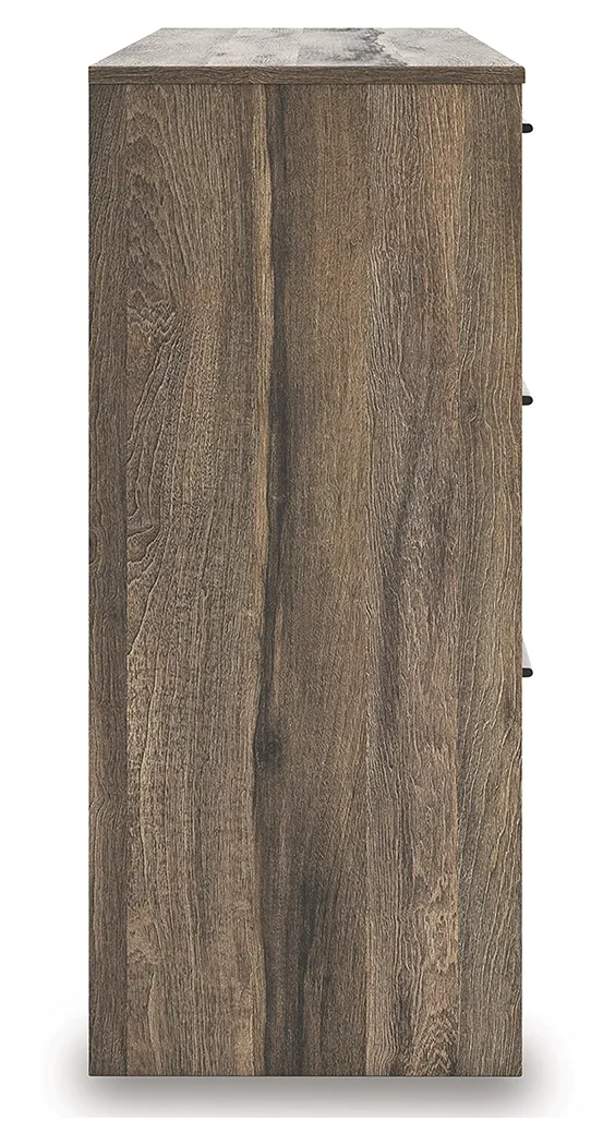 Casually cool style and lots of storage go hand in hand with this bedroom package. A weathered brown finish over replicated oak grain creates an easygoing vibe, setting the scene in your restful retreat. The set's clean lines and modern handles provide a fuss-free look.