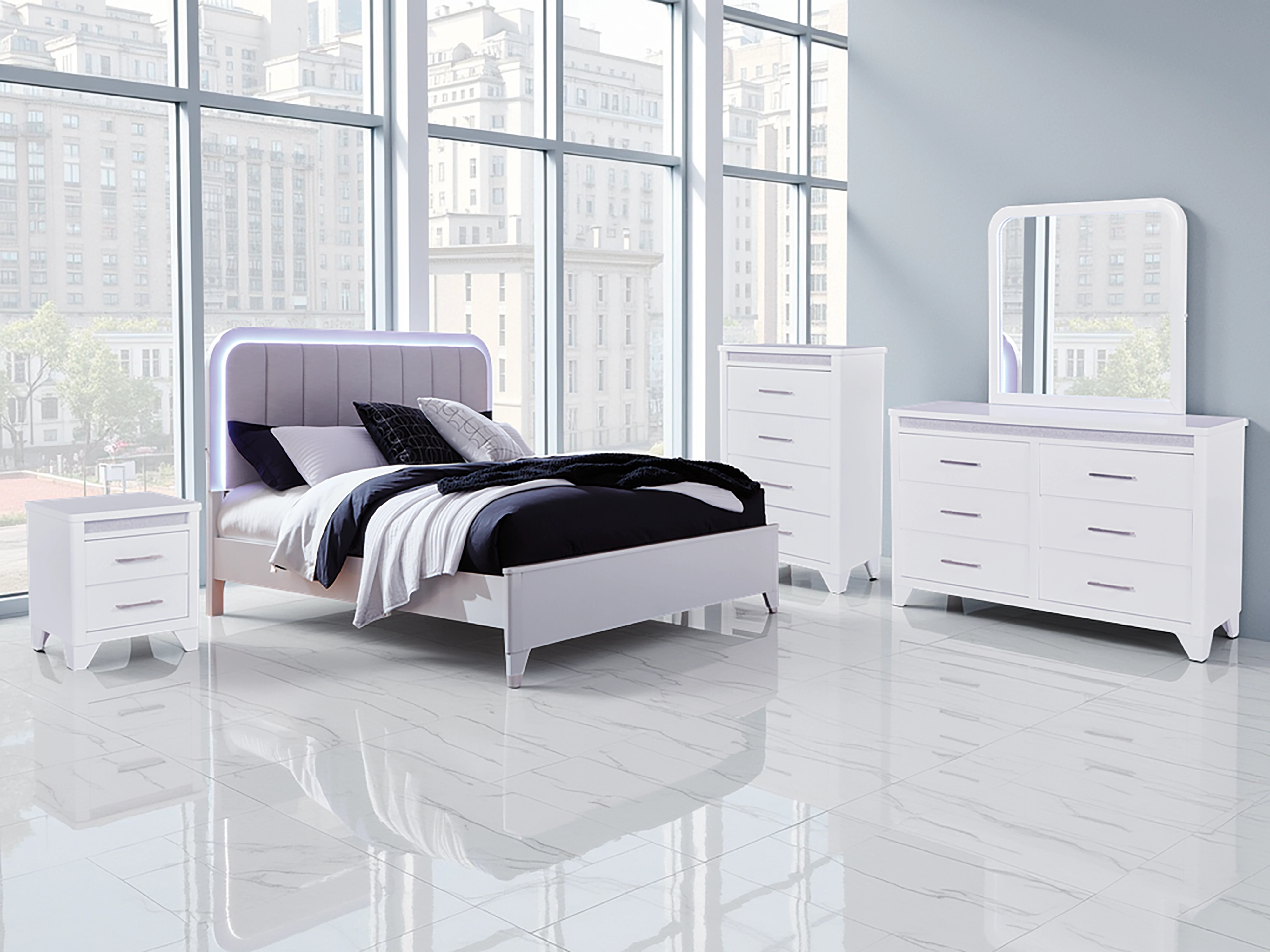 This queen upholstered panel bed is a showstopper, bringing a touch of modern glamour to your sanctuary. A sleek white finish, paired with the cushioned headboard’s off-white fabric and metallic silver accent threads, creates a sophisticated feel. Built-in LED lighting adds a soft glow, making it even easier to get ready in the morning or wind down at night. It’s a simply stunning way to achieve the bedroom of your dreams.