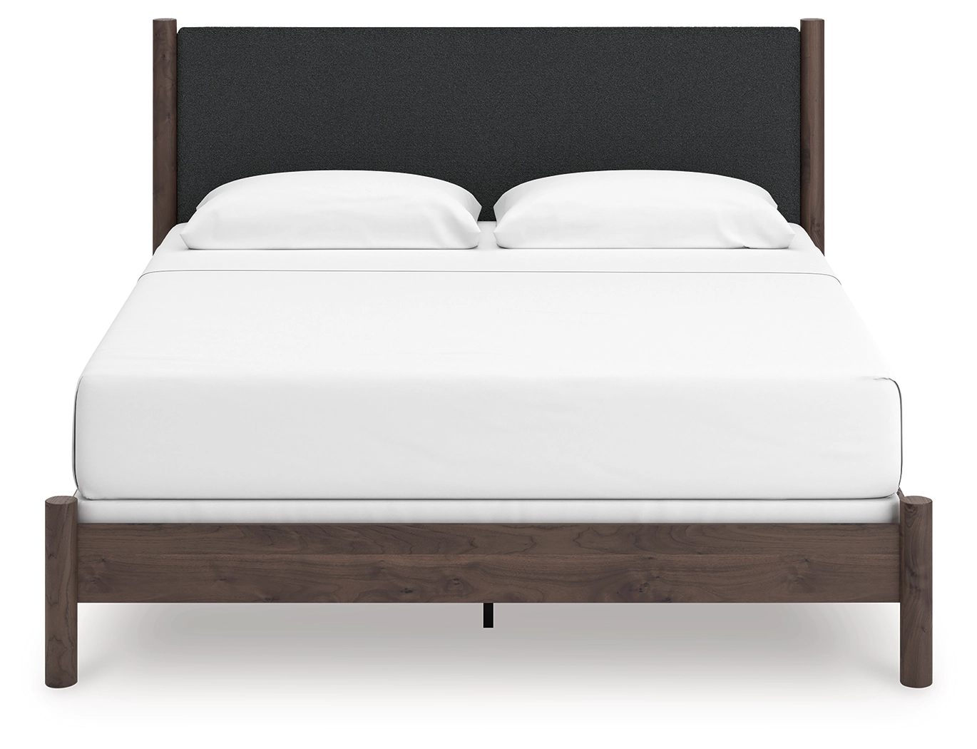 Crafted with both form and function in mind, this queen upholstered panel bed brings a dash of retro-cool character to your modern boho aesthetic. Its textured black headboard fabric adds a trend-right touch to the classic silhouette. Warmly welcoming with a rich brown finish, the bed pairs well with muted hues, earth tones and other neutrals alike. What a refined take on easygoing style.