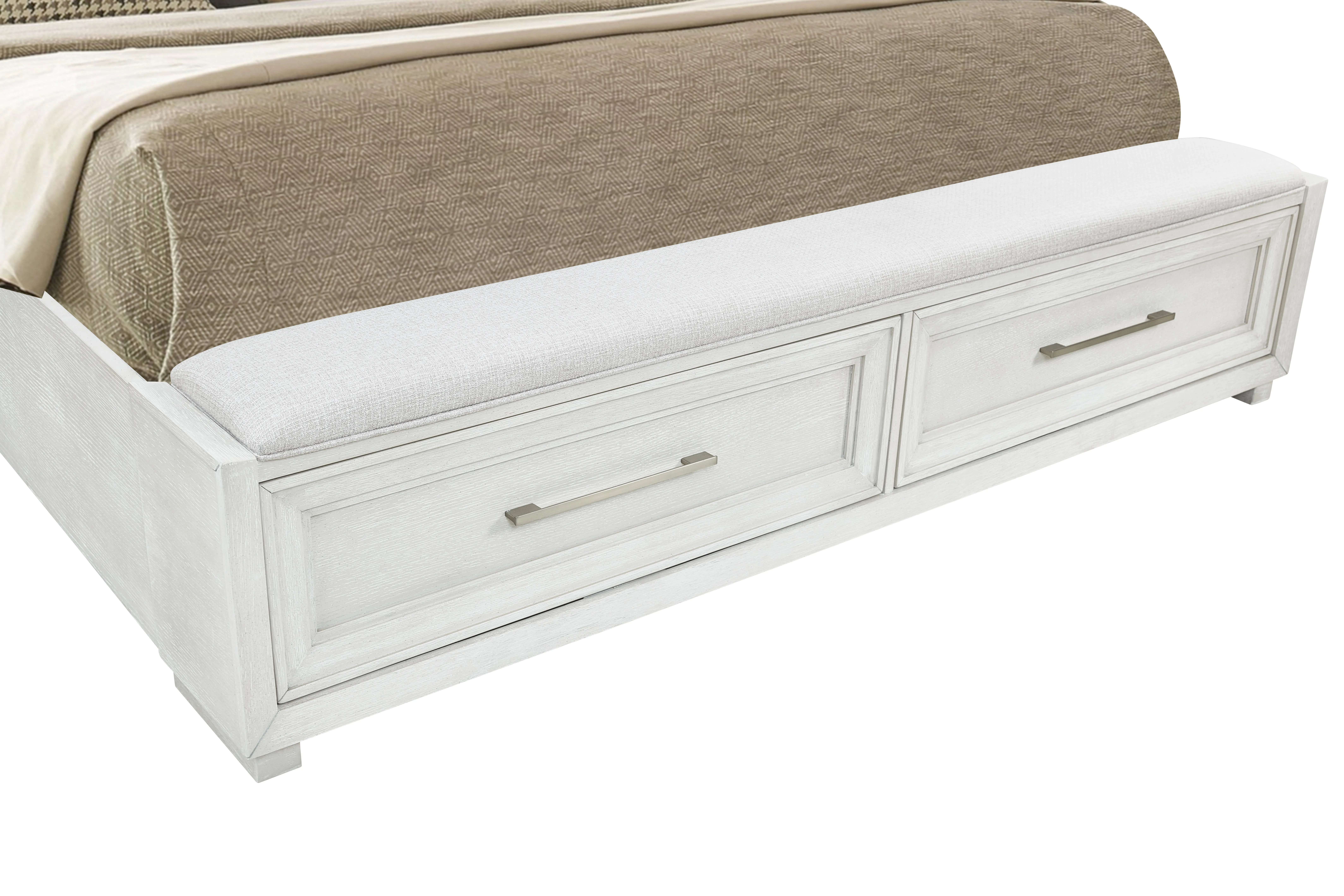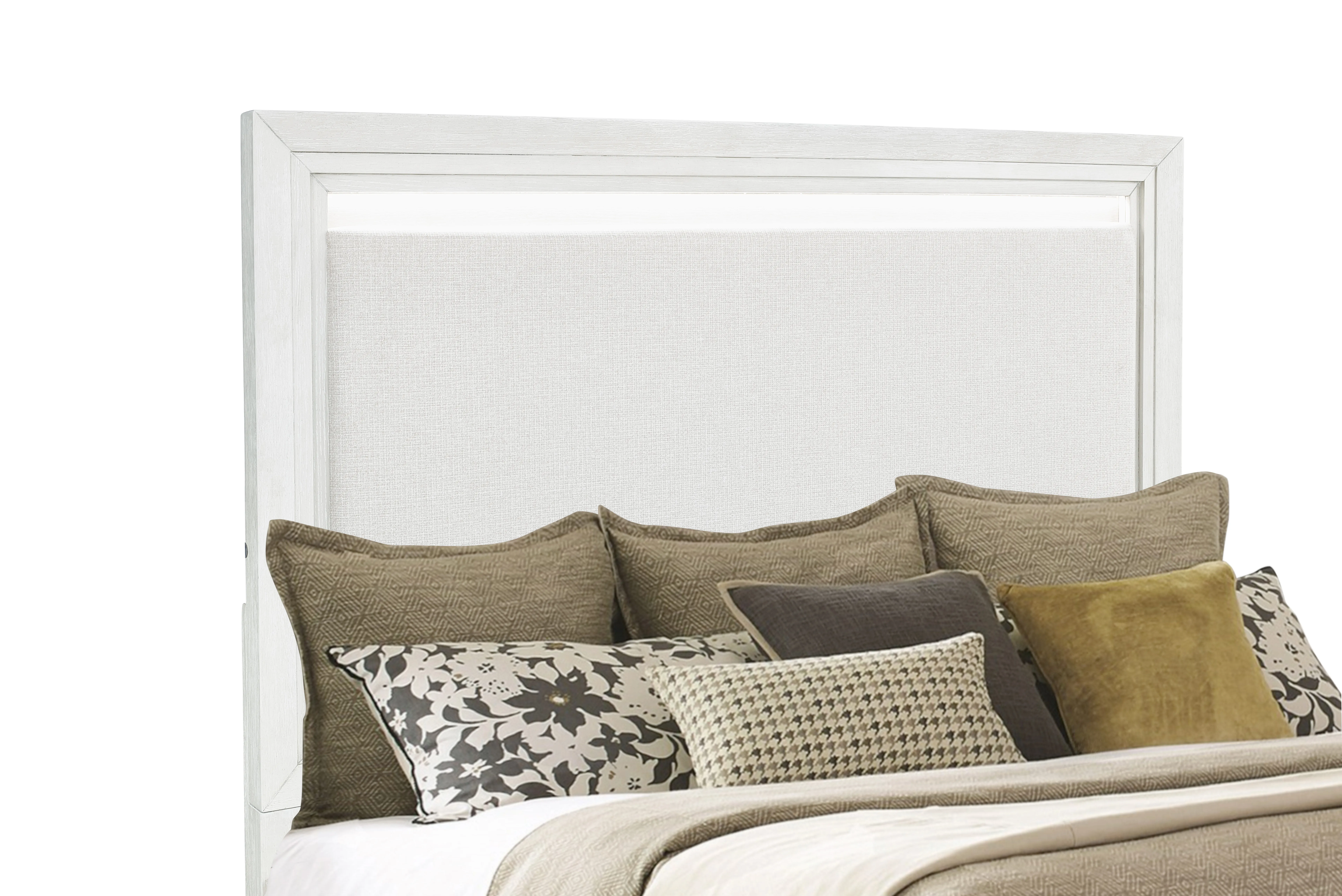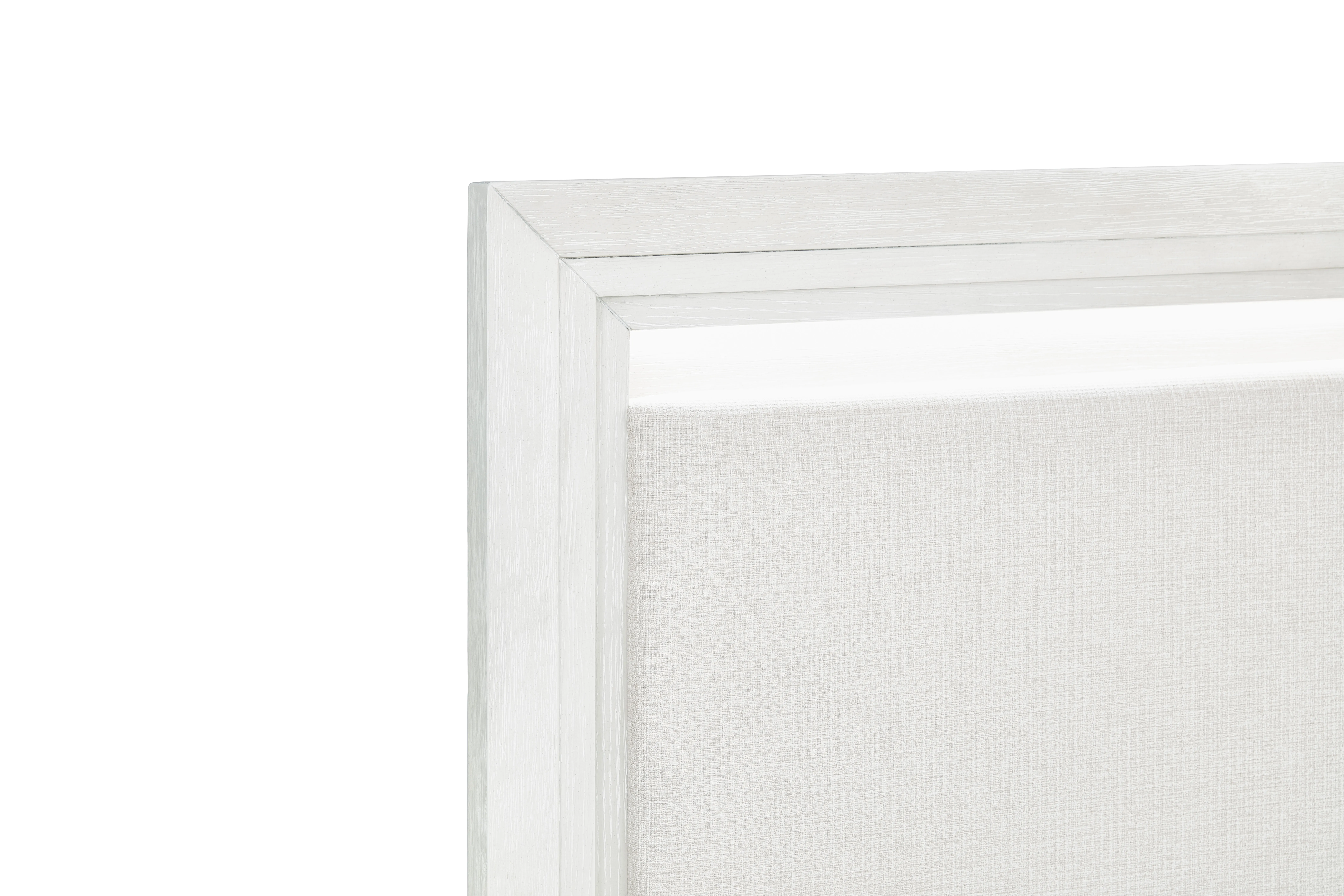 • Casual Contemporary Bedroom Constructed Of Rubber Wood Solids And Straight Grain Oak Veneers In A Brushed White Finish With Cob Led Lights On All Pieces.