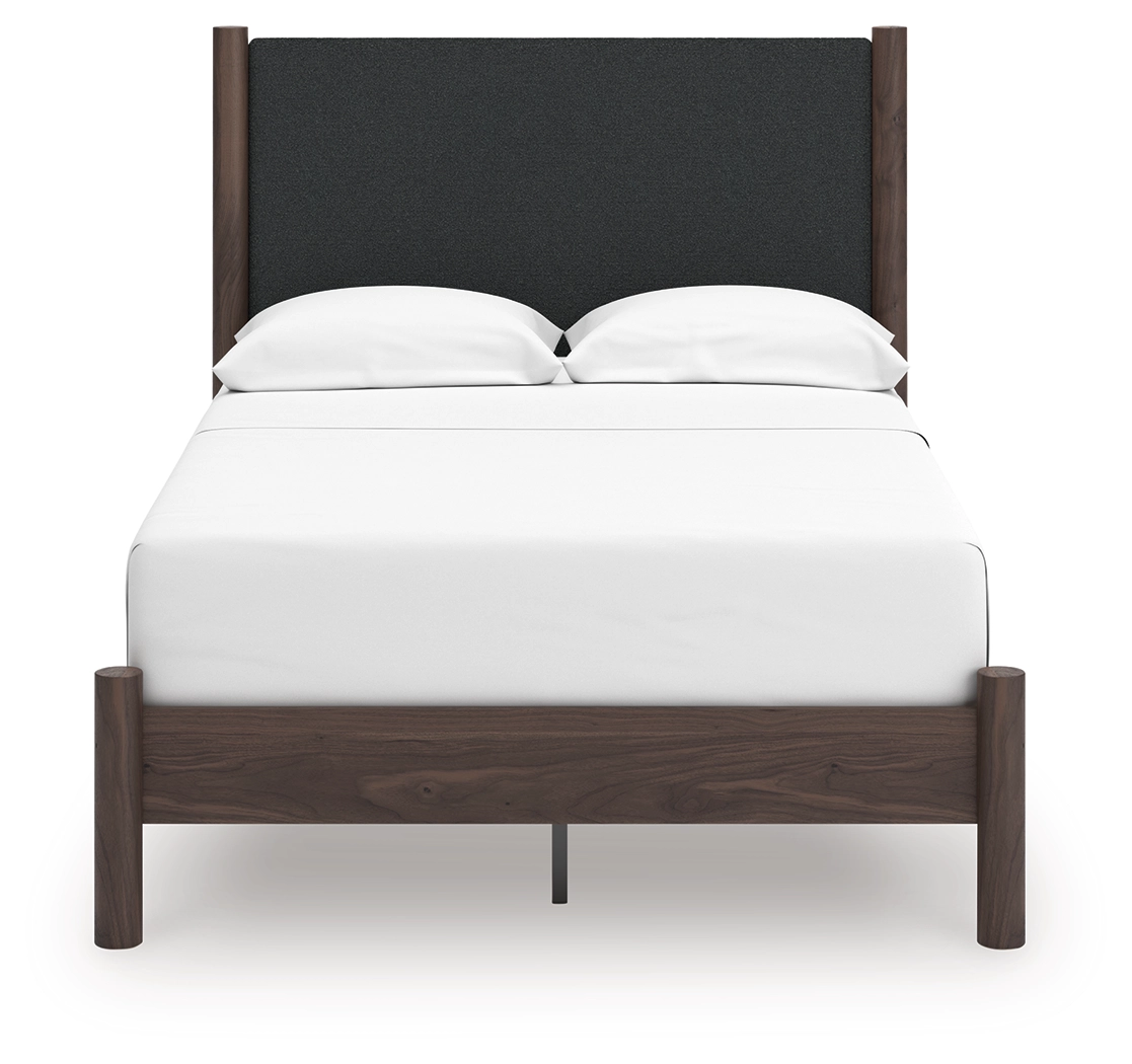 Crafted with both form and function in mind, this full upholstered panel platform bed brings a dash of retro-cool character to your modern boho aesthetic. Its textured black headboard fabric adds a trend-right touch to the classic silhouette. Warmly welcoming with a rich brown finish, the bed pairs well with muted hues, earth tones and other neutrals alike. What a refined take on easygoing style.