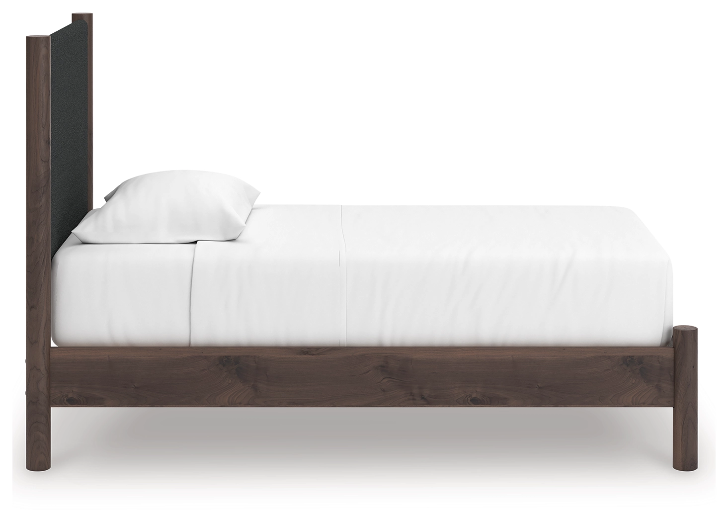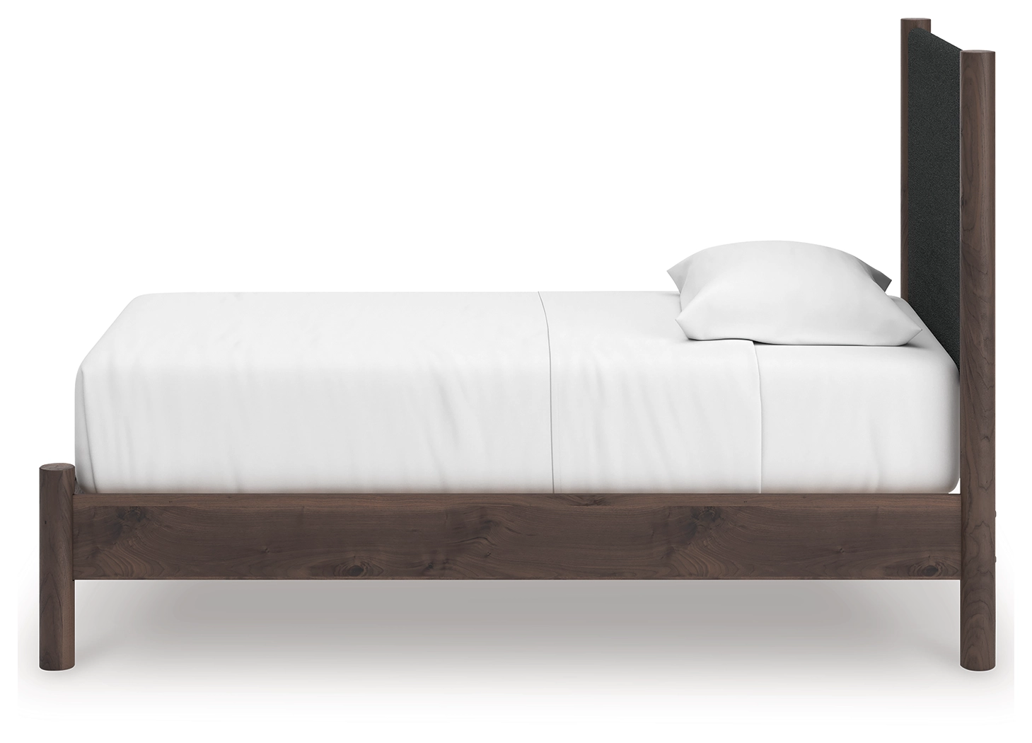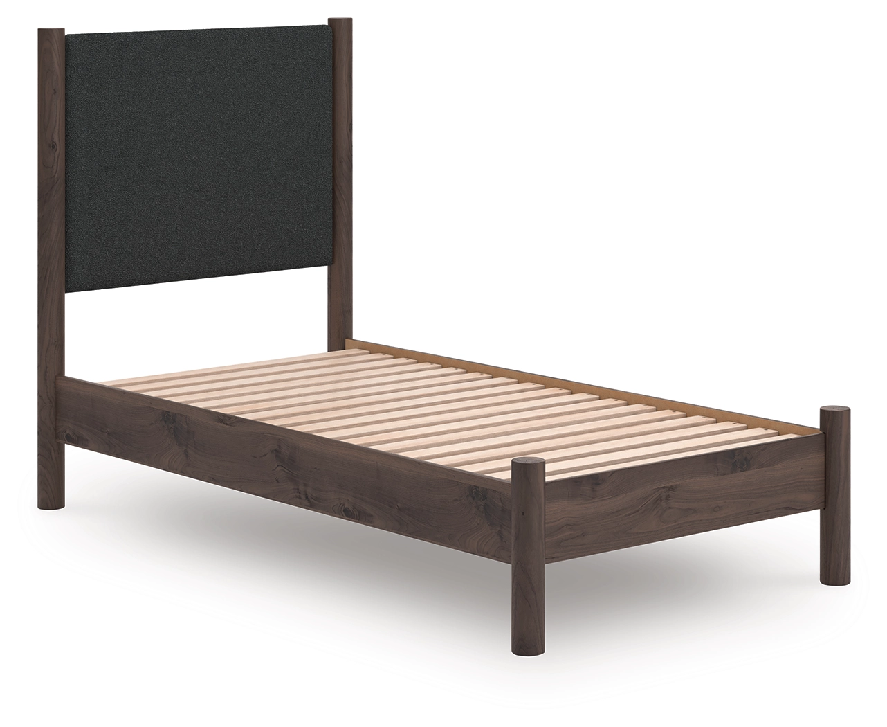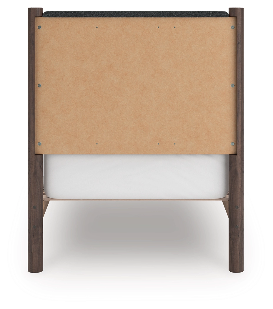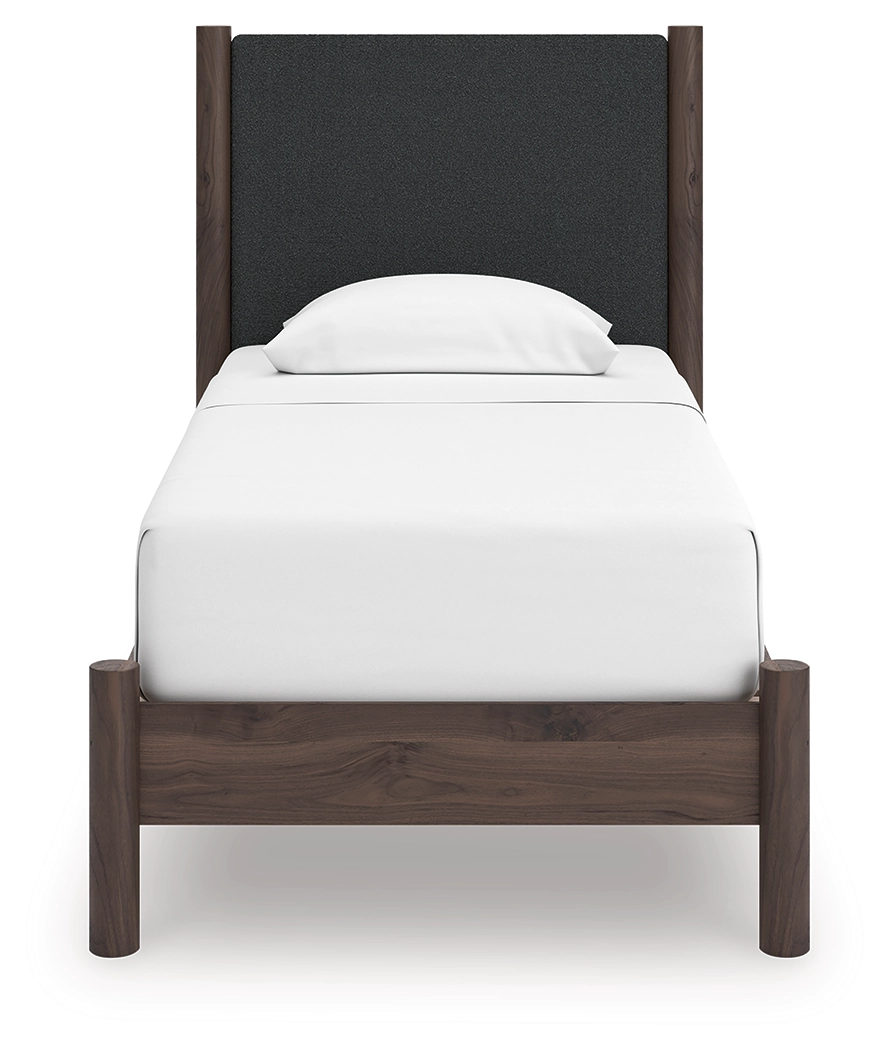 Crafted with both form and function in mind, this twin upholstered panel platform bed brings a dash of retro-cool character to your modern boho aesthetic. Its textured black headboard fabric adds a trend-right touch to the classic silhouette. Warmly welcoming with a rich brown finish, the bed pairs well with muted hues, earth tones and other neutrals alike. What a refined take on easygoing style.