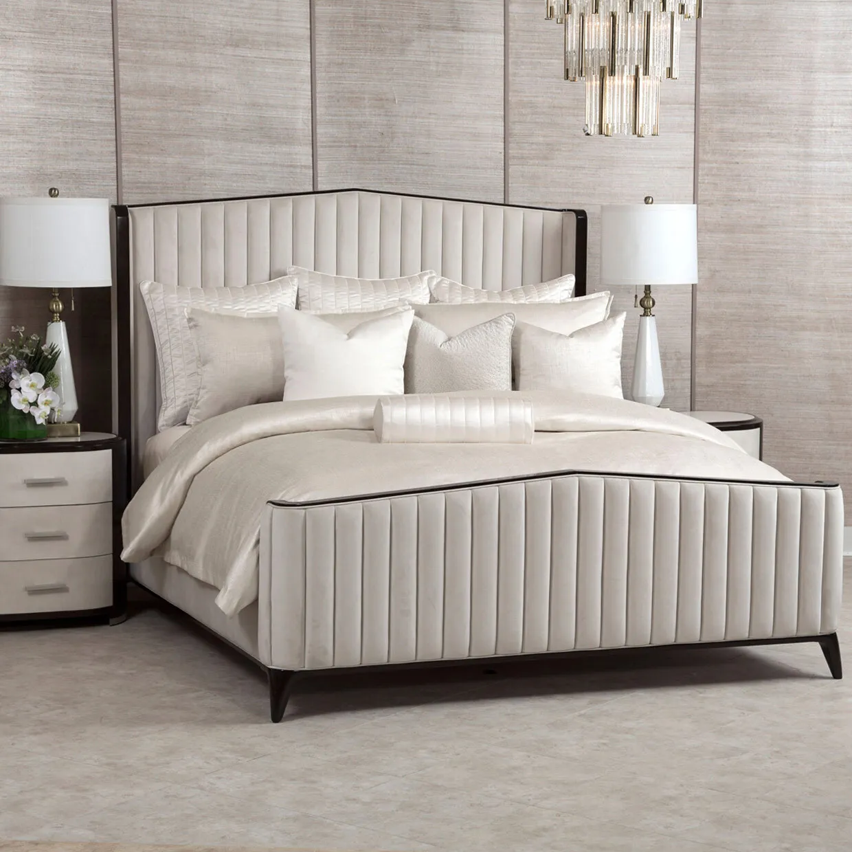 Abound with glamour, the Oliver comforter set showcases a modern style perfect for elegant homes. This set's main fabric features a subtle texture with hints of gold and embroidered accents on the accessories. Its solid ivory hue blends effortlessly with a range of color palettes and aesthetics, while the velvet embroidered pillow delivers a dash of uniqueness. The 4 decorative pillows have removable covers and feather fill.