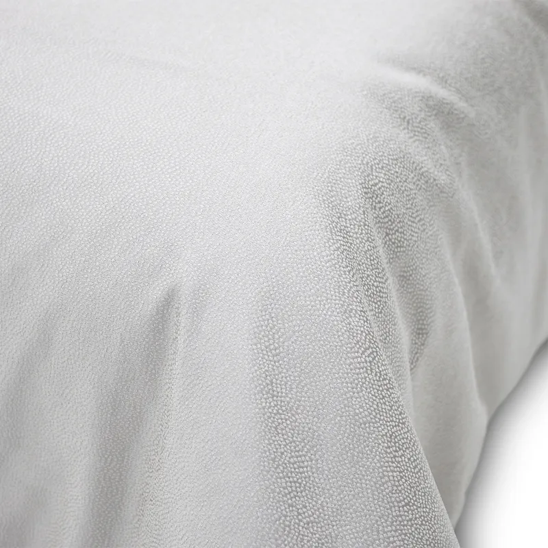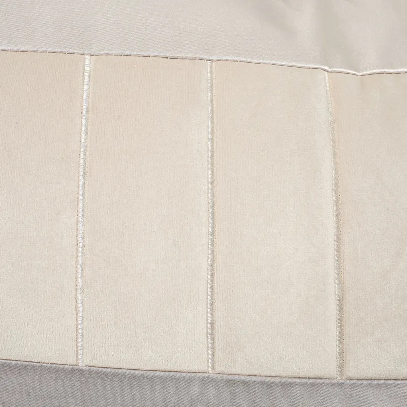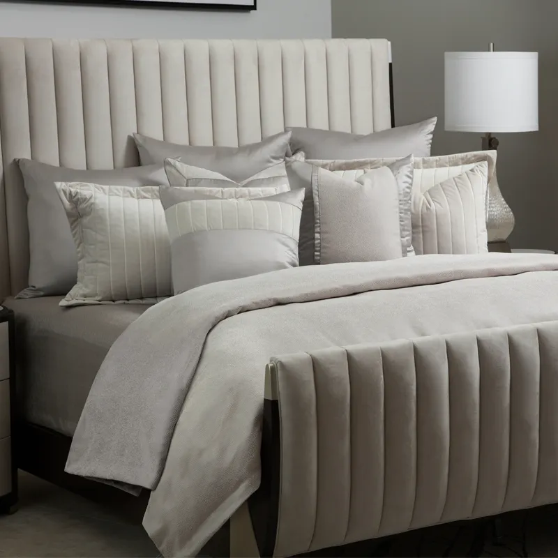 The Skylar comforter set delivers transitional beauty to any sophisticated bedroom! With a soft jacquard chenille texture and velvet channel-embroidered shams, this set is guaranteed to bring an upscale, modern ambiance to your elegant style. The comforter is designed with an invisible construction, creating a unique duvet look, and the oversized coordinating accessories add a custom feel to this bedding ensemble.