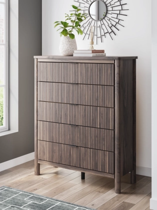 Crafted with both form and function in mind, this chest of drawers brings a dash of retro-cool character to your modern boho aesthetic. Reeded accents add an on-trend touch to its classic silhouette. Warmly welcoming with a rich brown finish, the piece pairs well with muted hues, earth tones and other neutrals alike. What a refined take on easygoing style.